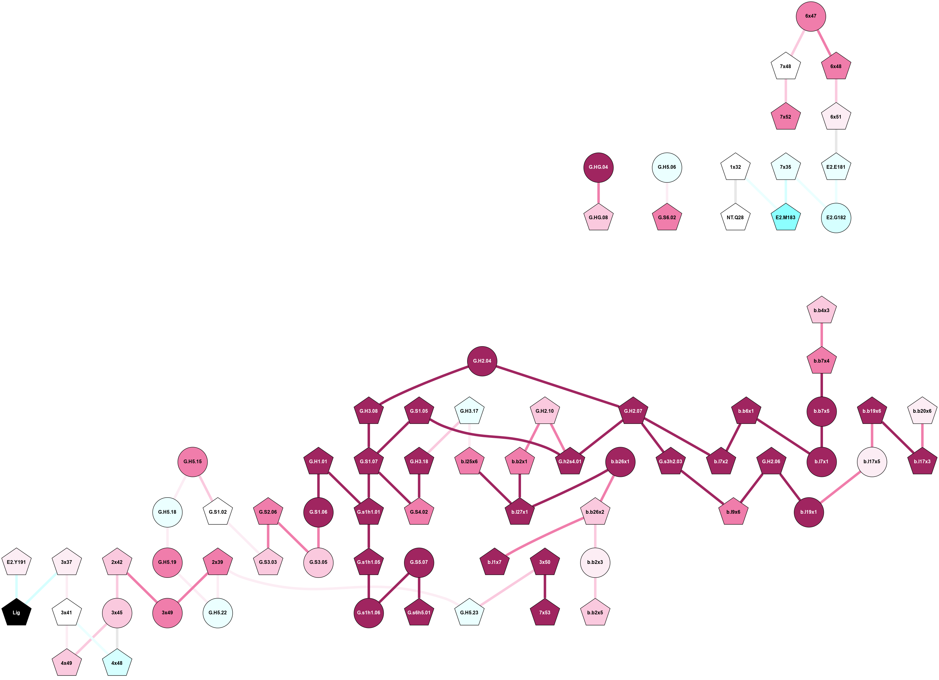Show 100.00 Single 6OYA All-trans-Retinal 6OYA-Rhodopsin-All-trans-Retinal-Gt/β1/γ1 Show 77.78 Consensus opsins_on_gp Orthosteric Ligand rhodopsin_on_gp opsin1lw_on_gp Show 77.78 Consensus rhodopsin_on Orthosteric Ligand 6OYA-Rhodopsin-All-trans-Retinal-Gt/β1/γ1 Show 77.78 Consensus sensory_on_gp Orthosteric Ligand opsins_on_gp Show 66.67 Consensus opsins_on Orthosteric Ligand rhodopsin_on opsin1lw_on Show 66.67 Consensus sensory_on Orthosteric Ligand opsins_on Show 63.64 Consensus sensory_offon Orthosteric Ligand sensory_off sensory_on Show 63.64 Consensus sensory_offon_gp Orthosteric Ligand sensory_on_gp sensory_on Show 60.00 Single 3PQR All-trans-Retinal 3PQR-Rhodopsin-All-trans-Retinal-Gt(CT) Show 60.00 Single 6FUF All-trans-Retinal 6FUF-Rhodopsin-All-trans-Retinal-Go Show 60.00 Single 7MT8 All-trans-Retinal 7MT8-Rhodopsin-All-trans-Retinal-GRK1 Show 60.00 Single 7MT9 All-trans-Retinal 7MT9-Rhodopsin-All-trans-Retinal-GRK1 Show 60.00 Single 7MTA All-trans-Retinal 7MTA-Rhodopsin-All-trans-Retinal-GRK1 Show 58.33 Single 1F88 11-cis-Retinal 1F88-Rhodopsin-11-cis-Retinal Show 57.14 Consensus ta1_on_gp Orthosteric Ligand 8W87-TA1-METH-chim(NtGi1L-Gs)/β1/γ2 8W89-TA1-PEA-chim(NtGi1L-Gs)/β1/γ2 8JLP-TA1-Ralmitaront-Gs/β1/γ2 8W8A-TA1-RO5256390-chim(NtGi1L-Gs)/β1/γ2 8W88-TA1-SEP-363856-Gs/β1/γ2 8JLO-TA1-Ulotaront-Gs/β1/γ2 8JLR-TA1-A77636-chim(NtGi1-Gs)/β1/γ2 8JSO-TA1-AMPH-chim(NtGi1-Gs)/β1/γ2 8ZSP-TA1-LSD-chim(NtGi1L-Gs-CtGq)/β1/γ2 Show 57.14 Consensus trace-amine_on_gp Orthosteric Ligand ta1_on_gp Show 55.56 Single 3PXO All-trans-Retinal 3PXO-Rhodopsin-All-trans-Retinal Show 55.56 Single 5DYS All-trans-Retinal 5DYS-Rhodopsin-All-trans-Retinal Show 53.85 Single 4X1H Nonyl-Beta-D-Glucopyranoside 4X1H-Rhodopsin-Nonyl-β-D-Glucopyranoside-Gt(CT) Show 53.85 Single 8FY8 5-MeO-DMT 8FY8-5-HT1A -5-MeO-DMT-Gi1/β1/γ1 Show 53.85 Single 8ZSS RO5263397 8ZSS-TA1-RO5263397-chim(NtGi1-Gs)/β1/γ2 Show 53.33 Single 7EXD Lasmiditan 7EXD-5-HT1F -Lasmiditan-Gi1/β1/γ2 Show 53.33 Consensus 5ht1f_on Orthosteric Ligand 7EXD-5-HT1F -Lasmiditan-Gi1/β1/γ2 Show 53.33 Consensus 5ht1f_on_gp Orthosteric Ligand 7EXD-5-HT1F -Lasmiditan-Gi1/β1/γ2 Show 50.00 Single 1GZM 11-cis-Retinal 1GZM-Rhodopsin-11-cis-Retinal Show 50.00 Single 2PED 9-cis-Retinal 2PED-Rhodopsin-9-cis-Retinal Show 50.00 Single 3C9L 11-cis-Retinal 3C9L-Rhodopsin-11-cis-Retinal Show 50.00 Single 7MTB All-trans-Retinal 7MTB-Rhodopsin-All-trans-Retinal-GRK1 Show 50.00 Single 9DYD Asenapine 9DYD-5-HT1A -Asenapine-Go/β1/γ2 Show 50.00 Single 9DYF Asenapine 9DYF-5-HT1A -Asenapine-Gi1/β1/γ2 Show 50.00 Consensus 5ht1_on Orthosteric Ligand 5ht1a_on 5ht1d_on 5ht1e_on 5ht1f_on Show 50.00 Consensus 5ht1_on_gp Orthosteric Ligand 5ht1a_on_gp 5ht1d_on_gp 5ht1e_on_gp 5ht1f_on_gp Show 50.00 Consensus 5ht1e_on_gp Orthosteric Ligand 7E33-5-HT1E -BRL-54443-Gi1/β1/γ2 8UGY-5-HT1E -Mianserin-Gi1/β1/γ1 8UH3-5-HT1E -Setiptiline-Gi1/β1/γ1 Show 50.00 Consensus ta1_on Orthosteric Ligand 8W87-TA1-METH-chim(NtGi1L-Gs)/β1/γ2 8W89-TA1-PEA-chim(NtGi1L-Gs)/β1/γ2 8JLP-TA1-Ralmitaront-Gs/β1/γ2 8W8A-TA1-RO5256390-chim(NtGi1L-Gs)/β1/γ2 8W88-TA1-SEP-363856-Gs/β1/γ2 8JLO-TA1-Ulotaront-Gs/β1/γ2 8JLR-TA1-A77636-chim(NtGi1-Gs)/β1/γ2 8JSO-TA1-AMPH-chim(NtGi1-Gs)/β1/γ2 8ZSP-TA1-LSD-chim(NtGi1L-Gs-CtGq)/β1/γ2 Show 50.00 Consensus trace-amine_on Orthosteric Ligand ta1_on Show 47.06 Single 8JLR A77636 8JLR-TA1-A77636-chim(NtGi1-Gs)/β1/γ2 Show 46.67 Single 2YDV NECA 2YDV-A2A -NECA Show 46.67 Single 4UHR CGS21680 4UHR-A2A -CGS21680 Show 46.67 Single 5A8E 7-Methylcyanopindolol 5A8E-β1 -7-Methylcyanopindolol-Na Show 46.67 Single 5G53 NECA 5G53-A2A -NECA-Gs Show 46.67 Single 5V54 Methiothepin 5V54-5-HT1B -Methiothepin Show 46.67 Single 6J21 Aprepitant 6J21-NK1 -Aprepitant Show 46.67 Single 7W6P N-pyridin-4-ylisoquinolin-4-amine 7W6P-α2a -N-pyridin-4-ylisoquinolin-4-amine-Go/β1/γ2 Show 46.67 Single 7W7E PubChem 164946676 7W7E-α2a -PubChem 164946676-Go/β1/γ2 Show 46.67 Consensus 5ht1_off Orthosteric Ligand 5ht1b_off Show 46.67 Consensus 5ht1b_off Orthosteric Ligand 5V54-5-HT1B -Methiothepin Show 46.67 Consensus 5ht_off Orthosteric Ligand 5ht2_off 5ht1_off Show 46.67 Consensus amine_on_gp Orthosteric Ligand 5ht_on_gp adrenergic_on_gp dopamine_on_gp histamine_on_gp muscarinic_on_gp trace-amine_on_gp Show 46.15 Single 2YDO Adenosine 2YDO-A2A -Adenosine Show 46.15 Single 3OAX 11-cis-Retinal 3OAX-Rhodopsin-11-cis-Retinal Show 46.15 Single 7F0T Dopamine 7F0T-D1 -Dopamine-Gs/β1/γ2 Show 46.15 Single 7F1Z Dopamine 7F1Z-D1 -Dopamine-GDP-Gs/β1/γ2 Show 46.15 Single 7ZBC 11-cis-Retinal 7ZBC-Rhodopsin-11-cis-Retinal Show 46.15 Single 7ZBE 11-cis-Retinal 7ZBE-Rhodopsin-11-cis-Retinal Show 46.15 Single 8FCZ 11-cis-Retinal 8FCZ-Rhodopsin-11-cis-Retinal Show 46.15 Single 8JSP Ulotaront 8JSP-5-HT1A -Ulotaront-Gi1/β1/γ2 Show 46.15 Single 8UHB RO5256390 8UHB-TA1-RO5256390-Gs/β1/γ2 Show 46.15 Single 8W88 SEP-363856 8W88-TA1-SEP-363856-Gs/β1/γ2 Show 46.15 Single 8W8B SEP-363856 8W8B-5-HT1A -SEP-363856-Gi1/β1/γ2 Show 46.15 Single 8WC8 ZH8651 8WC8-TA1-ZH8651-chim(NtGi1-Gs)/β1/γ2 Show 46.15 Single 8YN3 Histamine 8YN3-H2 -Histamine-Gs/β1/γ2 Show 46.15 Single 9EPQ 11,20-Ethanoretinal 9EPQ-Rhodopsin-11,20-Ethanoretinal-chim(Gi1-CtGq)/β1/γ2 Show 46.15 Consensus opsins_off Orthosteric Ligand rhodopsin_off Show 46.15 Consensus sensory_off Orthosteric Ligand opsins_off Show 45.45 Single 2J4Y 11-cis-Retinal 2J4Y-Rhodopsin-11-cis-Retinal Show 45.45 Single 5WKT Octyl-Beta-D-Glucopyranoside 5WKT-Rhodopsin-Octyl-β-D-Glucopyranoside-Gt(CT) Show 45.45 Single 7F23 Dopamine 7F23-D1 -Dopamine-GDP-Gs/β1/γ2 Show 45.45 Single 8IU2 Retinal 8IU2-Opsin1LW-Retinal-Gi1/β1/γ2 Show 45.45 Single 8Y63 C20:0 Ceramide 8Y63-FPR2-ALX-C20:0 Ceramide-Gi1/β1/γ2 Show 45.45 Consensus gi_opsins Orthosteric Ligand 8IU2-Opsin1LW-Retinal-Gi1/β1/γ2 Show 45.45 Consensus gi_sensory Orthosteric Ligand gi_opsins Show 45.45 Consensus opsin1lw_on Orthosteric Ligand 8IU2-Opsin1LW-Retinal-Gi1/β1/
