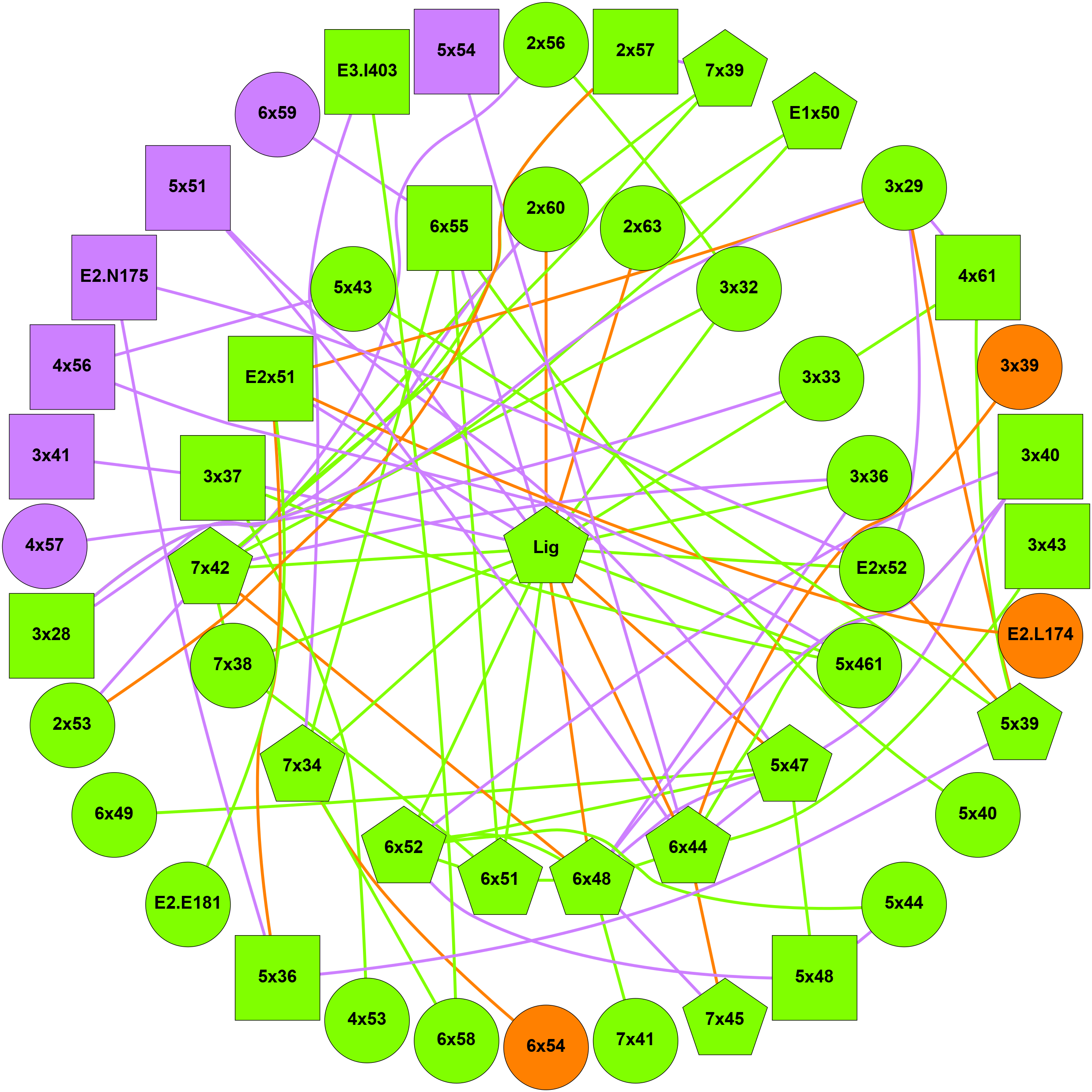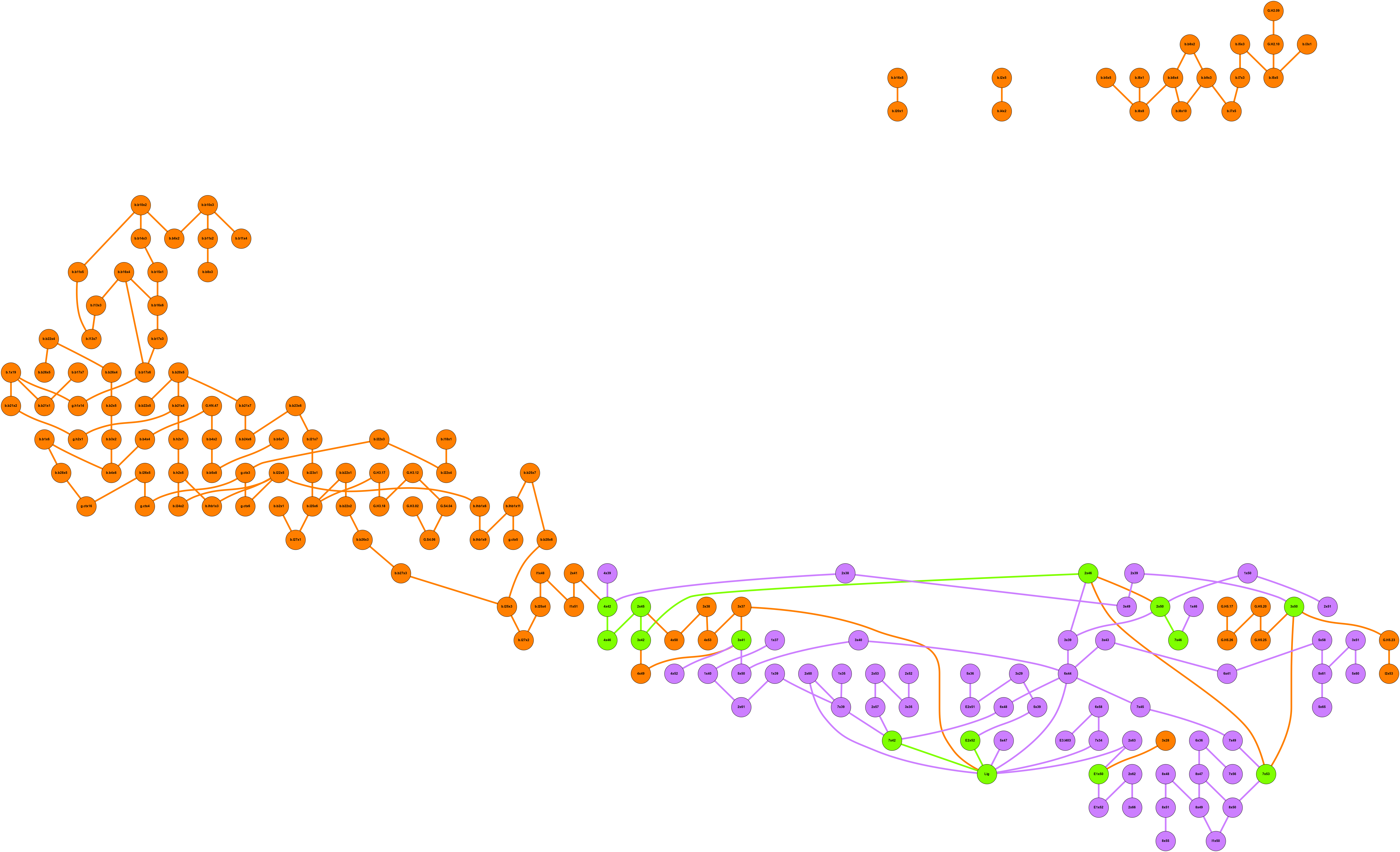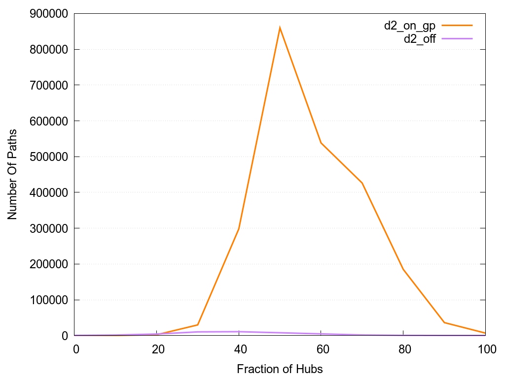 Orange: nodes, hubs and links specific of d2_on_gp network