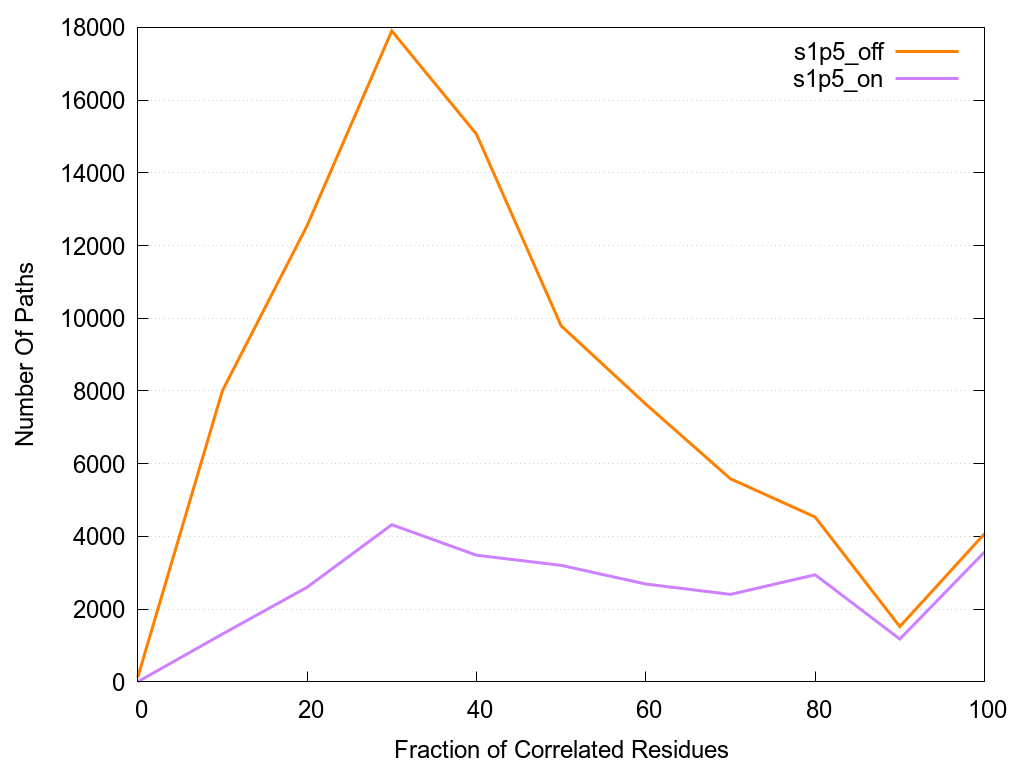 Here, those paths that begin and end at given residue pair(s) or that pass through a residue are used to generate a novel metapath. Such a path filtering is particularly recommended if some information on allosteric residues is available. The selection syntax for a residue pair ("Pairs") is C:C:c534,A:A:?600 (the lower-case "c" stands for cytosine and "?" indicates any non standard amino acid or nucleotide residue). Selection of more than one apical residue pair has the following syntax: C:C:c534,A:A:?600,C:C:c534,A:A:E41. Only one residue can be selected as a tail ("Tail"). For midway residue(s), each residue must be separated by a comma as well e.g. A:A:?600,A:A:E41.
