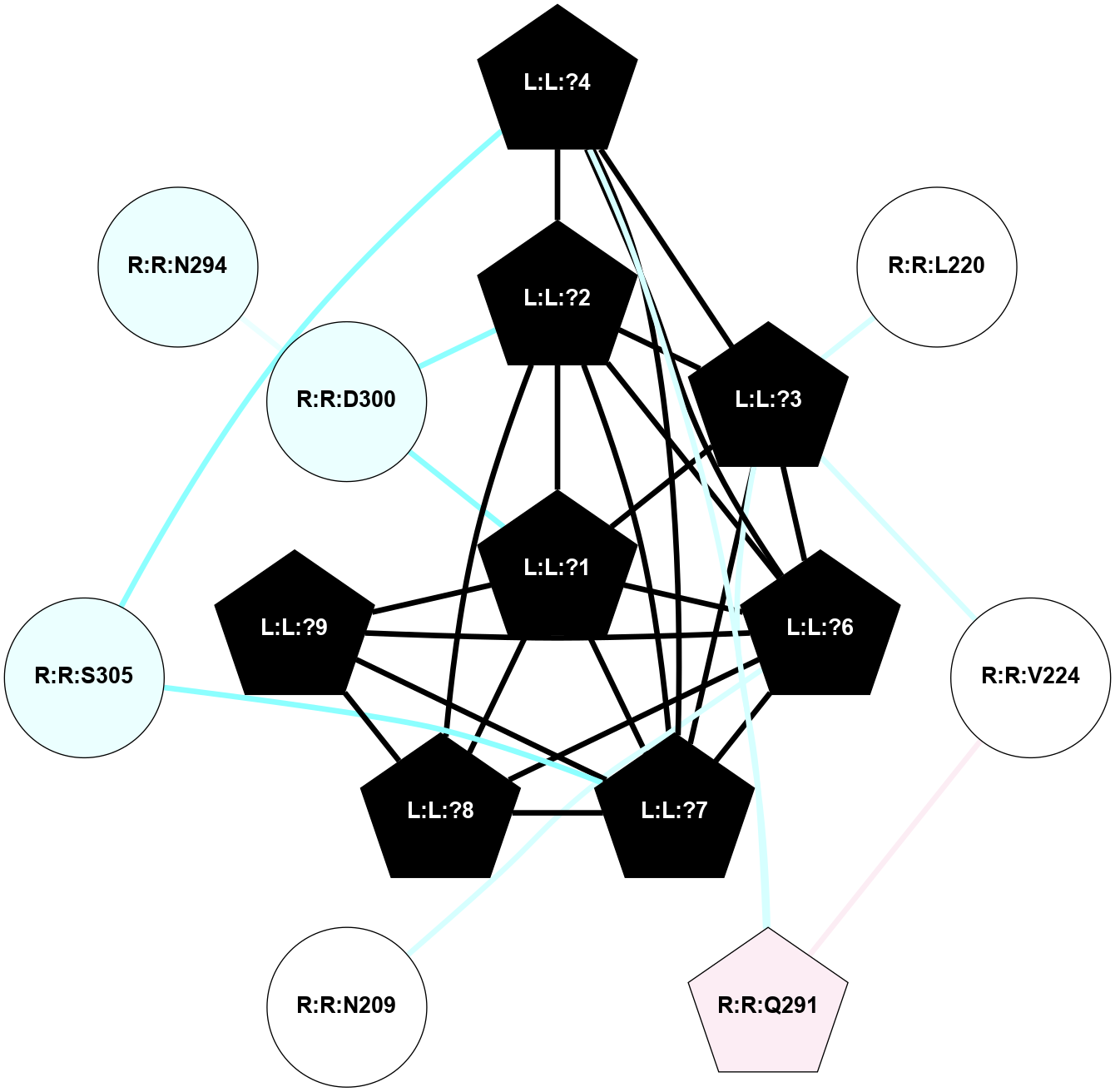 (Click to enlarge 🔍) | | Node1 | Node2 | LinkStrength | Comm | IsNode1Hub? | IsNode2Hub? | Node1Cons | Node2Cons | Node1Shell | Node2Shell | | I:I:?1 | L:L:?4 | 8.16 | 1 | Yes | Yes | 0 | 0 | 1 | 0 | | I:I:?1 | R:R:E94 | 7.31 | 1 | Yes | Yes | 0 | 5 | 1 | 1 | | I:I:?1 | R:R:D117 | 7.49 | 1 | Yes | Yes | 0 | 3 | 1 | 2 | | I:I:?1 | R:R:D121 | 9.98 | 1 | Yes | Yes | 0 | 4 | 1 | 1 | | L:L:?4 | L:L:H3 | 3.09 | 1 | Yes | Yes | 0 | 0 | 0 | 1 | | L:L:H3 | R:R:F45 | 5.66 | 1 | Yes | No | 0 | 7 | 1 | 2 | | L:L:H3 | R:R:T95 | 5.48 | 1 | Yes | No | 0 | 5 | 1 | 2 | | L:L:H3 | R:R:I98 | 5.3 | 1 | Yes | No | 0 | 4 | 1 | 2 | | L:L:?4 | L:L:R5 | 5.84 | 1 | Yes | Yes | 0 | 0 | 0 | 1 | | L:L:?4 | L:L:W6 | 3.65 | 1 | Yes | Yes | 0 | 0 | 0 | 1 | | L:L:?4 | R:R:E94 | 4.25 | 1 | Yes | Yes | 0 | 5 | 0 | 1 | | L:L:?4 | R:R:D121 | 7.62 | 1 | Yes | Yes | 0 | 4 | 0 | 1 | | L:L:?4 | R:R:I124 | 9.15 | 1 | Yes | No | 0 | 4 | 0 | 1 | | L:L:?4 | R:R:F258 | 5.86 | 1 | Yes | No | 0 | 5 | 0 | 1 | | L:L:?4 | R:R:L285 | 4.44 | 1 | Yes | No | 0 | 3 | 0 | 1 | | L:L:R5 | L:L:W6 | 17.99 | 1 | Yes | Yes | 0 | 0 | 1 | 1 | | L:L:R5 | R:R:N118 | 4.82 | 1 | Yes | No | 0 | 4 | 1 | 2 | | L:L:R5 | R:R:D121 | 13.1 | 1 | Yes | Yes | 0 | 4 | 1 | 1 | | L:L:R5 | R:R:I180 | 8.77 | 1 | Yes | Yes | 0 | 5 | 1 | 2 | | L:L:R5 | R:R:S183 | 9.22 | 1 | Yes | No | 0 | 5 | 1 | 2 | | L:L:W6 | R:R:V188 | 3.68 | 1 | Yes | No | 0 | 5 | 1 | 2 | | L:L:W6 | R:R:I189 | 9.4 | 1 | Yes | No | 0 | 6 | 1 | 2 | | R:R:F45 | R:R:T95 | 6.49 | 1 | No | No | 7 | 5 | 2 | 2 | | R:R:I124 | R:R:S90 | 7.74 | 0 | No | No | 4 | 5 | 1 | 2 | | R:R:I124 | R:R:N91 | 2.83 | 0 | No | No | 4 | 6 | 1 | 2 | | R:R:D117 | R:R:E94 | 3.9 | 1 | Yes | Yes | 3 | 5 | 2 | 1 | | R:R:E94 | R:R:F120 | 8.16 | 1 | Yes | No | 5 | 5 | 1 | 2 | | R:R:D121 | R:R:E94 | 6.5 | 1 | Yes | Yes | 4 | 5 | 1 | 1 | | R:R:D117 | R:R:D121 | 10.65 | 1 | Yes | Yes | 3 | 4 | 2 | 1 | | R:R:I180 | R:R:N118 | 2.83 | 1 | Yes | No | 5 | 4 | 2 | 2 | | R:R:I189 | R:R:L262 | 4.28 | 0 | No | Yes | 6 | 5 | 2 | 2 | | R:R:F258 | R:R:L262 | 6.09 | 0 | No | Yes | 5 | 5 | 1 | 2 | | R:R:F258 | R:R:F281 | 5.36 | 0 | No | Yes | 5 | 3 | 1 | 2 | | R:R:F281 | R:R:L285 | 4.87 | 0 | Yes | No | 3 | 3 | 2 | 1 | |