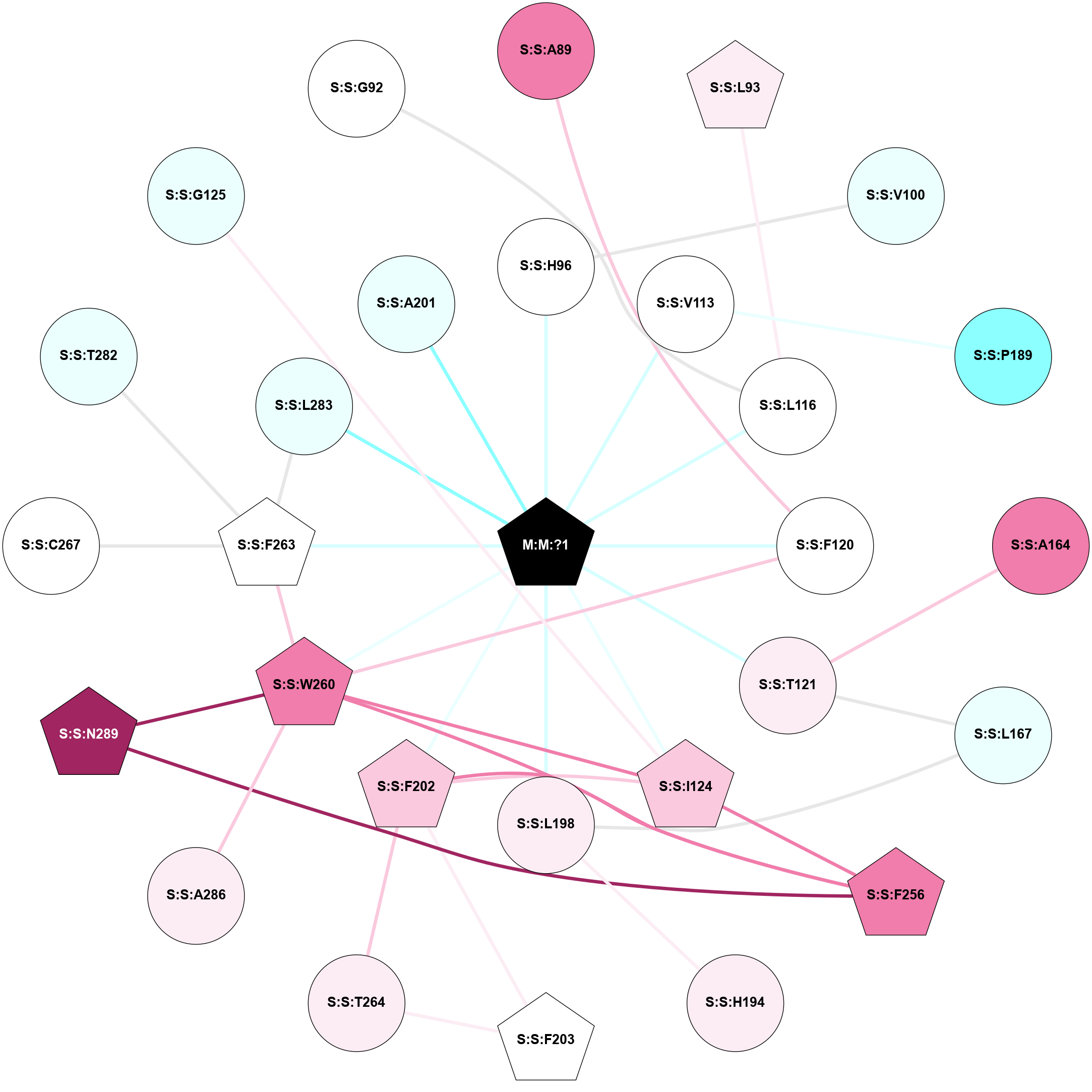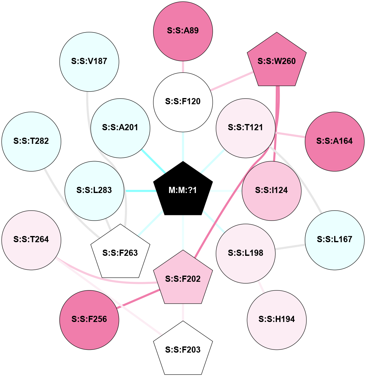 (Click to enlarge 🔍) | | Node1 | Node2 | LinkStrength | Comm | IsNode1Hub? | IsNode2Hub? | Node1Cons | Node2Cons | Node1Shell | Node2Shell | | M:M:?1 | S:S:F120 | 8.35 | 2 | Yes | No | 0 | 5 | 0 | 1 | | M:M:?1 | S:S:T121 | 7.86 | 2 | Yes | No | 0 | 6 | 0 | 1 | | M:M:?1 | S:S:I124 | 8.7 | 2 | Yes | No | 0 | 7 | 0 | 1 | | M:M:?1 | S:S:L198 | 3.16 | 2 | Yes | No | 0 | 6 | 0 | 1 | | M:M:?1 | S:S:F202 | 3.71 | 2 | Yes | Yes | 0 | 7 | 0 | 1 | | M:M:?1 | S:S:F263 | 2.78 | 2 | Yes | Yes | 0 | 5 | 0 | 1 | | M:M:?1 | S:S:L283 | 6.33 | 2 | Yes | No | 0 | 4 | 0 | 1 | | S:S:A89 | S:S:F120 | 2.77 | 0 | No | No | 8 | 5 | 2 | 1 | | S:S:F120 | S:S:W260 | 8.02 | 0 | No | Yes | 5 | 8 | 1 | 2 | | S:S:A164 | S:S:T121 | 3.36 | 0 | No | No | 8 | 6 | 2 | 1 | | S:S:L167 | S:S:T121 | 2.95 | 0 | No | No | 4 | 6 | 2 | 1 | | S:S:I124 | S:S:W260 | 11.74 | 0 | No | Yes | 7 | 8 | 1 | 2 | | S:S:L167 | S:S:L198 | 2.77 | 0 | No | No | 4 | 6 | 2 | 1 | | S:S:H194 | S:S:L198 | 6.43 | 0 | No | No | 6 | 6 | 2 | 1 | | S:S:F202 | S:S:F203 | 5.36 | 2 | Yes | Yes | 7 | 5 | 1 | 2 | | S:S:F202 | S:S:F256 | 5.36 | 2 | Yes | No | 7 | 8 | 1 | 2 | | S:S:F202 | S:S:W260 | 5.01 | 2 | Yes | Yes | 7 | 8 | 1 | 2 | | S:S:F202 | S:S:T264 | 14.27 | 2 | Yes | No | 7 | 6 | 1 | 2 | | S:S:F203 | S:S:T264 | 5.19 | 2 | Yes | No | 5 | 6 | 2 | 2 | | S:S:F263 | S:S:T282 | 3.89 | 2 | Yes | No | 5 | 4 | 1 | 2 | | S:S:F263 | S:S:L283 | 8.53 | 2 | Yes | No | 5 | 4 | 1 | 1 | | S:S:F263 | S:S:V187 | 2.62 | 2 | Yes | No | 5 | 4 | 1 | 2 | | M:M:?1 | S:S:A201 | 1.2 | 2 | Yes | No | 0 | 4 | 0 | 1 | |