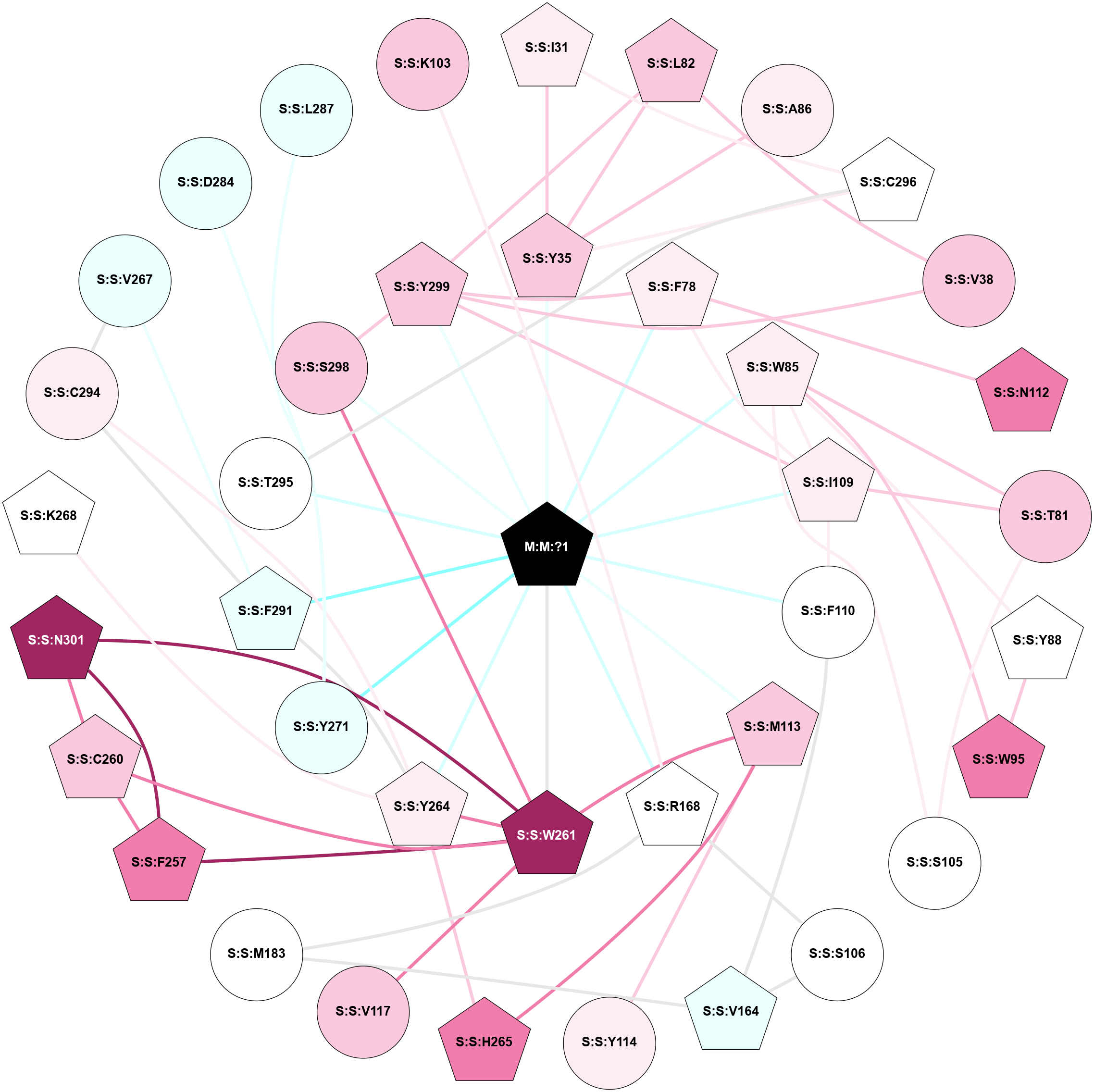 (Click to enlarge 🔍) | | Node1 | Node2 | LinkStrength | Comm | IsNode1Hub? | IsNode2Hub? | Node1Cons | Node2Cons | Node1Shell | Node2Shell | | S:S:I31 | S:S:Y35 | 7.25 | 3 | Yes | Yes | 6 | 7 | 2 | 1 | | S:S:C296 | S:S:I31 | 1.64 | 3 | Yes | Yes | 5 | 6 | 2 | 2 | | S:S:L82 | S:S:Y35 | 4.69 | 3 | Yes | Yes | 7 | 7 | 2 | 1 | | S:S:A86 | S:S:Y35 | 2.67 | 0 | No | Yes | 6 | 7 | 2 | 1 | | S:S:C296 | S:S:Y35 | 5.38 | 3 | Yes | Yes | 5 | 7 | 2 | 1 | | M:M:?1 | S:S:Y35 | 1.69 | 3 | Yes | Yes | 0 | 7 | 0 | 1 | | S:S:L82 | S:S:V38 | 1.49 | 3 | Yes | No | 7 | 7 | 2 | 2 | | S:S:V38 | S:S:Y299 | 3.79 | 3 | No | Yes | 7 | 7 | 2 | 1 | | S:S:F78 | S:S:I109 | 2.51 | 3 | Yes | Yes | 6 | 6 | 1 | 1 | | S:S:F78 | S:S:N112 | 8.46 | 3 | Yes | Yes | 6 | 8 | 1 | 2 | | S:S:F78 | S:S:Y299 | 13.41 | 3 | Yes | Yes | 6 | 7 | 1 | 1 | | M:M:?1 | S:S:F78 | 3.51 | 3 | Yes | Yes | 0 | 6 | 0 | 1 | | S:S:T81 | S:S:W85 | 3.64 | 3 | No | Yes | 7 | 6 | 2 | 1 | | S:S:S105 | S:S:T81 | 4.8 | 3 | No | No | 5 | 7 | 2 | 2 | | S:S:I109 | S:S:T81 | 3.04 | 3 | Yes | No | 6 | 7 | 1 | 2 | | S:S:L82 | S:S:Y299 | 11.72 | 3 | Yes | Yes | 7 | 7 | 2 | 1 | | S:S:W85 | S:S:Y88 | 3.86 | 3 | Yes | Yes | 6 | 5 | 1 | 2 | | S:S:W85 | S:S:W95 | 10.31 | 3 | Yes | Yes | 6 | 8 | 1 | 2 | | S:S:S105 | S:S:W85 | 3.71 | 3 | No | Yes | 5 | 6 | 2 | 1 | | S:S:I109 | S:S:W85 | 2.35 | 3 | Yes | Yes | 6 | 6 | 1 | 1 | | M:M:?1 | S:S:W85 | 5.74 | 3 | Yes | Yes | 0 | 6 | 0 | 1 | | S:S:W95 | S:S:Y88 | 6.75 | 3 | Yes | Yes | 8 | 5 | 2 | 2 | | S:S:S106 | S:S:V164 | 3.23 | 0 | No | Yes | 5 | 4 | 2 | 2 | | S:S:R168 | S:S:S106 | 11.86 | 0 | Yes | No | 5 | 5 | 1 | 2 | | S:S:F110 | S:S:I109 | 2.51 | 3 | No | Yes | 5 | 6 | 1 | 1 | | S:S:I109 | S:S:Y299 | 2.42 | 3 | Yes | Yes | 6 | 7 | 1 | 1 | | M:M:?1 | S:S:I109 | 8.22 | 3 | Yes | Yes | 0 | 6 | 0 | 1 | | S:S:F110 | S:S:V164 | 7.87 | 3 | No | Yes | 5 | 4 | 1 | 2 | | M:M:?1 | S:S:F110 | 8.77 | 3 | Yes | No | 0 | 5 | 0 | 1 | | S:S:M113 | S:S:Y114 | 8.38 | 3 | Yes | No | 7 | 6 | 1 | 2 | | S:S:M113 | S:S:W261 | 3.49 | 3 | Yes | Yes | 7 | 9 | 1 | 1 | | S:S:H265 | S:S:M113 | 2.63 | 0 | Yes | Yes | 8 | 7 | 2 | 1 | | M:M:?1 | S:S:M113 | 3.05 | 3 | Yes | Yes | 0 | 7 | 0 | 1 | | S:S:V117 | S:S:W261 | 3.68 | 0 | No | Yes | 7 | 9 | 2 | 1 | | S:S:M183 | S:S:V164 | 3.04 | 0 | No | Yes | 5 | 4 | 2 | 2 | | S:S:M183 | S:S:R168 | 6.2 | 0 | No | Yes | 5 | 5 | 2 | 1 | | M:M:?1 | S:S:R168 | 4.37 | 3 | Yes | Yes | 0 | 5 | 0 | 1 | | S:S:C260 | S:S:F257 | 4.19 | 3 | Yes | Yes | 7 | 8 | 2 | 2 | | S:S:F257 | S:S:W261 | 6.01 | 3 | Yes | Yes | 8 | 9 | 2 | 1 | | S:S:F257 | S:S:N301 | 2.42 | 3 | Yes | Yes | 8 | 9 | 2 | 2 | | S:S:C260 | S:S:W261 | 5.22 | 3 | Yes | Yes | 7 | 9 | 2 | 1 | | S:S:C260 | S:S:N301 | 6.3 | 3 | Yes | Yes | 7 | 9 | 2 | 2 | | S:S:W261 | S:S:Y264 | 2.89 | 3 | Yes | Yes | 9 | 6 | 1 | 1 | | S:S:S298 | S:S:W261 | 6.18 | 3 | No | Yes | 7 | 9 | 1 | 1 | | S:S:N301 | S:S:W261 | 3.39 | 3 | Yes | Yes | 9 | 9 | 2 | 1 | | M:M:?1 | S:S:W261 | 2.46 | 3 | Yes | Yes | 0 | 9 | 0 | 1 | | S:S:H265 | S:S:Y264 | 5.44 | 0 | Yes | Yes | 8 | 6 | 2 | 1 | | S:S:K268 | S:S:Y264 | 8.36 | 3 | Yes | Yes | 5 | 6 | 2 | 1 | | S:S:F291 | S:S:Y264 | 6.19 | 3 | Yes | Yes | 4 | 6 | 1 | 1 | | S:S:C294 | S:S:Y264 | 5.38 | 3 | No | Yes | 6 | 6 | 2 | 1 | | M:M:?1 | S:S:Y264 | 7.6 | 3 | Yes | Yes | 0 | 6 | 0 | 1 | | S:S:F291 | S:S:V267 | 2.62 | 3 | Yes | No | 4 | 4 | 1 | 2 | | S:S:C294 | S:S:V267 | 1.71 | 3 | No | No | 6 | 4 | 2 | 2 | | S:S:D284 | S:S:Y271 | 2.3 | 0 | No | No | 4 | 4 | 2 | 1 | | S:S:L287 | S:S:Y271 | 2.34 | 0 | No | No | 4 | 4 | 2 | 1 | | M:M:?1 | S:S:Y271 | 17.73 | 3 | Yes | No | 0 | 4 | 0 | 1 | | S:S:C294 | S:S:F291 | 2.79 | 3 | No | Yes | 6 | 4 | 2 | 1 | | M:M:?1 | S:S:F291 | 20.17 | 3 | Yes | Yes | 0 | 4 | 0 | 1 | | S:S:C296 | S:S:T295 | 1.69 | 3 | Yes | No | 5 | 5 | 2 | 1 | | M:M:?1 | S:S:T295 | 14.86 | 3 | Yes | No | 0 | 5 | 0 | 1 | | S:S:S298 | S:S:Y299 | 6.36 | 3 | No | Yes | 7 | 7 | 1 | 1 | | M:M:?1 | S:S:S298 | 2.16 | 3 | Yes | No | 0 | 7 | 0 | 1 | | M:M:?1 | S:S:Y299 | 5.06 | 3 | Yes | Yes | 0 | 7 | 0 | 1 | | S:S:K103 | S:S:R168 | 1.24 | 0 | No | Yes | 7 | 5 | 2 | 1 | |