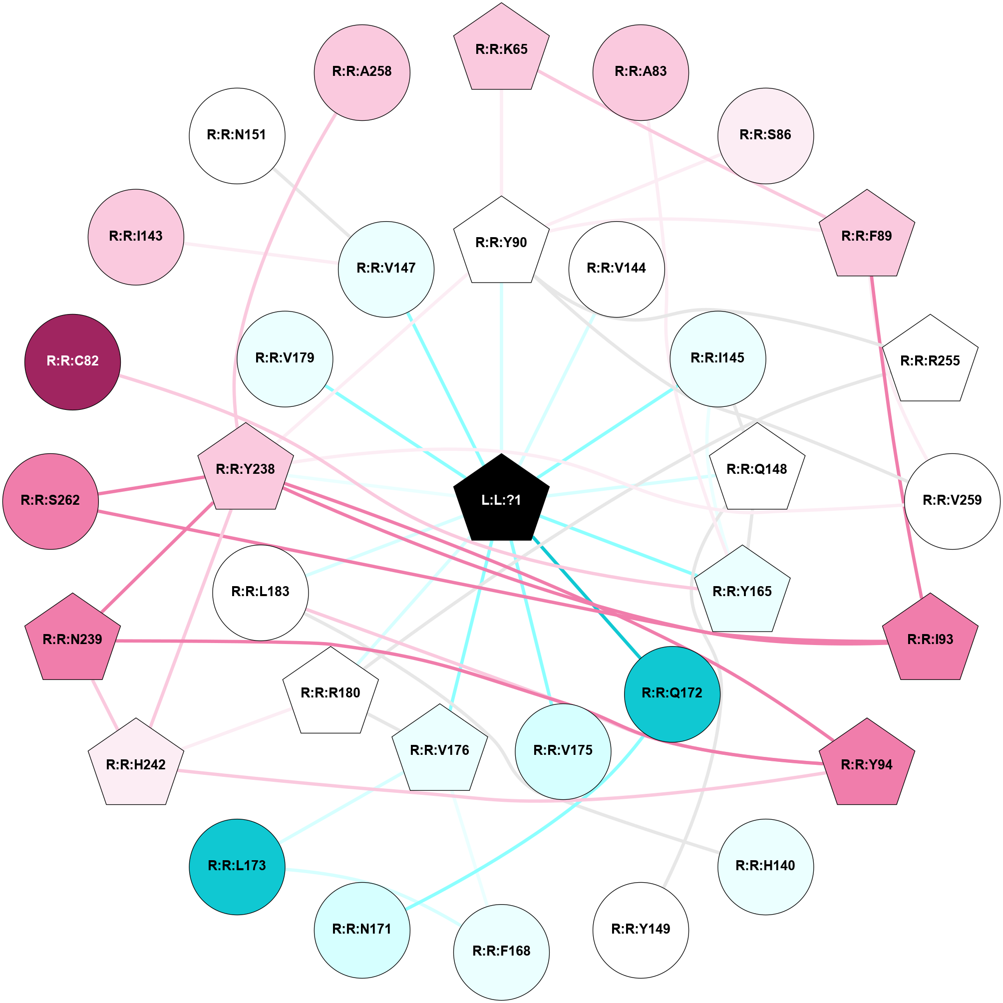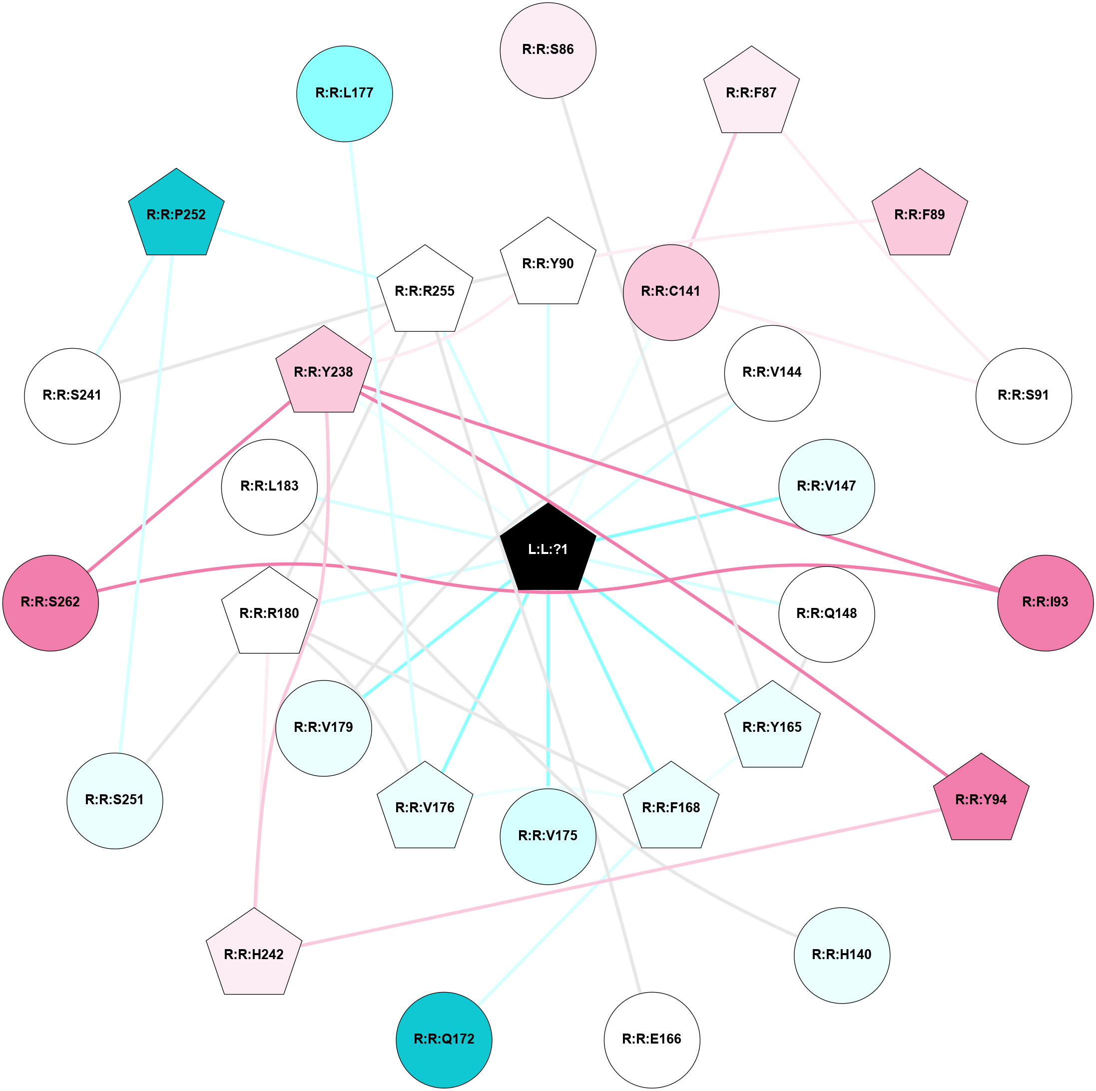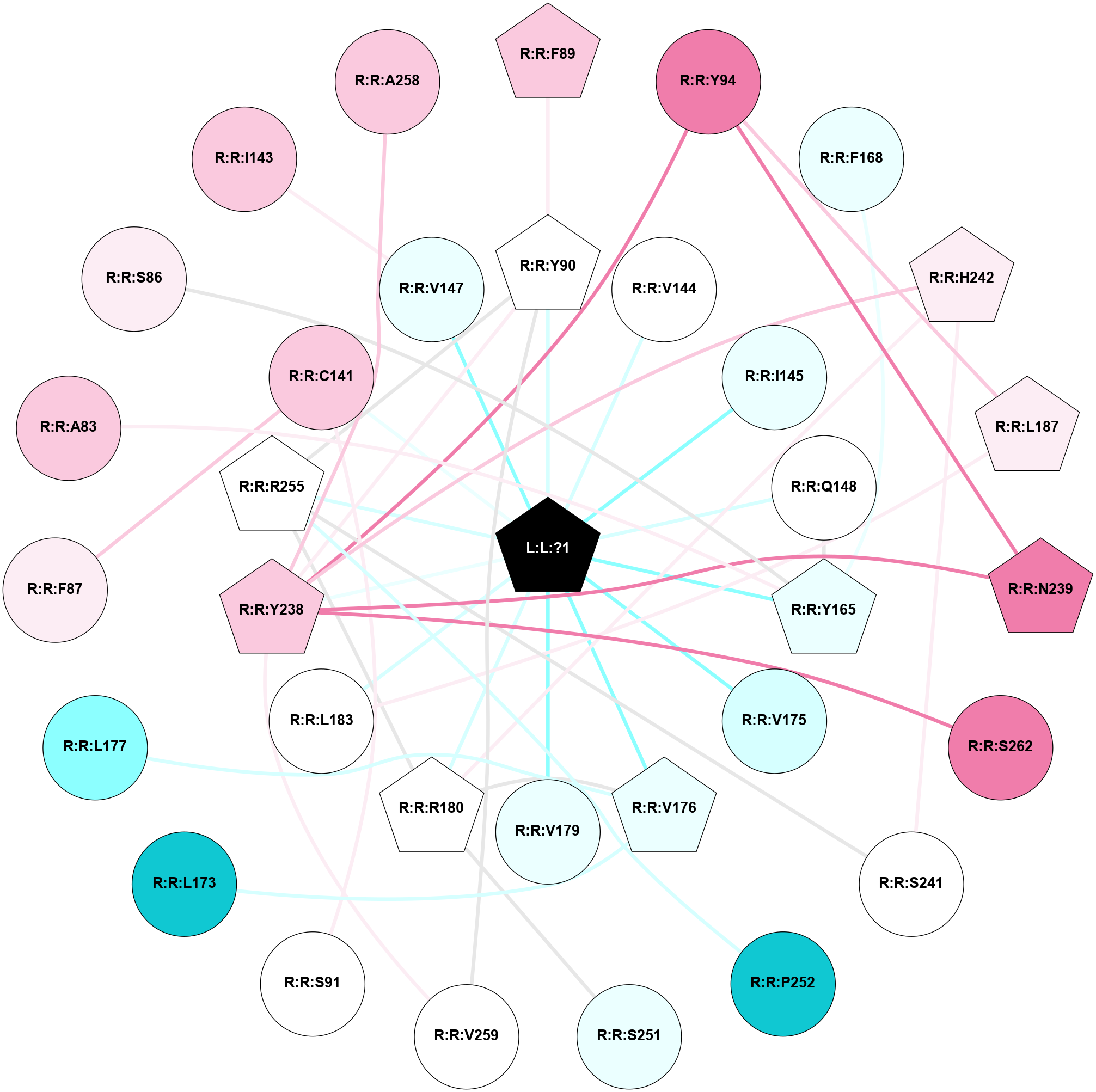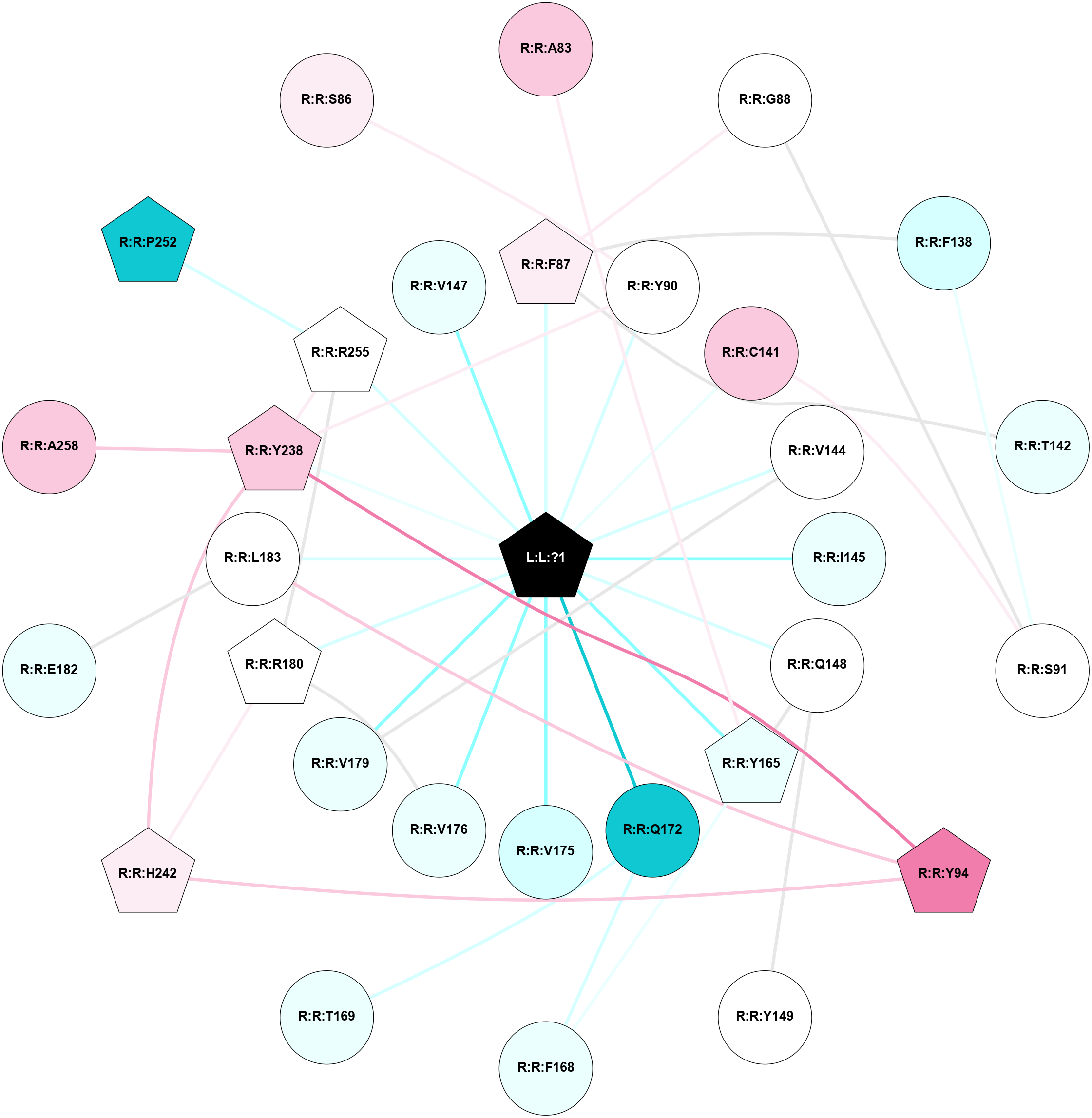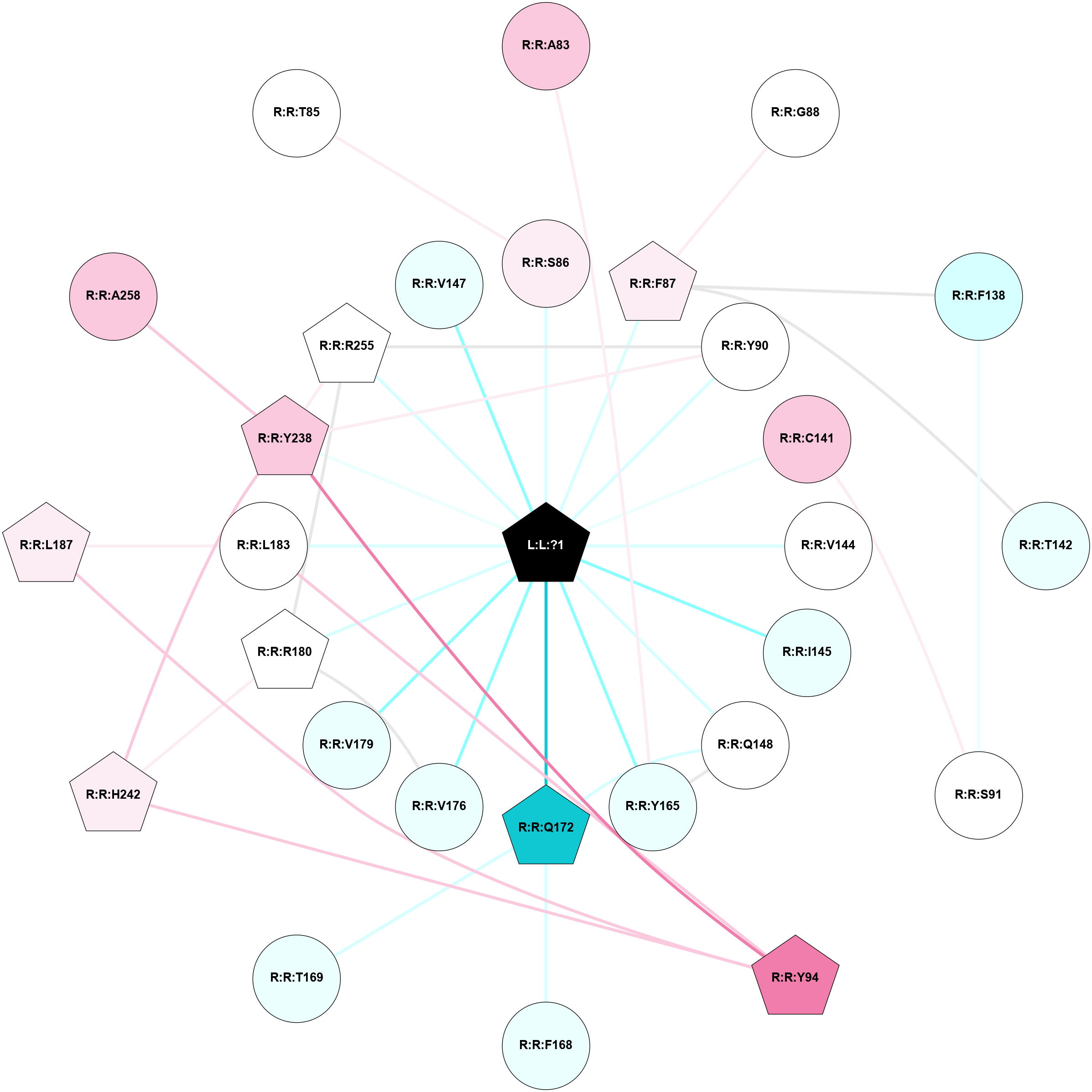 (Click to enlarge 🔍) | | Node1 | Node2 | LinkStrength | Comm | IsNode1Hub? | IsNode2Hub? | Node1Cons | Node2Cons | Node1Shell | Node2Shell | | L:L:?1 | R:R:S86 | 4.3 | 9 | Yes | No | 0 | 6 | 0 | 1 | | L:L:?1 | R:R:F87 | 4.36 | 9 | Yes | Yes | 0 | 6 | 0 | 1 | | L:L:?1 | R:R:Y90 | 24.34 | 9 | Yes | No | 0 | 5 | 0 | 1 | | L:L:?1 | R:R:C141 | 5.68 | 9 | Yes | No | 0 | 7 | 0 | 1 | | L:L:?1 | R:R:V144 | 11.73 | 9 | Yes | No | 0 | 5 | 0 | 1 | | L:L:?1 | R:R:I145 | 7.15 | 9 | Yes | No | 0 | 4 | 0 | 1 | | L:L:?1 | R:R:Q148 | 28.58 | 9 | Yes | No | 0 | 5 | 0 | 1 | | L:L:?1 | R:R:Y165 | 9.23 | 9 | Yes | No | 0 | 4 | 0 | 1 | | L:L:?1 | R:R:Q172 | 4.76 | 9 | Yes | Yes | 0 | 1 | 0 | 1 | | L:L:?1 | R:R:V176 | 10.66 | 9 | Yes | No | 0 | 4 | 0 | 1 | | L:L:?1 | R:R:V179 | 4.27 | 9 | Yes | No | 0 | 4 | 0 | 1 | | L:L:?1 | R:R:R180 | 9.57 | 9 | Yes | Yes | 0 | 5 | 0 | 1 | | L:L:?1 | R:R:L183 | 3.96 | 9 | Yes | No | 0 | 5 | 0 | 1 | | L:L:?1 | R:R:Y238 | 4.2 | 9 | Yes | Yes | 0 | 7 | 0 | 1 | | L:L:?1 | R:R:R255 | 3.48 | 9 | Yes | Yes | 0 | 5 | 0 | 1 | | R:R:A83 | R:R:Y165 | 4 | 0 | No | No | 7 | 4 | 2 | 1 | | R:R:F87 | R:R:G88 | 4.52 | 0 | Yes | No | 6 | 5 | 1 | 2 | | R:R:F138 | R:R:F87 | 3.22 | 0 | No | Yes | 3 | 6 | 2 | 1 | | R:R:F87 | R:R:T142 | 3.89 | 0 | Yes | No | 6 | 4 | 1 | 2 | | R:R:Y238 | R:R:Y90 | 10.92 | 9 | Yes | No | 7 | 5 | 1 | 1 | | R:R:R255 | R:R:Y90 | 10.29 | 9 | Yes | No | 5 | 5 | 1 | 1 | | R:R:F138 | R:R:S91 | 17.18 | 0 | No | No | 3 | 5 | 2 | 2 | | R:R:C141 | R:R:S91 | 5.16 | 0 | No | No | 7 | 5 | 1 | 2 | | R:R:L183 | R:R:Y94 | 5.86 | 9 | No | Yes | 5 | 8 | 1 | 2 | | R:R:L187 | R:R:Y94 | 10.55 | 9 | Yes | Yes | 6 | 8 | 2 | 2 | | R:R:Y238 | R:R:Y94 | 5.96 | 9 | Yes | Yes | 7 | 8 | 1 | 2 | | R:R:H242 | R:R:Y94 | 3.27 | 9 | Yes | Yes | 6 | 8 | 2 | 2 | | R:R:Q148 | R:R:Y165 | 9.02 | 9 | No | No | 5 | 4 | 1 | 1 | | R:R:Q148 | R:R:Q172 | 3.84 | 9 | No | Yes | 5 | 1 | 1 | 1 | | R:R:F168 | R:R:Q172 | 8.2 | 0 | No | Yes | 4 | 1 | 2 | 1 | | R:R:Q172 | R:R:T169 | 11.34 | 9 | Yes | No | 1 | 4 | 1 | 2 | | R:R:R180 | R:R:V176 | 6.54 | 9 | Yes | No | 5 | 4 | 1 | 1 | | R:R:H242 | R:R:R180 | 13.54 | 9 | Yes | Yes | 6 | 5 | 2 | 1 | | R:R:R180 | R:R:R255 | 15.99 | 9 | Yes | Yes | 5 | 5 | 1 | 1 | | R:R:L183 | R:R:L187 | 5.54 | 9 | No | Yes | 5 | 6 | 1 | 2 | | R:R:H242 | R:R:Y238 | 7.62 | 9 | Yes | Yes | 6 | 7 | 2 | 1 | | R:R:R255 | R:R:Y238 | 14.4 | 9 | Yes | Yes | 5 | 7 | 1 | 1 | | R:R:A258 | R:R:Y238 | 4 | 0 | No | Yes | 7 | 7 | 2 | 1 | | L:L:?1 | R:R:V147 | 2.13 | 9 | Yes | No | 0 | 4 | 0 | 1 | | R:R:S86 | R:R:T85 | 1.6 | 0 | No | No | 6 | 5 | 1 | 2 | |