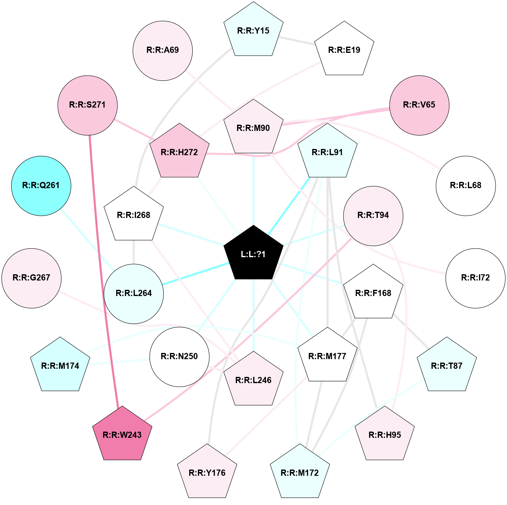 (Click to enlarge 🔍) | | Node1 | Node2 | LinkStrength | Comm | IsNode1Hub? | IsNode2Hub? | Node1Cons | Node2Cons | Node1Shell | Node2Shell | | L:L:?1 | R:R:T94 | 3.89 | 7 | Yes | No | 0 | 6 | 0 | 1 | | L:L:?1 | R:R:F168 | 31.36 | 7 | Yes | No | 0 | 5 | 0 | 1 | | L:L:?1 | R:R:L246 | 6.4 | 7 | Yes | No | 0 | 6 | 0 | 1 | | L:L:?1 | R:R:N250 | 6.35 | 7 | Yes | No | 0 | 5 | 0 | 1 | | L:L:?1 | R:R:I268 | 7.54 | 7 | Yes | No | 0 | 5 | 0 | 1 | | L:L:?1 | R:R:S271 | 3.97 | 7 | Yes | Yes | 0 | 7 | 0 | 1 | | L:L:?1 | R:R:H272 | 6.79 | 7 | Yes | Yes | 0 | 7 | 0 | 1 | | R:R:I268 | R:R:Y15 | 7.25 | 7 | No | Yes | 5 | 4 | 1 | 2 | | R:R:E19 | R:R:H272 | 11.08 | 0 | No | Yes | 5 | 7 | 2 | 1 | | R:R:T94 | R:R:V65 | 3.17 | 0 | No | Yes | 6 | 7 | 1 | 2 | | R:R:H272 | R:R:V65 | 4.15 | 7 | Yes | Yes | 7 | 7 | 1 | 2 | | R:R:F168 | R:R:T87 | 5.19 | 7 | No | Yes | 5 | 4 | 1 | 2 | | R:R:M172 | R:R:T87 | 3.01 | 7 | Yes | Yes | 4 | 4 | 2 | 2 | | R:R:T94 | R:R:W243 | 4.85 | 0 | No | Yes | 6 | 8 | 1 | 2 | | R:R:F168 | R:R:M172 | 9.95 | 7 | No | Yes | 5 | 4 | 1 | 2 | | R:R:M172 | R:R:M177 | 2.89 | 7 | Yes | No | 4 | 5 | 2 | 2 | | R:R:M174 | R:R:N250 | 4.21 | 0 | No | No | 3 | 5 | 2 | 1 | | R:R:M177 | R:R:N250 | 7.01 | 0 | No | No | 5 | 5 | 2 | 1 | | R:R:S271 | R:R:W243 | 3.71 | 7 | Yes | Yes | 7 | 8 | 1 | 2 | | R:R:L246 | R:R:S271 | 3 | 7 | No | Yes | 6 | 7 | 1 | 1 | | R:R:I268 | R:R:S271 | 3.1 | 7 | No | Yes | 5 | 7 | 1 | 1 | | R:R:H272 | R:R:S271 | 6.97 | 7 | Yes | Yes | 7 | 7 | 1 | 1 | | L:L:?1 | R:R:L91 | 2.74 | 7 | Yes | No | 0 | 4 | 0 | 1 | | L:L:?1 | R:R:L264 | 2.74 | 7 | Yes | No | 0 | 4 | 0 | 1 | | R:R:G267 | R:R:L246 | 1.71 | 0 | No | No | 6 | 6 | 2 | 1 | | R:R:L264 | R:R:Q261 | 1.33 | 0 | No | No | 4 | 2 | 1 | 2 | |