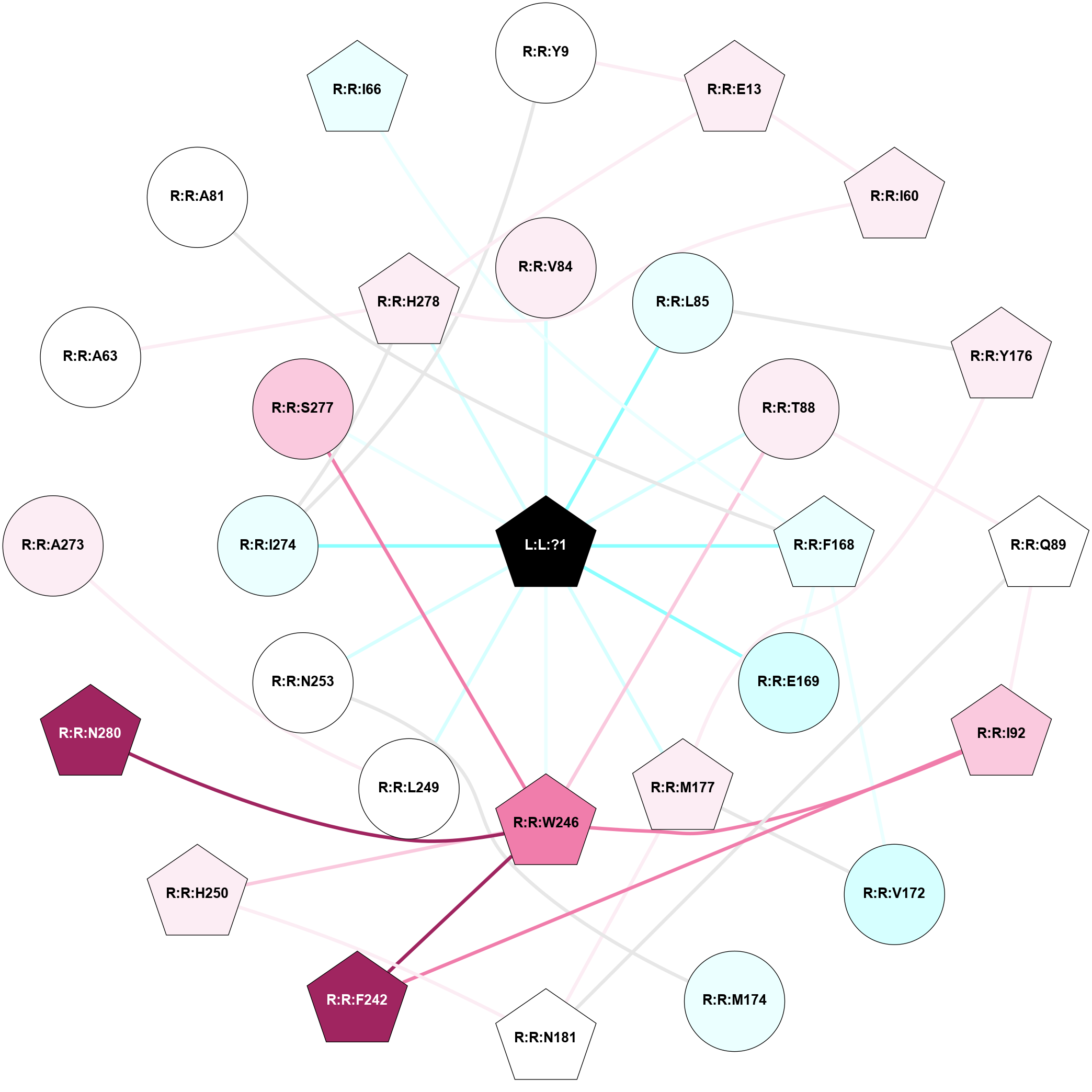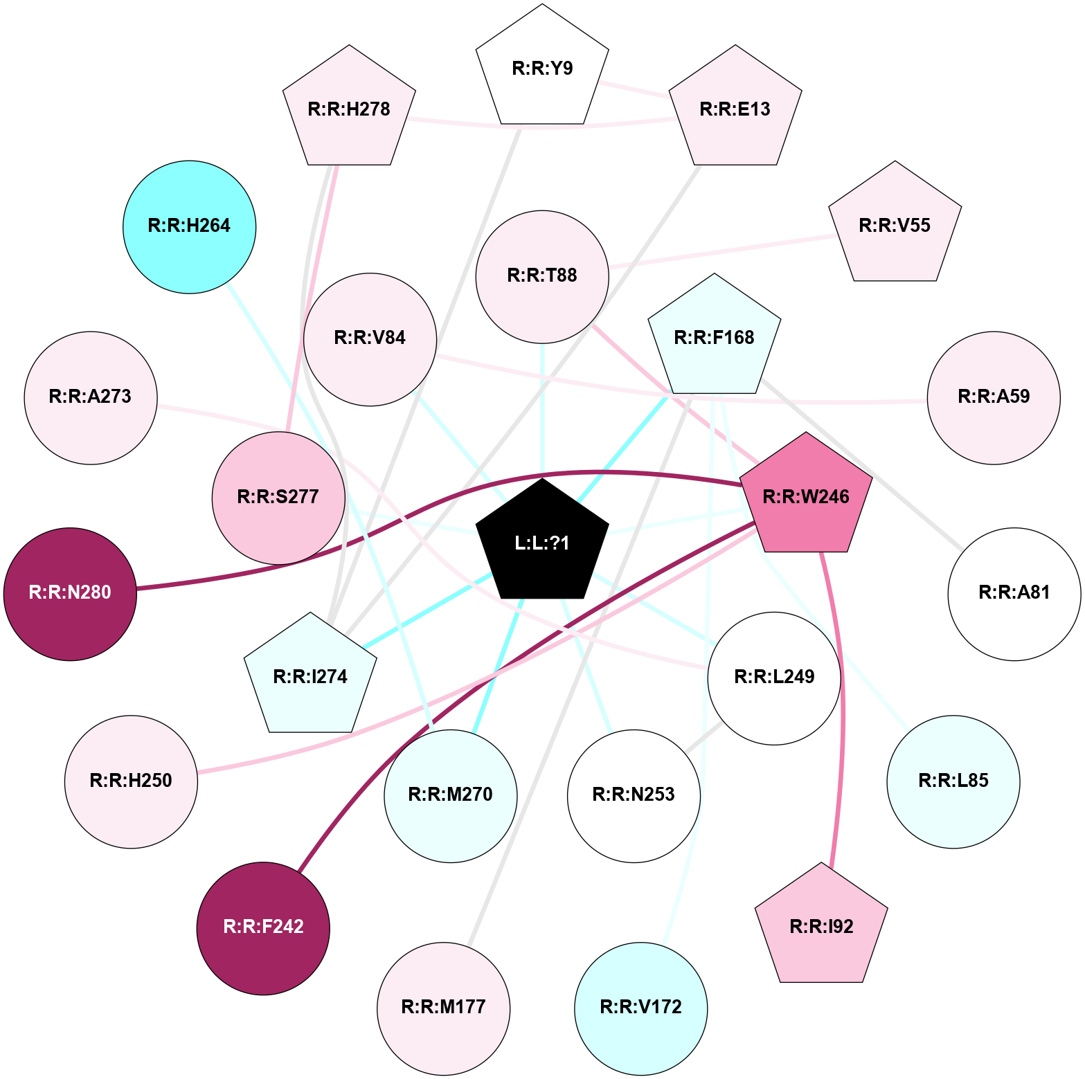(Click to enlarge 🔍) | | Node1 | Node2 | LinkStrength | Comm | IsNode1Hub? | IsNode2Hub? | Node1Cons | Node2Cons | Node1Shell | Node2Shell | | L:L:?1 | R:R:T88 | 3.89 | 3 | Yes | No | 0 | 6 | 0 | 1 | | L:L:?1 | R:R:F168 | 12.06 | 3 | Yes | Yes | 0 | 4 | 0 | 1 | | L:L:?1 | R:R:W246 | 6.02 | 3 | Yes | Yes | 0 | 8 | 0 | 1 | | L:L:?1 | R:R:L249 | 24.67 | 3 | Yes | No | 0 | 5 | 0 | 1 | | L:L:?1 | R:R:N253 | 7.25 | 3 | Yes | No | 0 | 5 | 0 | 1 | | L:L:?1 | R:R:M270 | 3.73 | 3 | Yes | No | 0 | 4 | 0 | 1 | | L:L:?1 | R:R:I274 | 11.31 | 3 | Yes | Yes | 0 | 4 | 0 | 1 | | L:L:?1 | R:R:S277 | 2.97 | 3 | Yes | No | 0 | 7 | 0 | 1 | | R:R:E13 | R:R:Y9 | 15.71 | 3 | Yes | Yes | 6 | 5 | 2 | 2 | | R:R:I274 | R:R:Y9 | 6.04 | 3 | Yes | Yes | 4 | 5 | 1 | 2 | | R:R:E13 | R:R:I274 | 4.1 | 3 | Yes | Yes | 6 | 4 | 2 | 1 | | R:R:E13 | R:R:H278 | 16 | 3 | Yes | Yes | 6 | 6 | 2 | 2 | | R:R:T88 | R:R:V55 | 3.17 | 3 | No | Yes | 6 | 6 | 1 | 2 | | R:R:A59 | R:R:V84 | 3.39 | 0 | No | No | 6 | 6 | 2 | 1 | | R:R:A81 | R:R:F168 | 4.16 | 0 | No | Yes | 5 | 4 | 2 | 1 | | R:R:F168 | R:R:L85 | 4.87 | 0 | Yes | No | 4 | 4 | 1 | 2 | | R:R:T88 | R:R:W246 | 4.85 | 3 | No | Yes | 6 | 8 | 1 | 1 | | R:R:I92 | R:R:W246 | 9.4 | 0 | Yes | Yes | 7 | 8 | 2 | 1 | | R:R:F168 | R:R:V172 | 15.73 | 0 | Yes | No | 4 | 3 | 1 | 2 | | R:R:F168 | R:R:M177 | 4.98 | 0 | Yes | No | 4 | 6 | 1 | 2 | | R:R:F242 | R:R:W246 | 5.01 | 0 | No | Yes | 9 | 8 | 2 | 1 | | R:R:H250 | R:R:W246 | 5.29 | 3 | No | Yes | 6 | 8 | 2 | 1 | | R:R:N280 | R:R:W246 | 12.43 | 0 | No | Yes | 9 | 8 | 2 | 1 | | R:R:L249 | R:R:N253 | 5.49 | 3 | No | No | 5 | 5 | 1 | 1 | | R:R:A273 | R:R:L249 | 3.15 | 0 | No | No | 6 | 5 | 2 | 1 | | R:R:H264 | R:R:M270 | 3.94 | 0 | No | No | 2 | 4 | 2 | 1 | | R:R:H278 | R:R:I274 | 3.98 | 3 | Yes | Yes | 6 | 4 | 2 | 1 | | R:R:H278 | R:R:S277 | 4.18 | 3 | Yes | No | 6 | 7 | 2 | 1 | | L:L:?1 | R:R:V84 | 1.97 | 3 | Yes | No | 0 | 6 | 0 | 1 | |