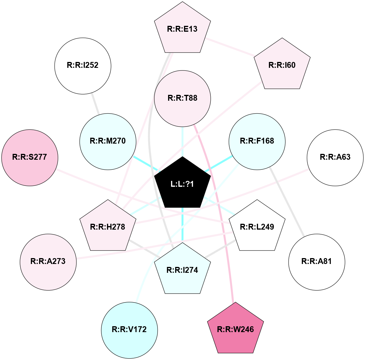 (Click to enlarge 🔍) | | Node1 | Node2 | LinkStrength | Comm | IsNode1Hub? | IsNode2Hub? | Node1Cons | Node2Cons | Node1Shell | Node2Shell | | L:L:?1 | R:R:T88 | 3.89 | 8 | Yes | No | 0 | 6 | 0 | 1 | | L:L:?1 | R:R:F168 | 24.93 | 8 | Yes | No | 0 | 4 | 0 | 1 | | L:L:?1 | R:R:L249 | 10.96 | 8 | Yes | Yes | 0 | 5 | 0 | 1 | | L:L:?1 | R:R:I274 | 13.19 | 8 | Yes | Yes | 0 | 4 | 0 | 1 | | L:L:?1 | R:R:H278 | 8.49 | 8 | Yes | Yes | 0 | 6 | 0 | 1 | | R:R:E13 | R:R:I60 | 4.1 | 8 | Yes | Yes | 6 | 6 | 2 | 2 | | R:R:E13 | R:R:I274 | 2.73 | 8 | Yes | Yes | 6 | 4 | 2 | 1 | | R:R:E13 | R:R:H278 | 8.62 | 8 | Yes | Yes | 6 | 6 | 2 | 1 | | R:R:H278 | R:R:I60 | 7.95 | 8 | Yes | Yes | 6 | 6 | 1 | 2 | | R:R:A63 | R:R:H278 | 2.93 | 0 | No | Yes | 5 | 6 | 2 | 1 | | R:R:A81 | R:R:F168 | 2.77 | 0 | No | No | 5 | 4 | 2 | 1 | | R:R:T88 | R:R:W246 | 4.85 | 0 | No | Yes | 6 | 8 | 1 | 2 | | R:R:F168 | R:R:V172 | 11.8 | 0 | No | No | 4 | 3 | 1 | 2 | | R:R:A273 | R:R:L249 | 4.73 | 0 | No | Yes | 6 | 5 | 2 | 1 | | R:R:I274 | R:R:L249 | 2.85 | 8 | Yes | Yes | 4 | 5 | 1 | 1 | | R:R:L249 | R:R:S277 | 4.5 | 8 | Yes | No | 5 | 7 | 1 | 2 | | R:R:I252 | R:R:M270 | 2.92 | 0 | No | No | 5 | 4 | 2 | 1 | | R:R:H278 | R:R:I274 | 5.3 | 8 | Yes | Yes | 6 | 4 | 1 | 1 | | L:L:?1 | R:R:M270 | 1.87 | 8 | Yes | No | 0 | 4 | 0 | 1 | |