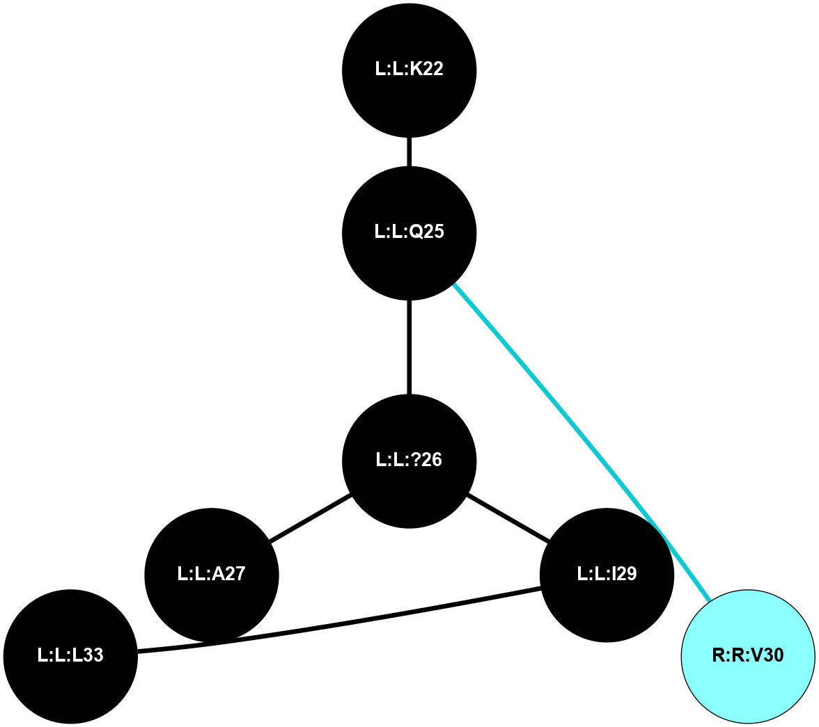 (Click to enlarge 🔍) | | Node1 | Node2 | LinkStrength | Comm | IsNode1Hub? | IsNode2Hub? | Node1Cons | Node2Cons | Node1Shell | Node2Shell | | L:L:K22 | L:L:Q25 | 4.07 | 0 | No | No | 0 | 0 | 2 | 1 | | L:L:?26 | L:L:Q25 | 5.1 | 0 | No | No | 0 | 0 | 0 | 1 | | L:L:Q25 | R:R:V30 | 8.6 | 0 | No | No | 0 | 2 | 1 | 2 | | L:L:?26 | L:L:I29 | 8.2 | 0 | No | No | 0 | 0 | 0 | 1 | | L:L:?26 | L:L:A27 | 3.02 | 0 | No | No | 0 | 0 | 0 | 1 | | L:L:I29 | L:L:L33 | 2.85 | 0 | No | No | 0 | 0 | 1 | 2 | |