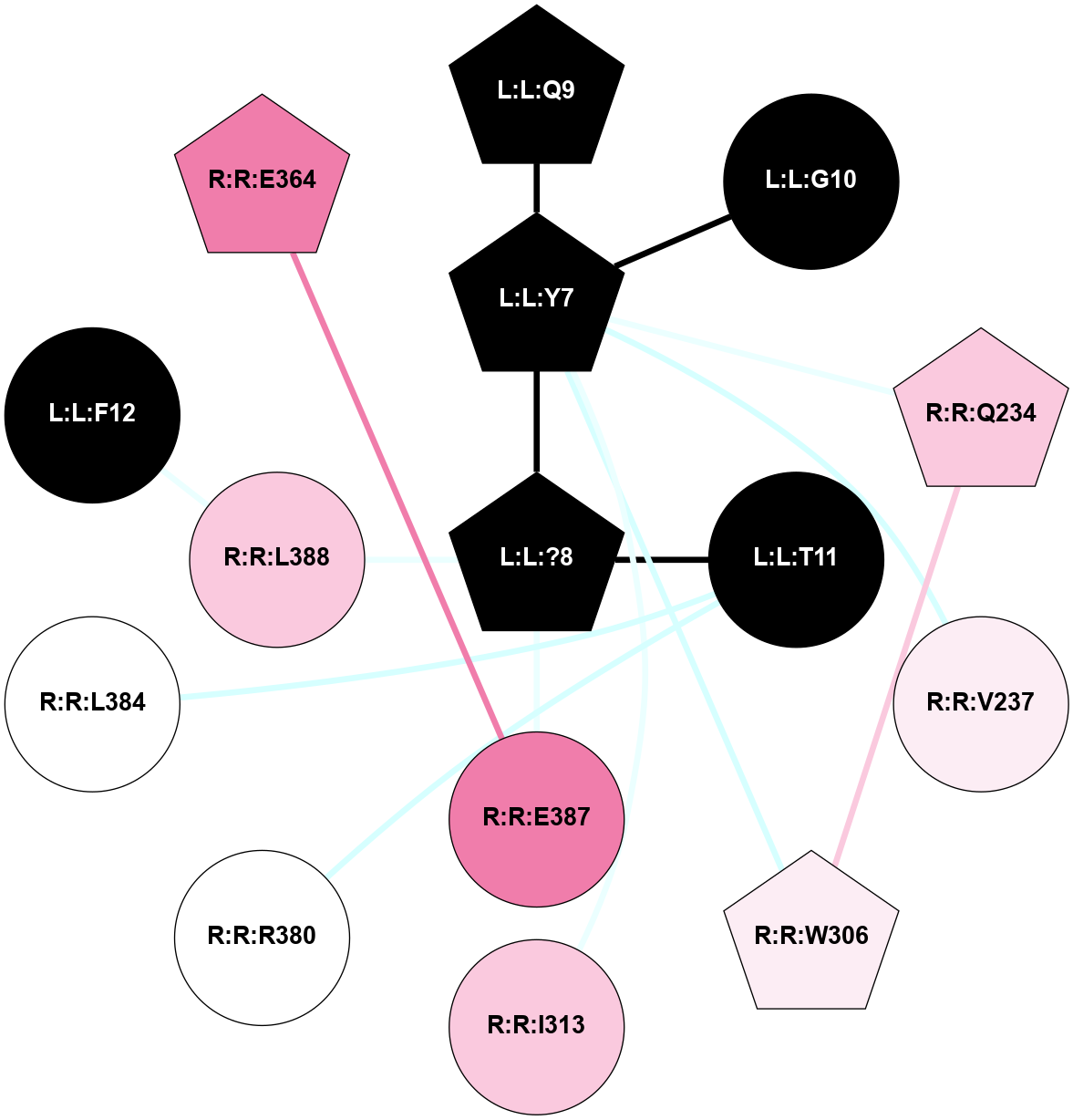 (Click to enlarge 🔍) | | Node1 | Node2 | LinkStrength | Comm | IsNode1Hub? | IsNode2Hub? | Node1Cons | Node2Cons | Node1Shell | Node2Shell | | L:L:?8 | L:L:Y7 | 3.37 | 0 | Yes | Yes | 0 | 0 | 0 | 1 | | L:L:Q9 | L:L:Y7 | 3.38 | 1 | Yes | Yes | 0 | 0 | 2 | 1 | | L:L:G10 | L:L:Y7 | 5.79 | 0 | No | Yes | 0 | 0 | 2 | 1 | | L:L:Y7 | R:R:Q234 | 13.53 | 1 | Yes | Yes | 0 | 7 | 1 | 2 | | L:L:Y7 | R:R:V237 | 23.97 | 1 | Yes | No | 0 | 6 | 1 | 2 | | L:L:Y7 | R:R:W306 | 4.82 | 1 | Yes | Yes | 0 | 6 | 1 | 2 | | L:L:Y7 | R:R:I313 | 4.84 | 1 | Yes | No | 0 | 7 | 1 | 2 | | L:L:?8 | L:L:T11 | 9.88 | 0 | Yes | No | 0 | 0 | 0 | 1 | | L:L:?8 | R:R:E387 | 17.77 | 0 | Yes | No | 0 | 8 | 0 | 1 | | L:L:?8 | R:R:L388 | 5.3 | 0 | Yes | No | 0 | 7 | 0 | 1 | | L:L:T11 | R:R:R380 | 3.88 | 0 | No | No | 0 | 5 | 1 | 2 | | L:L:T11 | R:R:L384 | 4.42 | 0 | No | No | 0 | 5 | 1 | 2 | | L:L:F12 | R:R:L388 | 4.87 | 0 | No | No | 0 | 7 | 2 | 1 | | R:R:Q234 | R:R:W306 | 4.38 | 1 | Yes | Yes | 7 | 6 | 2 | 2 | | R:R:E364 | R:R:E387 | 12.69 | 1 | Yes | No | 8 | 8 | 2 | 1 | |