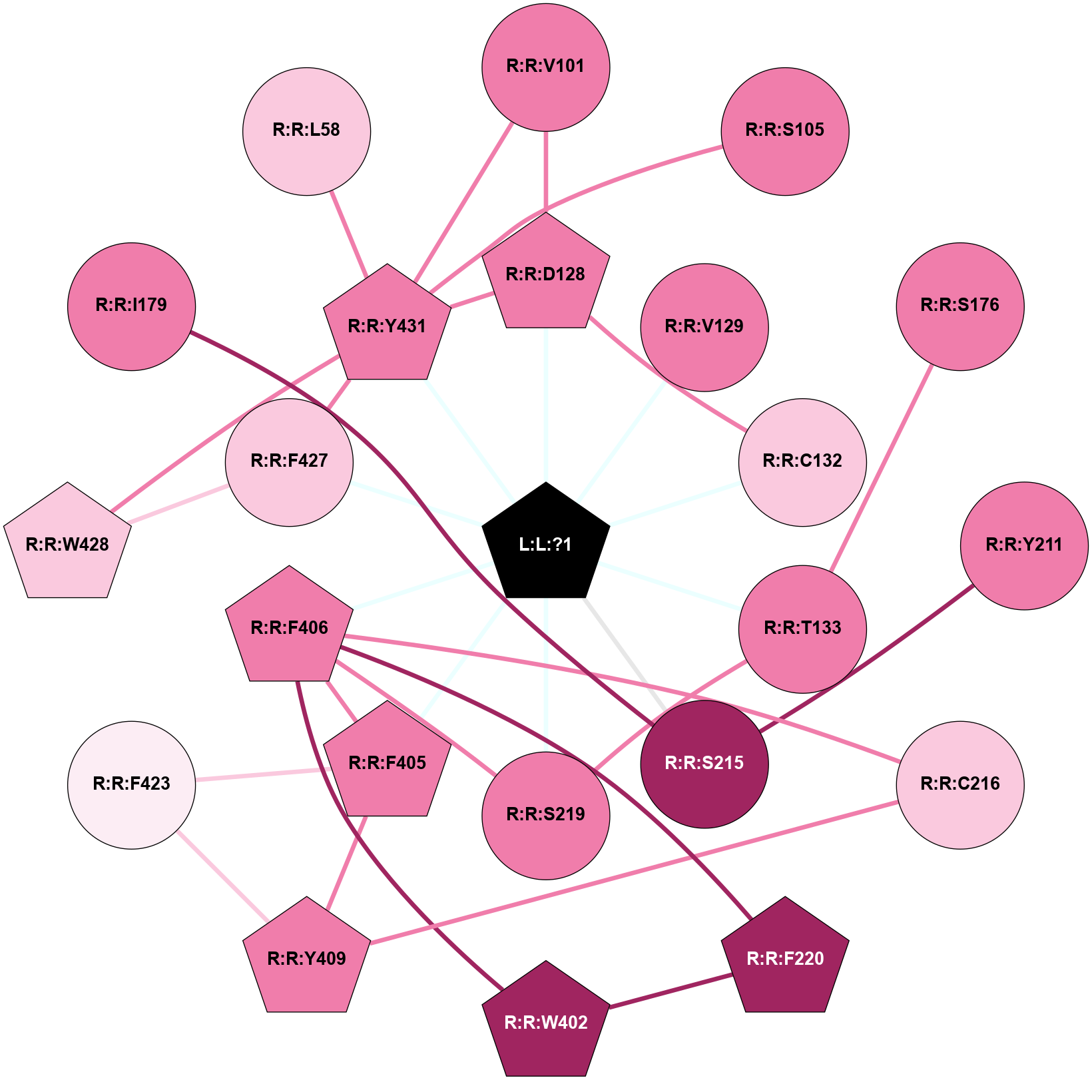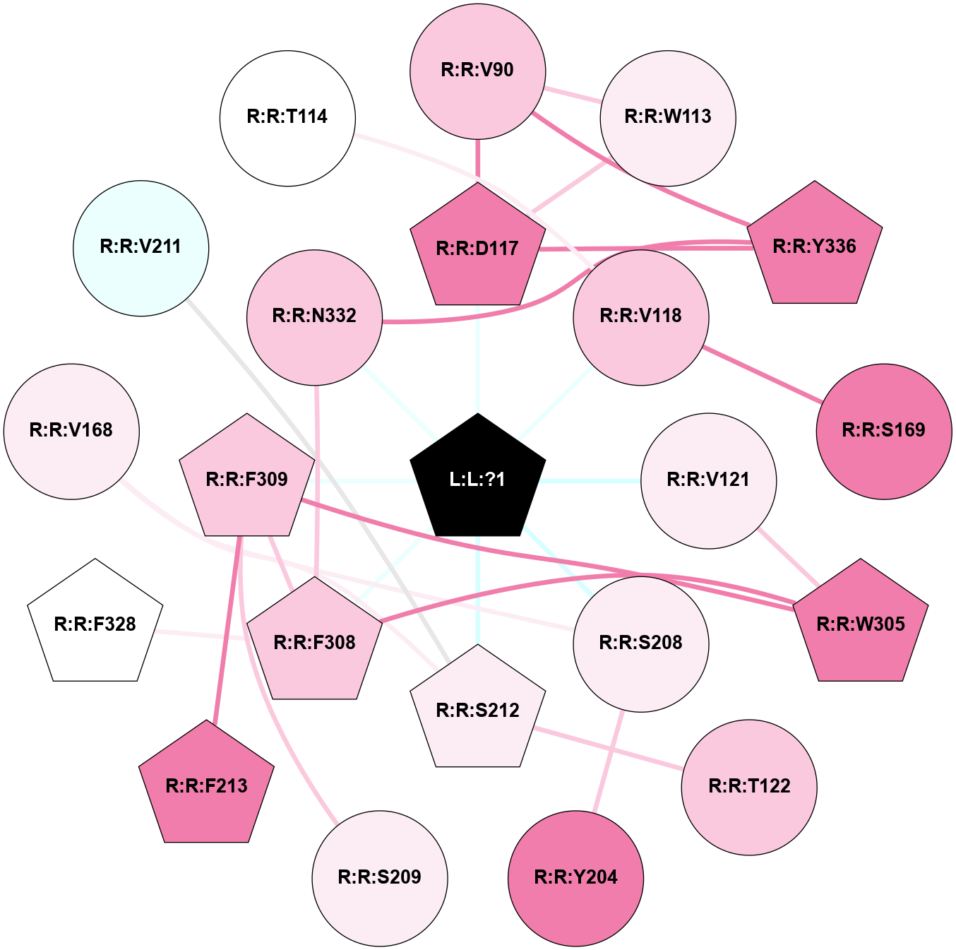 (Click to enlarge 🔍) | | Node1 | Node2 | LinkStrength | Comm | IsNode1Hub? | IsNode2Hub? | Node1Cons | Node2Cons | Node1Shell | Node2Shell | | L:L:?1 | R:R:D117 | 17.89 | 4 | Yes | Yes | 0 | 8 | 0 | 1 | | L:L:?1 | R:R:V118 | 15.43 | 4 | Yes | No | 0 | 7 | 0 | 1 | | L:L:?1 | R:R:V121 | 11.22 | 4 | Yes | No | 0 | 6 | 0 | 1 | | L:L:?1 | R:R:S208 | 4.24 | 4 | Yes | No | 0 | 6 | 0 | 1 | | L:L:?1 | R:R:S212 | 4.24 | 4 | Yes | Yes | 0 | 6 | 0 | 1 | | L:L:?1 | R:R:F308 | 11.47 | 4 | Yes | Yes | 0 | 7 | 0 | 1 | | L:L:?1 | R:R:F309 | 9.17 | 4 | Yes | Yes | 0 | 7 | 0 | 1 | | L:L:?1 | R:R:N332 | 10.34 | 4 | Yes | No | 0 | 7 | 0 | 1 | | R:R:V90 | R:R:W113 | 3.68 | 4 | No | No | 7 | 6 | 2 | 2 | | R:R:D117 | R:R:V90 | 4.38 | 4 | Yes | No | 8 | 7 | 1 | 2 | | R:R:V90 | R:R:Y336 | 5.05 | 4 | No | Yes | 7 | 8 | 2 | 2 | | R:R:D117 | R:R:W113 | 3.35 | 4 | Yes | No | 8 | 6 | 1 | 2 | | R:R:D117 | R:R:Y336 | 10.34 | 4 | Yes | Yes | 8 | 8 | 1 | 2 | | R:R:S169 | R:R:V118 | 3.23 | 0 | No | No | 8 | 7 | 2 | 1 | | R:R:V121 | R:R:W305 | 9.81 | 0 | No | Yes | 6 | 8 | 1 | 2 | | R:R:S212 | R:R:T122 | 7.99 | 0 | Yes | No | 6 | 7 | 1 | 2 | | R:R:S208 | R:R:Y204 | 13.99 | 0 | No | No | 6 | 8 | 1 | 2 | | R:R:F309 | R:R:S209 | 7.93 | 4 | Yes | No | 7 | 6 | 1 | 2 | | R:R:F213 | R:R:F309 | 22.51 | 0 | Yes | Yes | 8 | 7 | 2 | 1 | | R:R:F308 | R:R:W305 | 7.02 | 4 | Yes | Yes | 7 | 8 | 1 | 2 | | R:R:F309 | R:R:W305 | 7.02 | 4 | Yes | Yes | 7 | 8 | 1 | 2 | | R:R:F308 | R:R:F309 | 7.5 | 4 | Yes | Yes | 7 | 7 | 1 | 1 | | R:R:F308 | R:R:F328 | 8.57 | 4 | Yes | Yes | 7 | 5 | 1 | 2 | | R:R:F308 | R:R:N332 | 6.04 | 4 | Yes | No | 7 | 7 | 1 | 1 | | R:R:N332 | R:R:Y336 | 17.44 | 4 | No | Yes | 7 | 8 | 1 | 2 | | R:R:S208 | R:R:V168 | 1.62 | 0 | No | No | 6 | 6 | 1 | 2 | | R:R:S212 | R:R:V168 | 1.62 | 0 | Yes | No | 6 | 6 | 1 | 2 | | R:R:S212 | R:R:V211 | 1.62 | 0 | Yes | No | 6 | 4 | 1 | 2 | | R:R:T114 | R:R:V118 | 1.59 | 0 | No | No | 5 | 7 | 2 | 1 | |