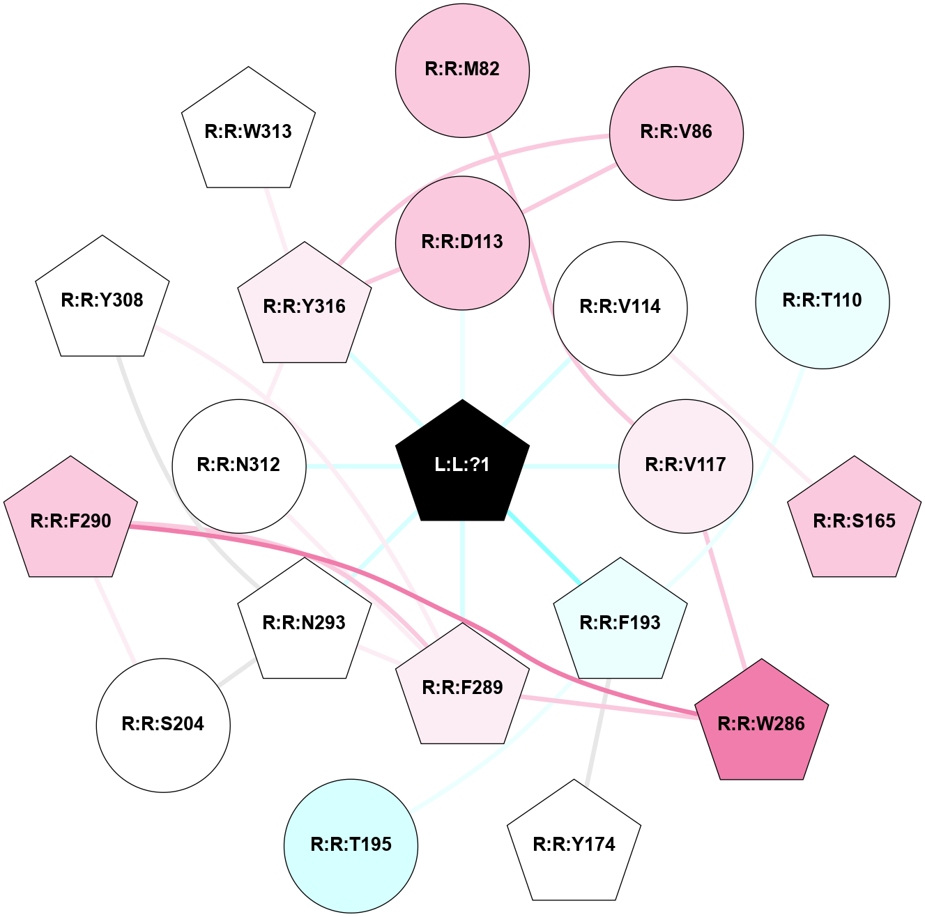 (Click to enlarge 🔍) | | Node1 | Node2 | LinkStrength | Comm | IsNode1Hub? | IsNode2Hub? | Node1Cons | Node2Cons | Node1Shell | Node2Shell | | L:L:?1 | R:R:D113 | 12.62 | 2 | Yes | No | 0 | 7 | 0 | 1 | | L:L:?1 | R:R:V114 | 4.16 | 2 | Yes | No | 0 | 5 | 0 | 1 | | L:L:?1 | R:R:V117 | 11.09 | 2 | Yes | No | 0 | 6 | 0 | 1 | | L:L:?1 | R:R:F193 | 4.53 | 2 | Yes | Yes | 0 | 4 | 0 | 1 | | L:L:?1 | R:R:F289 | 9.06 | 2 | Yes | Yes | 0 | 6 | 0 | 1 | | L:L:?1 | R:R:N293 | 6.39 | 2 | Yes | Yes | 0 | 5 | 0 | 1 | | L:L:?1 | R:R:N312 | 8.94 | 2 | Yes | No | 0 | 5 | 0 | 1 | | L:L:?1 | R:R:Y316 | 5.45 | 2 | Yes | Yes | 0 | 6 | 0 | 1 | | R:R:M82 | R:R:V117 | 3.04 | 0 | No | No | 7 | 6 | 2 | 1 | | R:R:D113 | R:R:V86 | 11.69 | 2 | No | No | 7 | 7 | 1 | 2 | | R:R:V86 | R:R:Y316 | 3.79 | 2 | No | Yes | 7 | 6 | 2 | 1 | | R:R:F193 | R:R:T110 | 3.89 | 0 | Yes | No | 4 | 4 | 1 | 2 | | R:R:D113 | R:R:Y316 | 9.2 | 2 | No | Yes | 7 | 6 | 1 | 1 | | R:R:S165 | R:R:V114 | 3.23 | 0 | Yes | No | 7 | 5 | 2 | 1 | | R:R:V117 | R:R:W286 | 4.9 | 0 | No | Yes | 6 | 8 | 1 | 2 | | R:R:F193 | R:R:Y174 | 7.22 | 0 | Yes | Yes | 4 | 5 | 1 | 2 | | R:R:F193 | R:R:T195 | 7.78 | 0 | Yes | No | 4 | 3 | 1 | 2 | | R:R:F290 | R:R:S204 | 5.28 | 2 | Yes | No | 7 | 5 | 2 | 2 | | R:R:N293 | R:R:S204 | 7.45 | 2 | Yes | No | 5 | 5 | 1 | 2 | | R:R:F289 | R:R:W286 | 7.02 | 2 | Yes | Yes | 6 | 8 | 1 | 2 | | R:R:F290 | R:R:W286 | 4.01 | 2 | Yes | Yes | 7 | 8 | 2 | 2 | | R:R:F289 | R:R:F290 | 7.5 | 2 | Yes | Yes | 6 | 7 | 1 | 2 | | R:R:F289 | R:R:N293 | 3.62 | 2 | Yes | Yes | 6 | 5 | 1 | 1 | | R:R:F289 | R:R:Y308 | 8.25 | 2 | Yes | Yes | 6 | 5 | 1 | 2 | | R:R:F289 | R:R:N312 | 9.67 | 2 | Yes | No | 6 | 5 | 1 | 1 | | R:R:N293 | R:R:Y308 | 3.49 | 2 | Yes | Yes | 5 | 5 | 1 | 2 | | R:R:N312 | R:R:Y316 | 9.3 | 2 | No | Yes | 5 | 6 | 1 | 1 | | R:R:W313 | R:R:Y316 | 6.75 | 2 | Yes | Yes | 5 | 6 | 2 | 1 | |