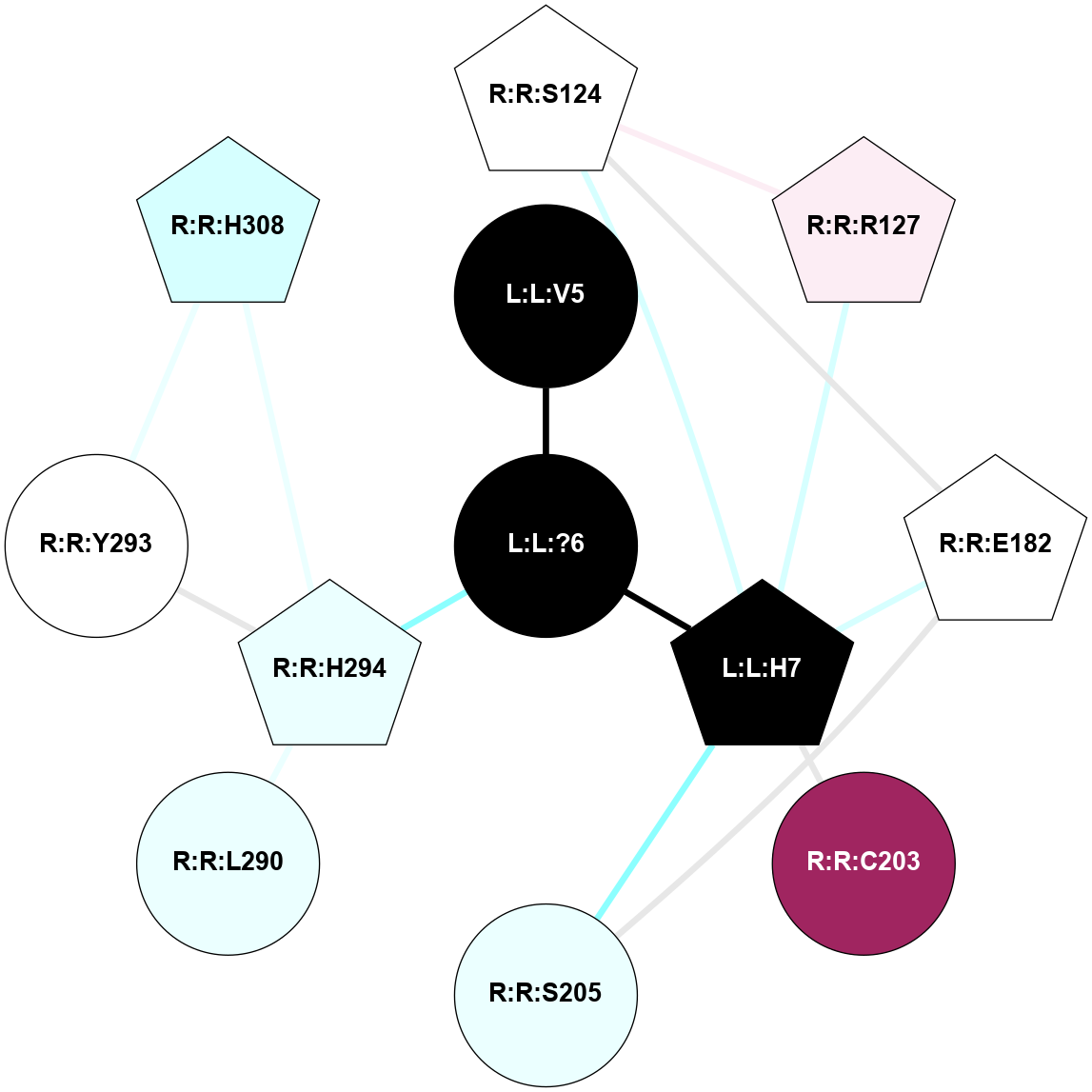 (Click to enlarge 🔍) | | Node1 | Node2 | LinkStrength | Comm | IsNode1Hub? | IsNode2Hub? | Node1Cons | Node2Cons | Node1Shell | Node2Shell | | L:L:?6 | L:L:V5 | 5.21 | 0 | No | No | 0 | 0 | 0 | 1 | | L:L:?6 | L:L:H7 | 12 | 0 | No | Yes | 0 | 0 | 0 | 1 | | L:L:?6 | R:R:H294 | 6 | 0 | No | Yes | 0 | 4 | 0 | 1 | | L:L:H7 | R:R:S124 | 6.97 | 1 | Yes | Yes | 0 | 5 | 1 | 2 | | L:L:H7 | R:R:R127 | 7.9 | 1 | Yes | Yes | 0 | 6 | 1 | 2 | | L:L:H7 | R:R:E182 | 6.15 | 1 | Yes | Yes | 0 | 5 | 1 | 2 | | L:L:H7 | R:R:C203 | 7.37 | 1 | Yes | No | 0 | 9 | 1 | 2 | | L:L:H7 | R:R:S205 | 6.97 | 1 | Yes | No | 0 | 4 | 1 | 2 | | R:R:R127 | R:R:S124 | 6.59 | 1 | Yes | Yes | 6 | 5 | 2 | 2 | | R:R:E182 | R:R:S124 | 5.75 | 1 | Yes | Yes | 5 | 5 | 2 | 2 | | R:R:E182 | R:R:S205 | 11.5 | 1 | Yes | No | 5 | 4 | 2 | 2 | | R:R:H294 | R:R:L290 | 10.29 | 1 | Yes | No | 4 | 4 | 1 | 2 | | R:R:H294 | R:R:Y293 | 3.27 | 1 | Yes | No | 4 | 5 | 1 | 2 | | R:R:H308 | R:R:Y293 | 3.27 | 1 | Yes | No | 3 | 5 | 2 | 2 | | R:R:H294 | R:R:H308 | 3.58 | 1 | Yes | Yes | 4 | 3 | 1 | 2 | |