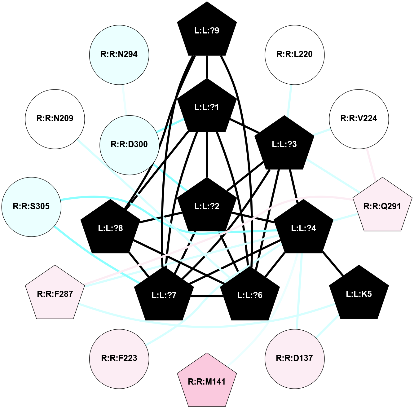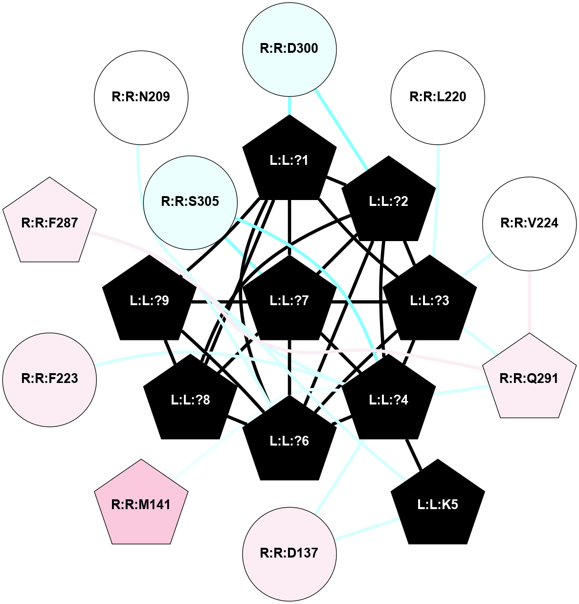 (Click to enlarge 🔍) | | Node1 | Node2 | LinkStrength | Comm | IsNode1Hub? | IsNode2Hub? | Node1Cons | Node2Cons | Node1Shell | Node2Shell | | L:L:?1 | L:L:?2 | 17.78 | 1 | No | Yes | 0 | 0 | 2 | 1 | | L:L:?1 | R:R:Y205 | 12.31 | 1 | No | Yes | 0 | 4 | 2 | 2 | | L:L:?2 | L:L:?3 | 24.15 | 1 | Yes | Yes | 0 | 0 | 1 | 0 | | L:L:?2 | L:L:C8 | 4.94 | 1 | Yes | Yes | 0 | 0 | 1 | 1 | | L:L:?2 | R:R:Y205 | 10.95 | 1 | Yes | Yes | 0 | 4 | 1 | 2 | | L:L:?2 | R:R:F275 | 9.48 | 1 | Yes | No | 0 | 4 | 1 | 2 | | L:L:?2 | R:R:M282 | 4.4 | 1 | Yes | No | 0 | 3 | 1 | 2 | | L:L:?2 | R:R:P286 | 12.78 | 1 | Yes | No | 0 | 2 | 1 | 2 | | L:L:?2 | R:R:L290 | 5.39 | 1 | Yes | No | 0 | 4 | 1 | 2 | | L:L:?2 | R:R:F294 | 11.38 | 1 | Yes | No | 0 | 4 | 1 | 2 | | L:L:?3 | L:L:Y4 | 17.52 | 1 | Yes | No | 0 | 0 | 0 | 1 | | L:L:?3 | L:L:C8 | 8.9 | 1 | Yes | Yes | 0 | 0 | 0 | 1 | | L:L:?3 | R:R:K291 | 3.95 | 1 | Yes | Yes | 0 | 3 | 0 | 1 | | L:L:?9 | L:L:Y4 | 16.84 | 1 | Yes | No | 0 | 0 | 2 | 1 | | L:L:C8 | R:R:K291 | 8.08 | 1 | Yes | Yes | 0 | 3 | 1 | 1 | | L:L:C8 | R:R:D295 | 4.67 | 1 | Yes | Yes | 0 | 2 | 1 | 2 | | L:L:?9 | R:R:D295 | 6.5 | 1 | Yes | Yes | 0 | 2 | 2 | 2 | | R:R:F275 | R:R:F294 | 13.93 | 1 | No | No | 4 | 4 | 2 | 2 | | R:R:K291 | R:R:P286 | 6.69 | 1 | Yes | No | 3 | 2 | 1 | 2 | | L:L:Y4 | R:R:S192 | 2.54 | 0 | No | No | 0 | 4 | 1 | 2 | | R:R:G292 | R:R:K291 | 1.74 | 0 | No | Yes | 1 | 3 | 2 | 1 | |