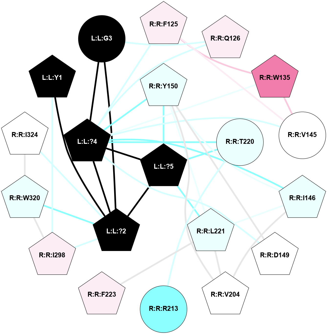 (Click to enlarge 🔍) | | Node1 | Node2 | LinkStrength | Comm | IsNode1Hub? | IsNode2Hub? | Node1Cons | Node2Cons | Node1Shell | Node2Shell | | R:R:F125 | R:R:W135 | 4.01 | 2 | Yes | Yes | 6 | 8 | 2 | 2 | | R:R:F125 | R:R:V145 | 7.87 | 2 | Yes | No | 6 | 5 | 2 | 2 | | L:L:?4 | R:R:F125 | 2.11 | 2 | Yes | Yes | 0 | 6 | 1 | 2 | | L:L:G3 | R:R:Q126 | 3.29 | 2 | No | Yes | 0 | 6 | 2 | 2 | | L:L:?4 | R:R:Q126 | 8.06 | 2 | Yes | Yes | 0 | 6 | 1 | 2 | | R:R:V145 | R:R:W135 | 6.13 | 2 | No | Yes | 5 | 8 | 2 | 2 | | L:L:?4 | R:R:W135 | 5.91 | 2 | Yes | Yes | 0 | 8 | 1 | 2 | | L:L:?4 | R:R:V145 | 12.89 | 2 | Yes | No | 0 | 5 | 1 | 2 | | R:R:I146 | R:R:Y150 | 3.63 | 2 | Yes | Yes | 4 | 4 | 2 | 1 | | R:R:I146 | R:R:V204 | 3.07 | 2 | Yes | Yes | 4 | 5 | 2 | 2 | | R:R:I146 | R:R:L221 | 5.71 | 2 | Yes | Yes | 4 | 4 | 2 | 1 | | L:L:?4 | R:R:I146 | 16.05 | 2 | Yes | Yes | 0 | 4 | 1 | 2 | | R:R:D149 | R:R:Y150 | 5.75 | 2 | Yes | Yes | 5 | 4 | 2 | 1 | | L:L:?4 | R:R:D149 | 7.05 | 2 | Yes | Yes | 0 | 5 | 1 | 2 | | R:R:V204 | R:R:Y150 | 7.57 | 2 | Yes | Yes | 5 | 4 | 2 | 1 | | R:R:L221 | R:R:Y150 | 2.34 | 2 | Yes | Yes | 4 | 4 | 1 | 1 | | L:L:?4 | R:R:Y150 | 2.03 | 2 | Yes | Yes | 0 | 4 | 1 | 1 | | L:L:?5 | R:R:Y150 | 3.16 | 2 | Yes | Yes | 0 | 4 | 0 | 1 | | R:R:L221 | R:R:V204 | 4.47 | 2 | Yes | Yes | 4 | 5 | 1 | 2 | | R:R:R213 | R:R:T220 | 3.88 | 0 | No | No | 2 | 4 | 2 | 1 | | L:L:?4 | R:R:T220 | 5.1 | 2 | Yes | No | 0 | 4 | 1 | 1 | | L:L:?5 | R:R:T220 | 11.92 | 2 | Yes | No | 0 | 4 | 0 | 1 | | R:R:F223 | R:R:L221 | 3.65 | 0 | Yes | Yes | 6 | 4 | 2 | 1 | | L:L:?5 | R:R:L221 | 1.87 | 2 | Yes | Yes | 0 | 4 | 0 | 1 | | R:R:I298 | R:R:W320 | 2.35 | 2 | Yes | Yes | 6 | 4 | 2 | 2 | | L:L:Y1 | R:R:I298 | 2.42 | 2 | Yes | Yes | 0 | 6 | 2 | 2 | | L:L:?2 | R:R:I298 | 2.9 | 2 | Yes | Yes | 0 | 6 | 1 | 2 | | R:R:I324 | R:R:W320 | 10.57 | 2 | Yes | Yes | 5 | 4 | 2 | 2 | | L:L:?2 | R:R:W320 | 11.59 | 2 | Yes | Yes | 0 | 4 | 1 | 2 | | L:L:?2 | R:R:I324 | 11.61 | 2 | Yes | Yes | 0 | 5 | 1 | 2 | | L:L:?2 | L:L:Y1 | 9.54 | 2 | Yes | Yes | 0 | 0 | 1 | 2 | | L:L:?2 | L:L:G3 | 6.96 | 2 | Yes | No | 0 | 0 | 1 | 2 | | L:L:?2 | L:L:?4 | 7.31 | 2 | Yes | Yes | 0 | 0 | 1 | 1 | | L:L:?2 | L:L:?5 | 1.9 | 2 | Yes | Yes | 0 | 0 | 1 | 0 | | L:L:?4 | L:L:G3 | 4.44 | 2 | Yes | No | 0 | 0 | 1 | 2 | | L:L:?4 | L:L:?5 | 29.06 | 2 | Yes | Yes | 0 | 0 | 1 | 0 | |