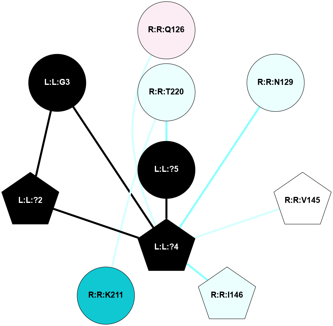(Click to enlarge 🔍) | | Node1 | Node2 | LinkStrength | Comm | IsNode1Hub? | IsNode2Hub? | Node1Cons | Node2Cons | Node1Shell | Node2Shell | | L:L:?2 | L:L:G3 | 6.96 | 2 | Yes | No | 0 | 0 | 2 | 2 | | L:L:?2 | L:L:?4 | 2.44 | 2 | Yes | Yes | 0 | 0 | 2 | 1 | | L:L:?4 | L:L:G3 | 10.36 | 2 | Yes | No | 0 | 0 | 1 | 2 | | L:L:G3 | R:R:Q126 | 3.29 | 2 | No | Yes | 0 | 6 | 2 | 2 | | L:L:?4 | L:L:?5 | 27.45 | 2 | Yes | No | 0 | 0 | 1 | 0 | | L:L:?4 | R:R:Q126 | 9.21 | 2 | Yes | Yes | 0 | 6 | 1 | 2 | | L:L:?4 | R:R:N129 | 3.56 | 2 | Yes | No | 0 | 4 | 1 | 2 | | L:L:?4 | R:R:V145 | 3.87 | 2 | Yes | Yes | 0 | 5 | 1 | 2 | | R:R:K211 | R:R:T220 | 3 | 24 | No | No | 1 | 4 | 2 | 1 | | L:L:?5 | R:R:T220 | 1.99 | 0 | No | No | 0 | 4 | 0 | 1 | |