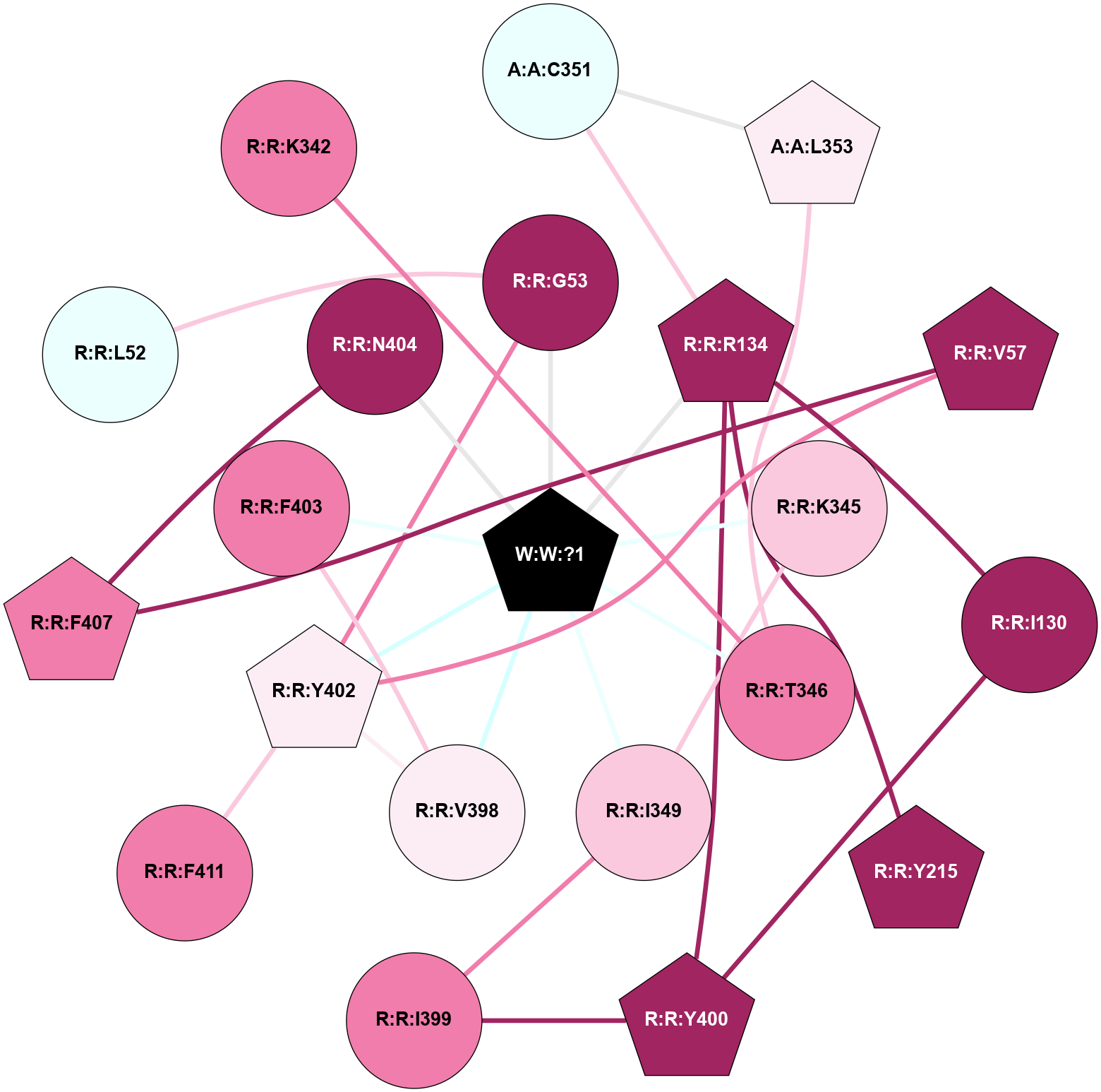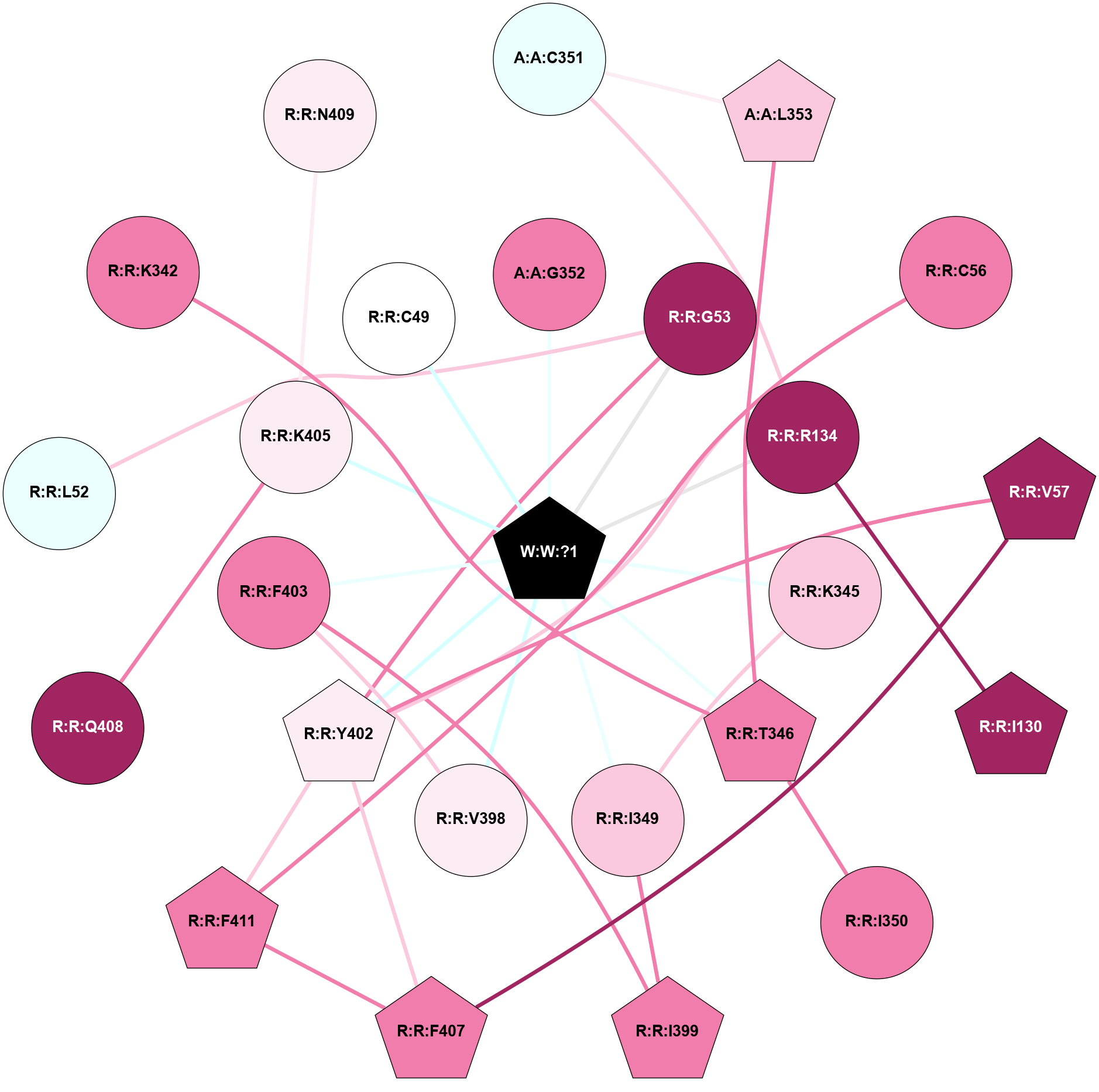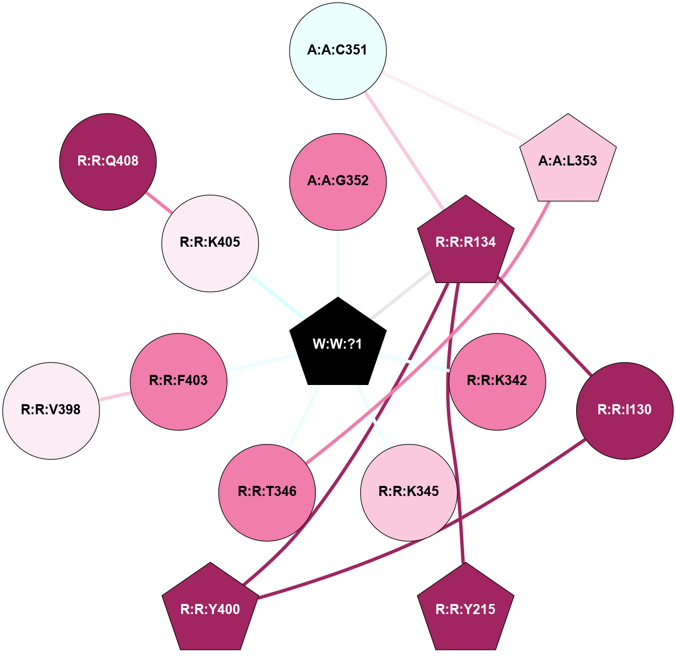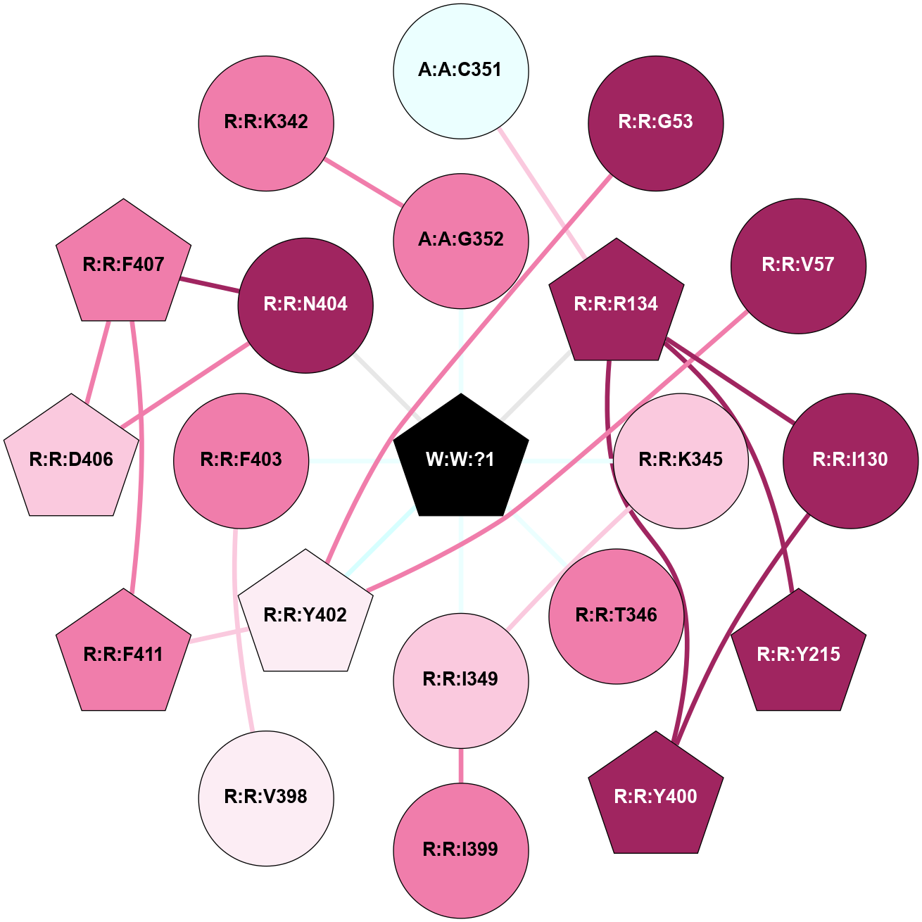 (Click to enlarge 🔍) | | Node1 | Node2 | LinkStrength | Comm | IsNode1Hub? | IsNode2Hub? | Node1Cons | Node2Cons | Node1Shell | Node2Shell | | A:A:C351 | A:A:L353 | 6.35 | 0 | No | Yes | 4 | 7 | 2 | 2 | | A:A:C351 | R:R:R134 | 6.96 | 0 | No | Yes | 4 | 9 | 2 | 1 | | A:A:G352 | W:W:?1 | 5.72 | 0 | No | Yes | 8 | 0 | 1 | 0 | | A:A:L353 | R:R:T346 | 2.95 | 21 | Yes | No | 7 | 8 | 2 | 1 | | R:R:I130 | R:R:R134 | 3.76 | 10 | No | Yes | 9 | 9 | 2 | 1 | | R:R:I130 | R:R:Y400 | 3.63 | 10 | No | Yes | 9 | 9 | 2 | 2 | | R:R:R134 | R:R:Y215 | 3.09 | 10 | Yes | Yes | 9 | 9 | 1 | 2 | | R:R:R134 | R:R:Y400 | 4.12 | 10 | Yes | Yes | 9 | 9 | 1 | 2 | | R:R:R134 | W:W:?1 | 3.25 | 10 | Yes | Yes | 9 | 0 | 1 | 0 | | R:R:K342 | W:W:?1 | 4.72 | 0 | No | Yes | 8 | 0 | 1 | 0 | | R:R:K345 | W:W:?1 | 6.61 | 0 | No | Yes | 7 | 0 | 1 | 0 | | R:R:T346 | W:W:?1 | 14.8 | 0 | No | Yes | 8 | 0 | 1 | 0 | | R:R:F403 | R:R:V398 | 3.93 | 0 | No | No | 8 | 6 | 1 | 2 | | R:R:F403 | W:W:?1 | 7.34 | 0 | No | Yes | 8 | 0 | 1 | 0 | | R:R:K405 | R:R:Q408 | 4.07 | 0 | No | No | 6 | 9 | 1 | 2 | | R:R:K405 | W:W:?1 | 12.27 | 0 | No | Yes | 6 | 0 | 1 | 0 | |