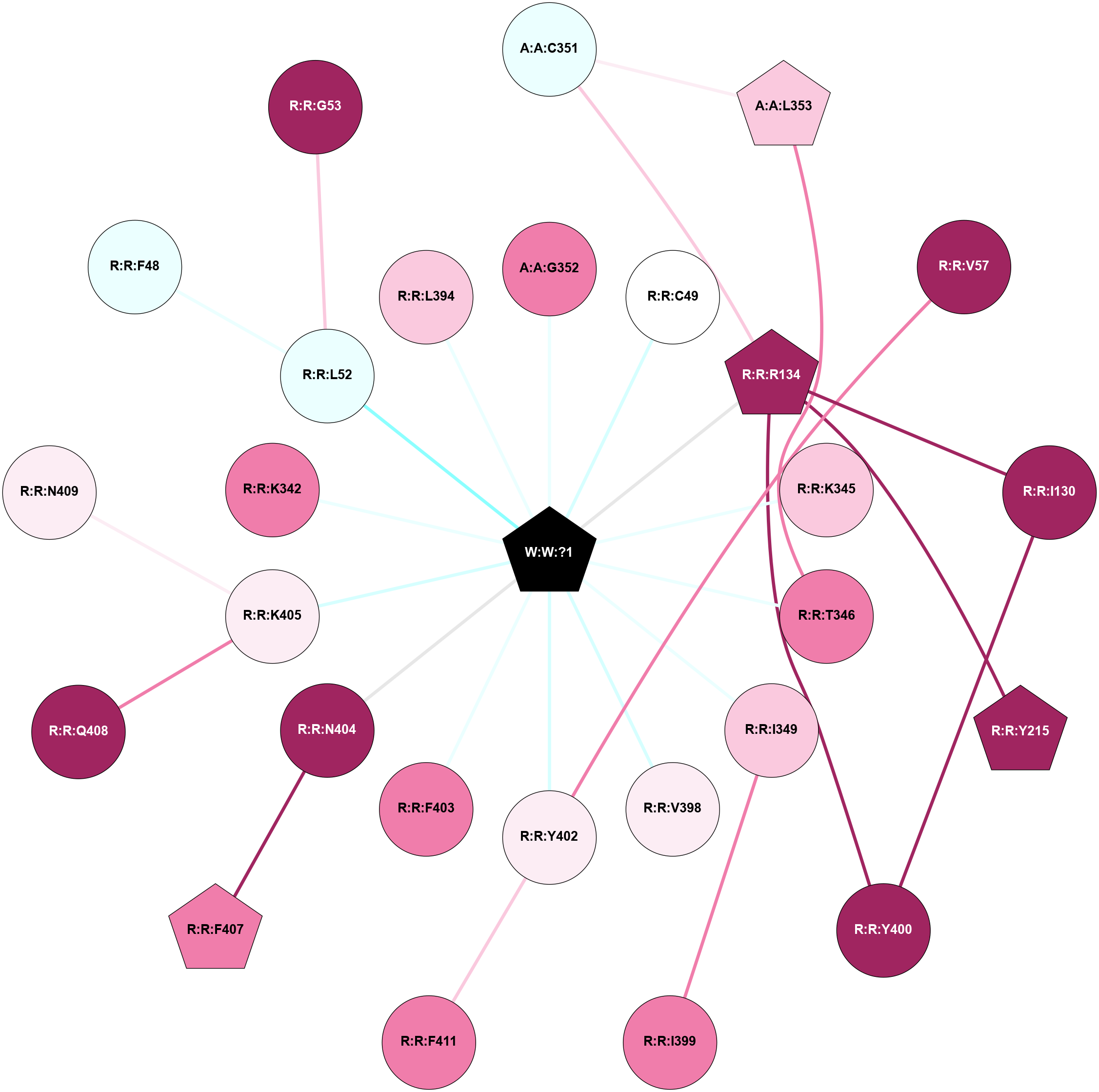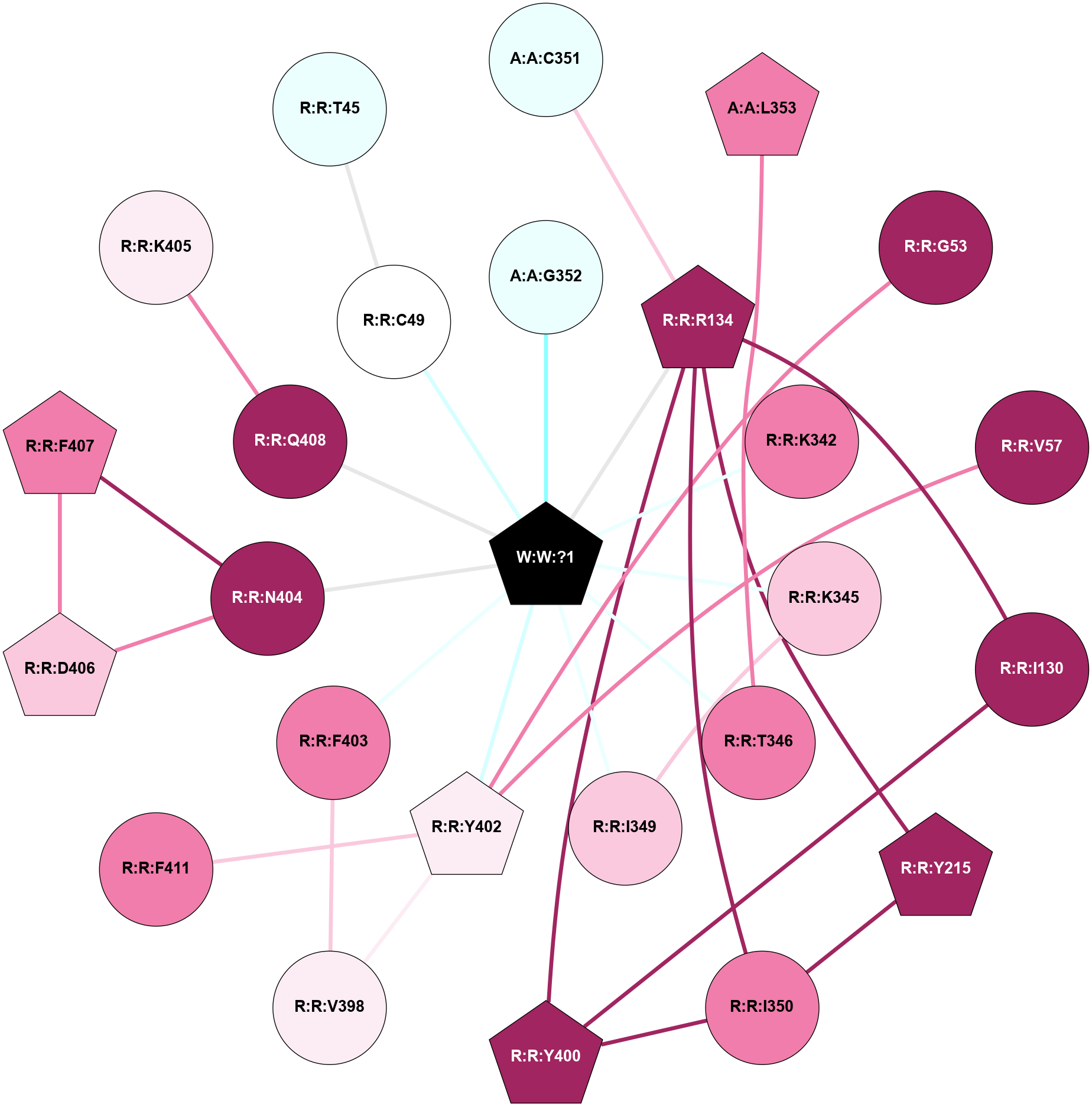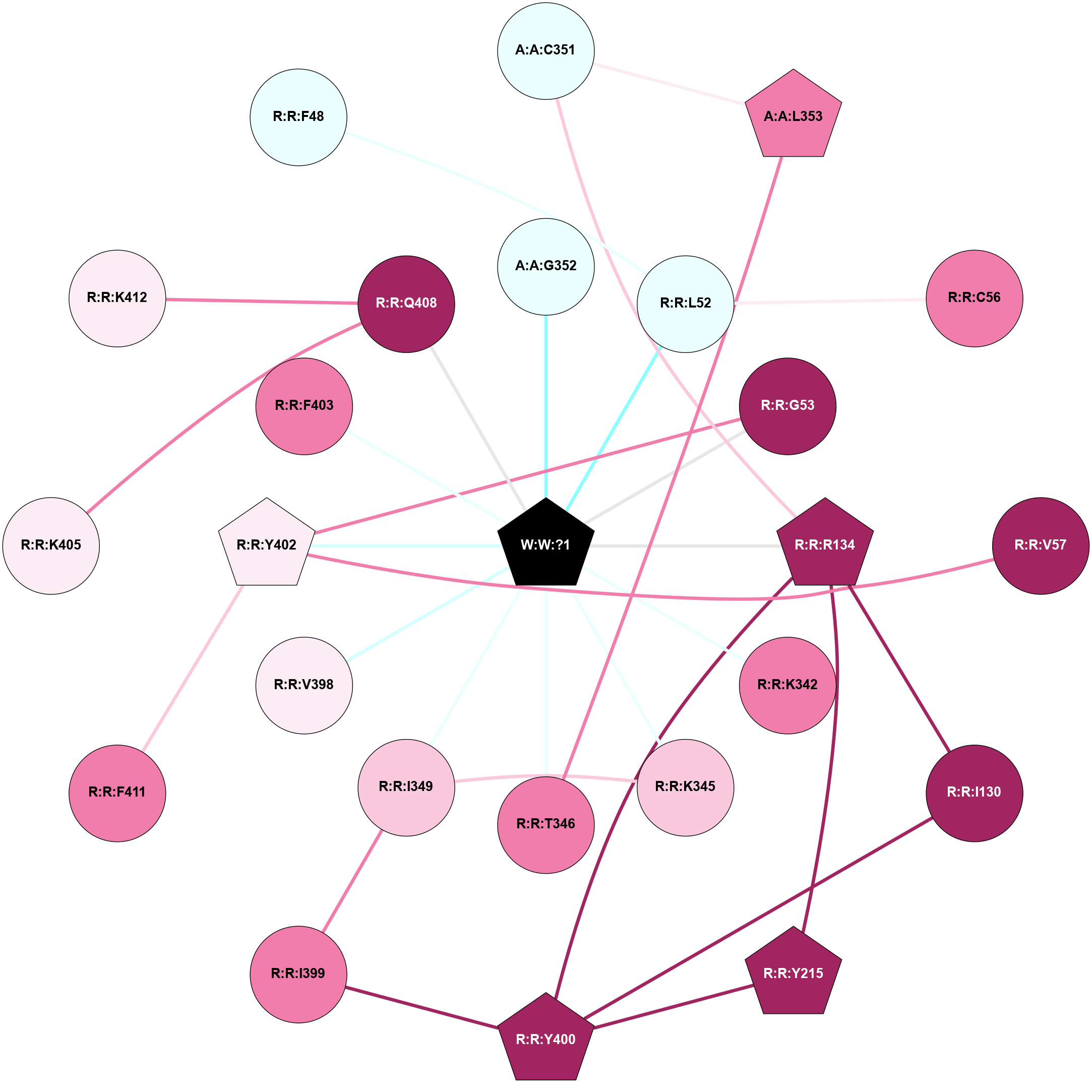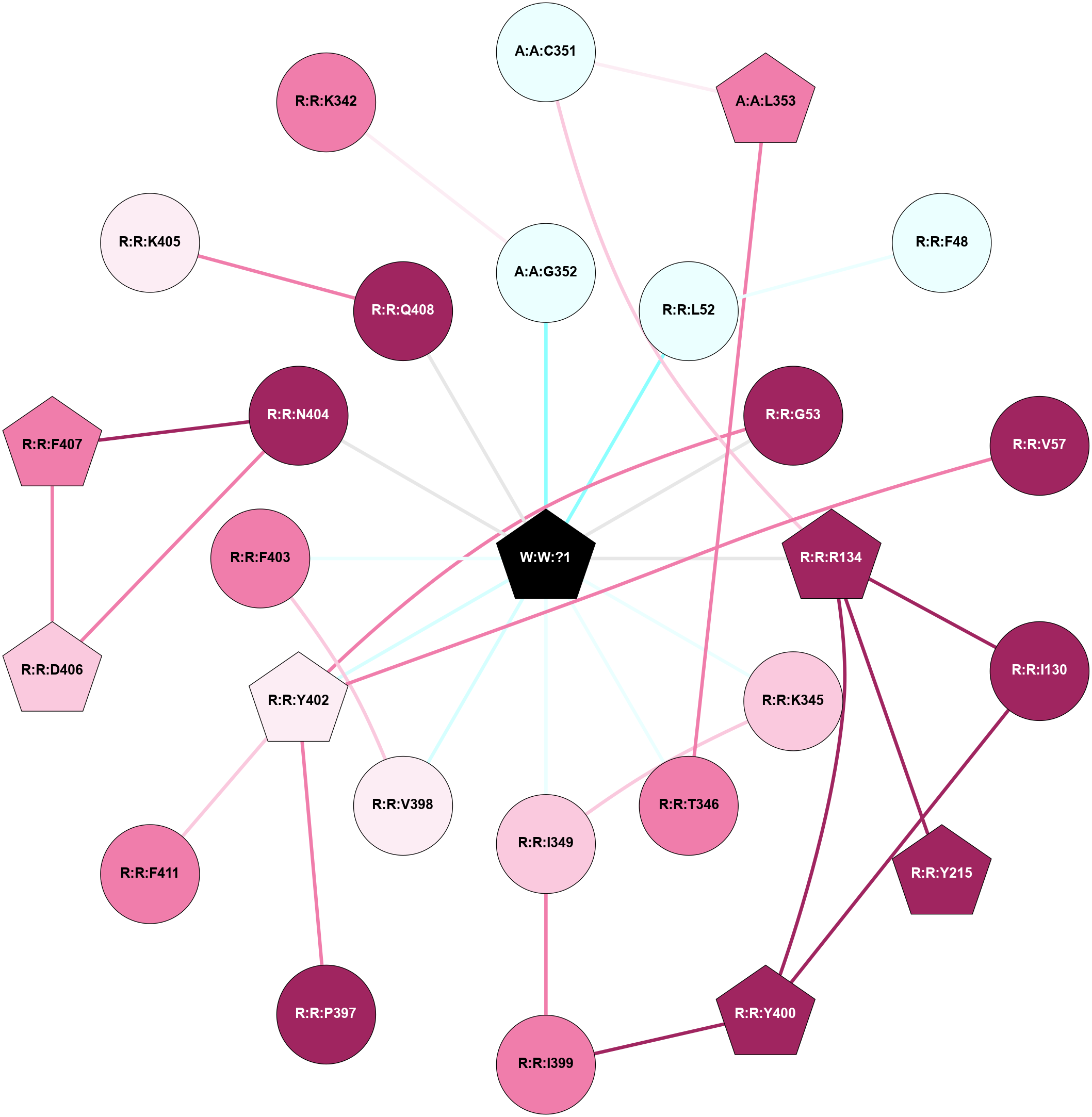 (Click to enlarge 🔍) | | Node1 | Node2 | LinkStrength | Comm | IsNode1Hub? | IsNode2Hub? | Node1Cons | Node2Cons | Node1Shell | Node2Shell | | A:A:C351 | A:A:L353 | 6.35 | 0 | No | Yes | 4 | 7 | 2 | 2 | | A:A:C351 | R:R:R134 | 6.96 | 0 | No | Yes | 4 | 9 | 2 | 1 | | A:A:G352 | W:W:?1 | 5.72 | 0 | No | Yes | 8 | 0 | 1 | 0 | | A:A:L353 | R:R:T346 | 2.95 | 21 | Yes | No | 7 | 8 | 2 | 1 | | R:R:I130 | R:R:R134 | 3.76 | 10 | No | Yes | 9 | 9 | 2 | 1 | | R:R:I130 | R:R:Y400 | 3.63 | 10 | No | Yes | 9 | 9 | 2 | 2 | | R:R:R134 | R:R:Y215 | 3.09 | 10 | Yes | Yes | 9 | 9 | 1 | 2 | | R:R:R134 | R:R:Y400 | 4.12 | 10 | Yes | Yes | 9 | 9 | 1 | 2 | | R:R:R134 | W:W:?1 | 3.25 | 10 | Yes | Yes | 9 | 0 | 1 | 0 | | R:R:K342 | W:W:?1 | 4.72 | 0 | No | Yes | 8 | 0 | 1 | 0 | | R:R:K345 | W:W:?1 | 6.61 | 0 | No | Yes | 7 | 0 | 1 | 0 | | R:R:T346 | W:W:?1 | 14.8 | 0 | No | Yes | 8 | 0 | 1 | 0 | | R:R:F403 | R:R:V398 | 3.93 | 0 | No | No | 8 | 6 | 1 | 2 | | R:R:F403 | W:W:?1 | 7.34 | 0 | No | Yes | 8 | 0 | 1 | 0 | | R:R:K405 | R:R:Q408 | 4.07 | 0 | No | No | 6 | 9 | 1 | 2 | | R:R:K405 | W:W:?1 | 12.27 | 0 | No | Yes | 6 | 0 | 1 | 0 | |