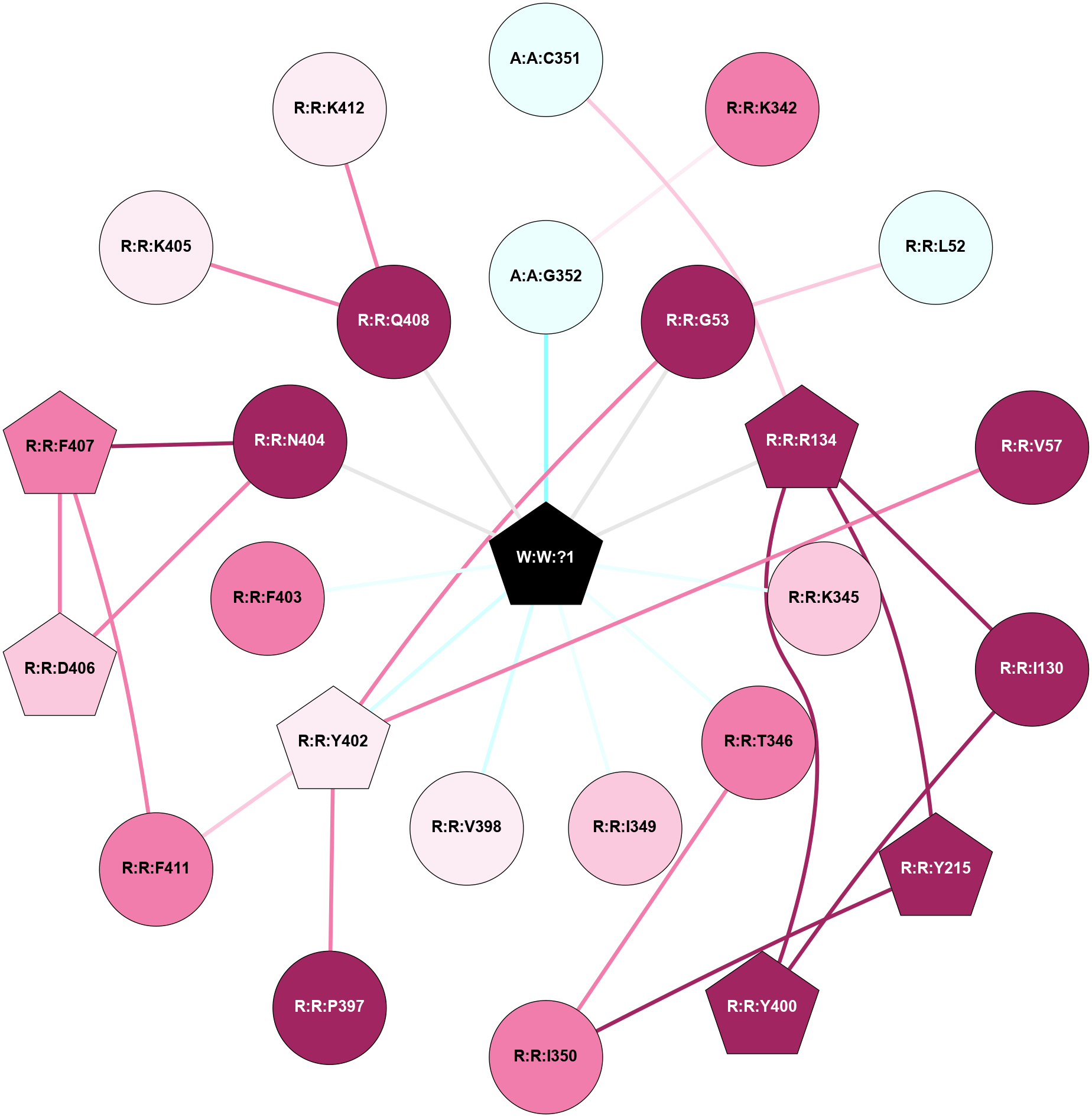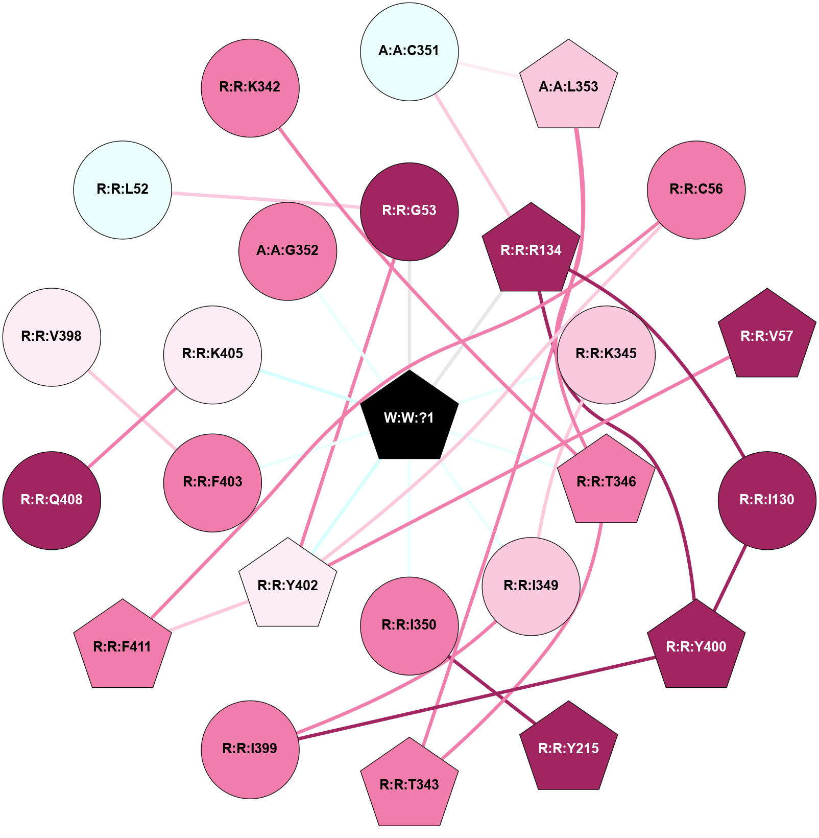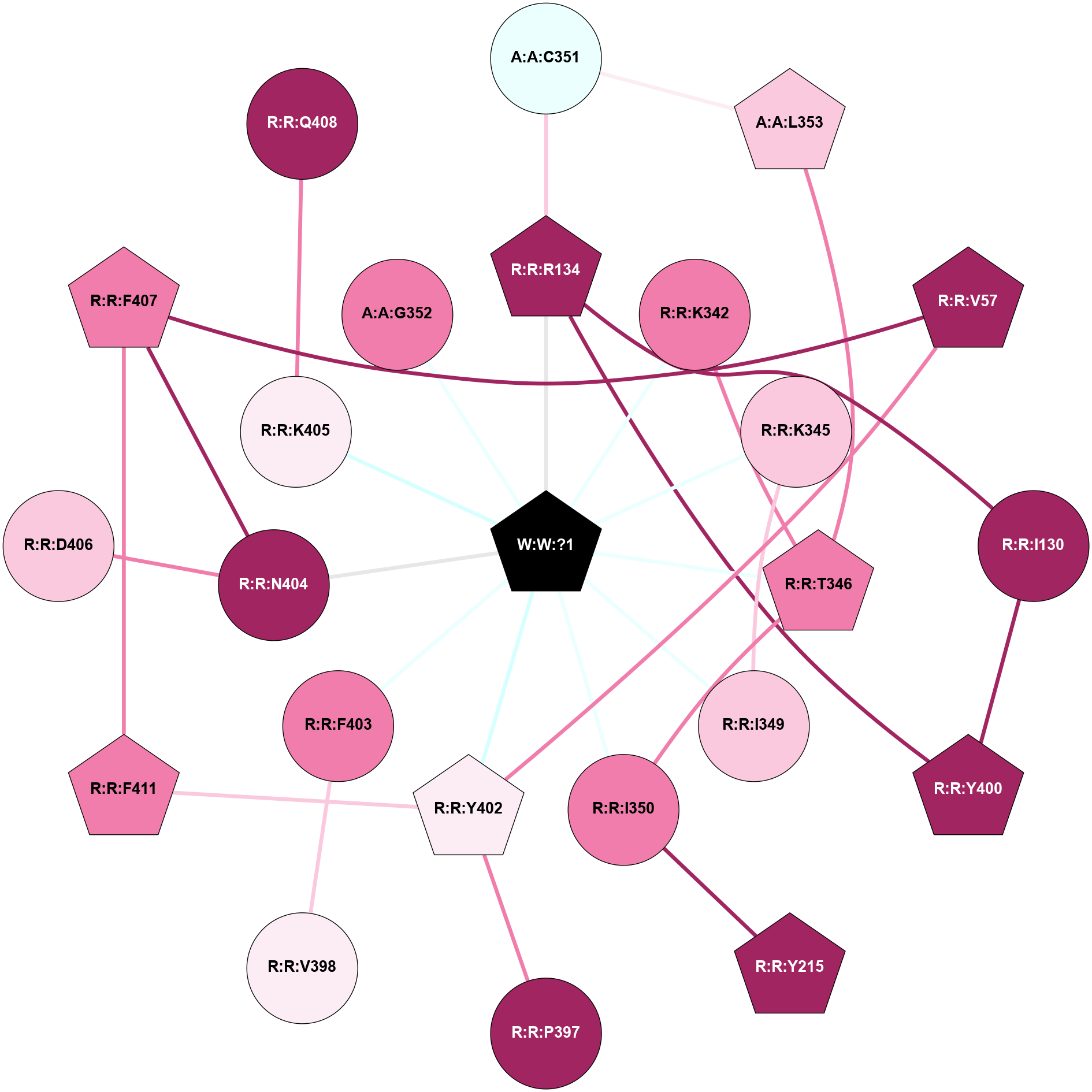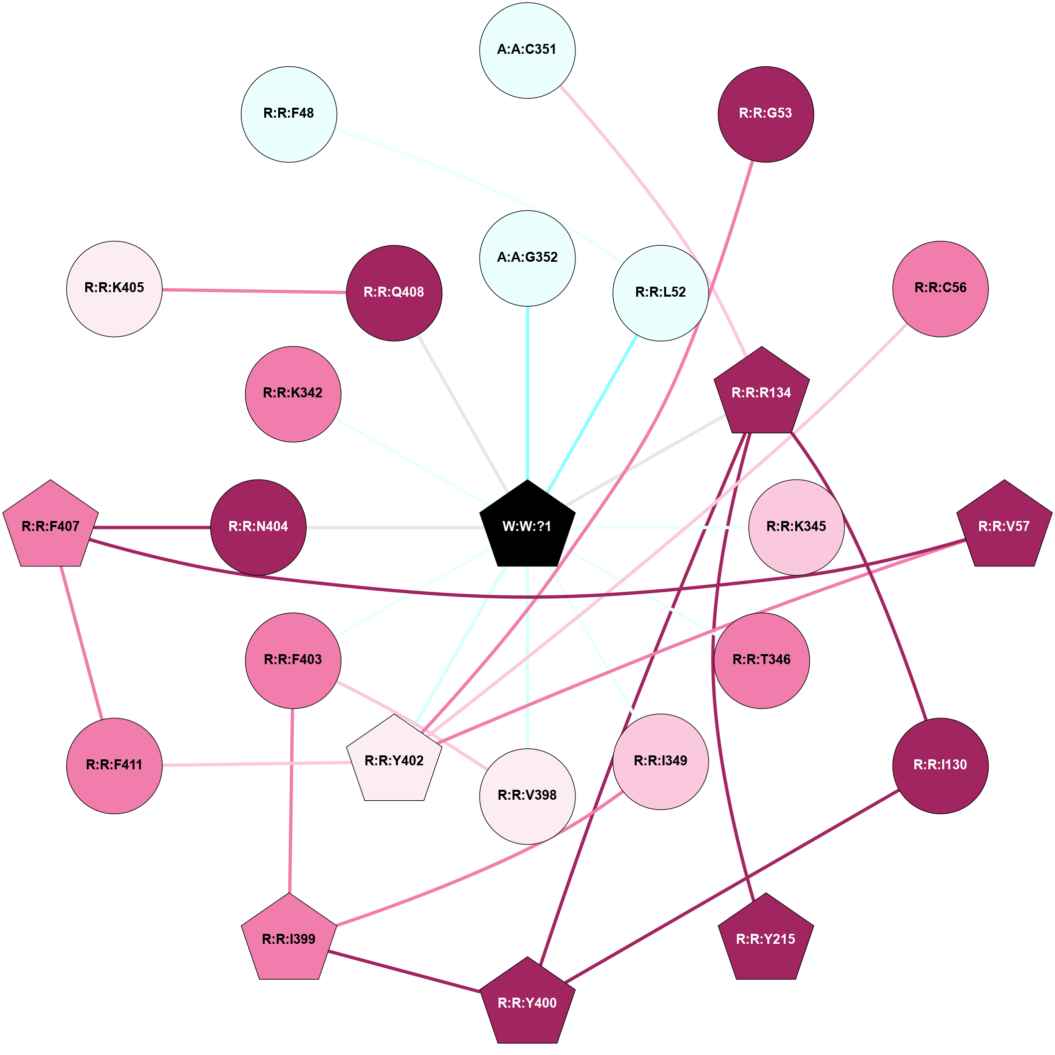 (Click to enlarge 🔍) | | Node1 | Node2 | LinkStrength | Comm | IsNode1Hub? | IsNode2Hub? | Node1Cons | Node2Cons | Node1Shell | Node2Shell | | A:A:C351 | A:A:L353 | 6.35 | 0 | No | Yes | 4 | 7 | 2 | 2 | | A:A:C351 | R:R:R134 | 6.96 | 0 | No | Yes | 4 | 9 | 2 | 1 | | A:A:G352 | W:W:?1 | 5.72 | 0 | No | Yes | 8 | 0 | 1 | 0 | | A:A:L353 | R:R:T346 | 2.95 | 21 | Yes | No | 7 | 8 | 2 | 1 | | R:R:I130 | R:R:R134 | 3.76 | 10 | No | Yes | 9 | 9 | 2 | 1 | | R:R:I130 | R:R:Y400 | 3.63 | 10 | No | Yes | 9 | 9 | 2 | 2 | | R:R:R134 | R:R:Y215 | 3.09 | 10 | Yes | Yes | 9 | 9 | 1 | 2 | | R:R:R134 | R:R:Y400 | 4.12 | 10 | Yes | Yes | 9 | 9 | 1 | 2 | | R:R:R134 | W:W:?1 | 3.25 | 10 | Yes | Yes | 9 | 0 | 1 | 0 | | R:R:K342 | W:W:?1 | 4.72 | 0 | No | Yes | 8 | 0 | 1 | 0 | | R:R:K345 | W:W:?1 | 6.61 | 0 | No | Yes | 7 | 0 | 1 | 0 | | R:R:T346 | W:W:?1 | 14.8 | 0 | No | Yes | 8 | 0 | 1 | 0 | | R:R:F403 | R:R:V398 | 3.93 | 0 | No | No | 8 | 6 | 1 | 2 | | R:R:F403 | W:W:?1 | 7.34 | 0 | No | Yes | 8 | 0 | 1 | 0 | | R:R:K405 | R:R:Q408 | 4.07 | 0 | No | No | 6 | 9 | 1 | 2 | | R:R:K405 | W:W:?1 | 12.27 | 0 | No | Yes | 6 | 0 | 1 | 0 | |