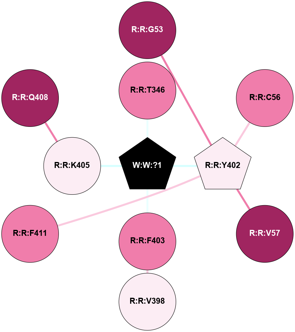 (Click to enlarge 🔍) | | Node1 | Node2 | LinkStrength | Comm | IsNode1Hub? | IsNode2Hub? | Node1Cons | Node2Cons | Node1Shell | Node2Shell | | R:R:G53 | R:R:Y402 | 4.35 | 0 | No | Yes | 9 | 6 | 2 | 1 | | R:R:C56 | R:R:Y402 | 4.03 | 0 | No | Yes | 8 | 6 | 2 | 1 | | R:R:V57 | R:R:Y402 | 5.05 | 0 | No | Yes | 9 | 6 | 2 | 1 | | R:R:T346 | W:W:?1 | 3.95 | 0 | No | Yes | 8 | 0 | 1 | 0 | | R:R:F403 | R:R:V398 | 6.55 | 0 | No | No | 8 | 6 | 1 | 2 | | R:R:F411 | R:R:Y402 | 9.28 | 0 | No | Yes | 8 | 6 | 2 | 1 | | R:R:Y402 | W:W:?1 | 3.14 | 0 | Yes | Yes | 6 | 0 | 1 | 0 | | R:R:F403 | W:W:?1 | 3.26 | 0 | No | Yes | 8 | 0 | 1 | 0 | | R:R:K405 | R:R:Q408 | 6.78 | 0 | No | No | 6 | 9 | 1 | 2 | | R:R:K405 | W:W:?1 | 8.5 | 0 | No | Yes | 6 | 0 | 1 | 0 | |