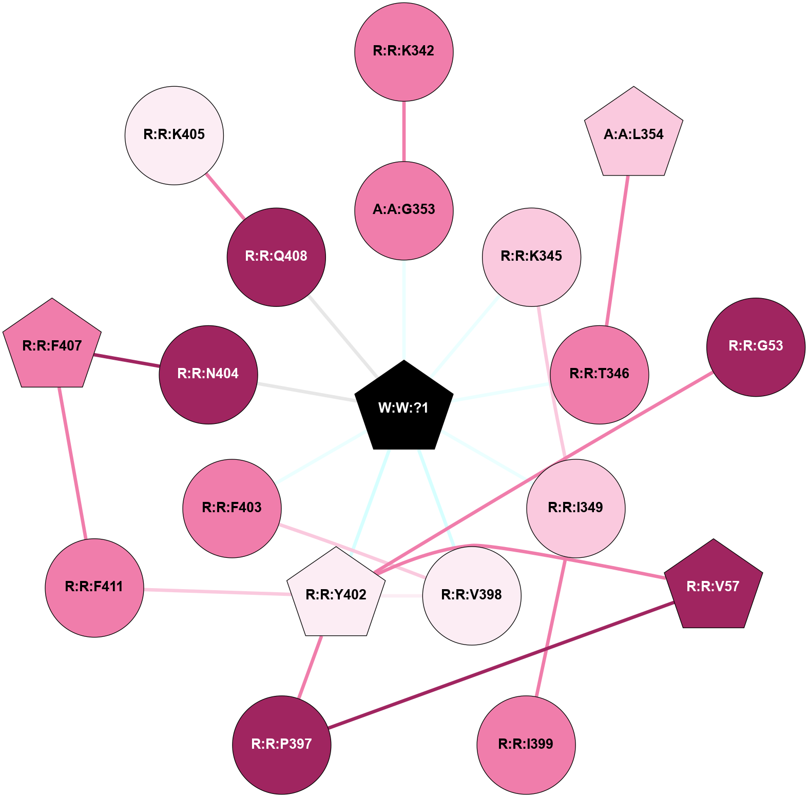 (Click to enlarge 🔍) | | Node1 | Node2 | LinkStrength | Comm | IsNode1Hub? | IsNode2Hub? | Node1Cons | Node2Cons | Node1Shell | Node2Shell | | A:A:G353 | R:R:K342 | 1.74 | 0 | No | No | 8 | 8 | 1 | 2 | | A:A:G353 | W:W:?1 | 2.29 | 0 | No | Yes | 8 | 0 | 1 | 0 | | A:A:L354 | R:R:T346 | 4.42 | 0 | Yes | No | 7 | 8 | 2 | 1 | | R:R:G53 | R:R:Y402 | 4.35 | 0 | No | Yes | 9 | 6 | 2 | 1 | | R:R:P397 | R:R:V57 | 1.77 | 10 | No | Yes | 9 | 9 | 2 | 2 | | R:R:V57 | R:R:Y402 | 2.52 | 10 | Yes | Yes | 9 | 6 | 2 | 1 | | R:R:I349 | R:R:K345 | 2.91 | 10 | No | No | 7 | 7 | 1 | 1 | | R:R:K345 | W:W:?1 | 9.44 | 10 | No | Yes | 7 | 0 | 1 | 0 | | R:R:T346 | W:W:?1 | 6.91 | 0 | No | Yes | 8 | 0 | 1 | 0 | | R:R:I349 | R:R:I399 | 4.42 | 10 | No | No | 7 | 8 | 1 | 2 | | R:R:I349 | W:W:?1 | 3.82 | 10 | No | Yes | 7 | 0 | 1 | 0 | | R:R:P397 | R:R:Y402 | 2.78 | 10 | No | Yes | 9 | 6 | 2 | 1 | | R:R:V398 | R:R:Y402 | 6.31 | 10 | No | Yes | 6 | 6 | 1 | 1 | | R:R:F403 | R:R:V398 | 2.62 | 10 | No | No | 8 | 6 | 1 | 1 | | R:R:V398 | W:W:?1 | 3.99 | 10 | No | Yes | 6 | 0 | 1 | 0 | | R:R:F411 | R:R:Y402 | 3.09 | 0 | No | Yes | 8 | 6 | 2 | 1 | | R:R:Y402 | W:W:?1 | 8.63 | 10 | Yes | Yes | 6 | 0 | 1 | 0 | | R:R:F403 | W:W:?1 | 37.5 | 10 | No | Yes | 8 | 0 | 1 | 0 | | R:R:F407 | R:R:N404 | 8.46 | 9 | Yes | No | 8 | 9 | 2 | 1 | | R:R:N404 | W:W:?1 | 6.43 | 0 | No | Yes | 9 | 0 | 1 | 0 | | R:R:K405 | R:R:Q408 | 4.07 | 0 | No | No | 6 | 9 | 2 | 1 | | R:R:F407 | R:R:F411 | 4.29 | 9 | Yes | No | 8 | 8 | 2 | 2 | | R:R:Q408 | W:W:?1 | 1.78 | 0 | No | Yes | 9 | 0 | 1 | 0 | |