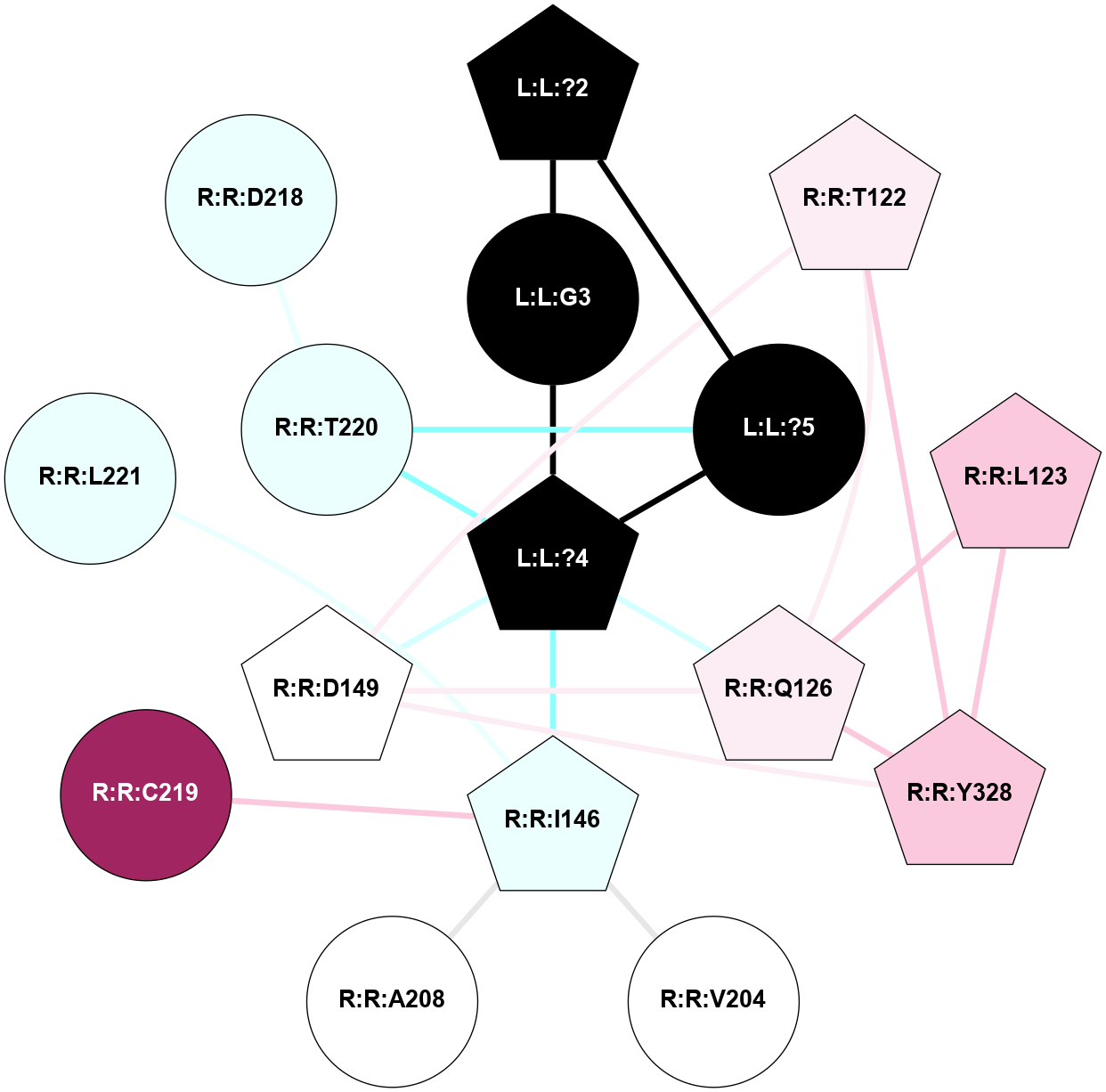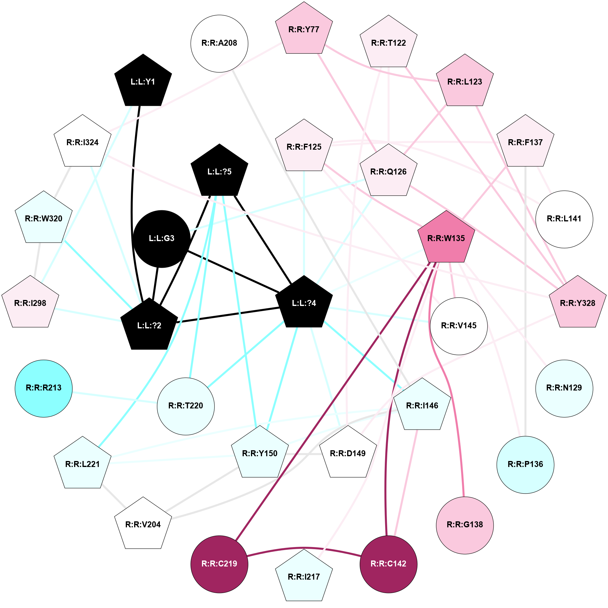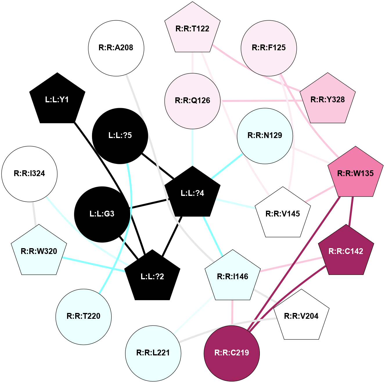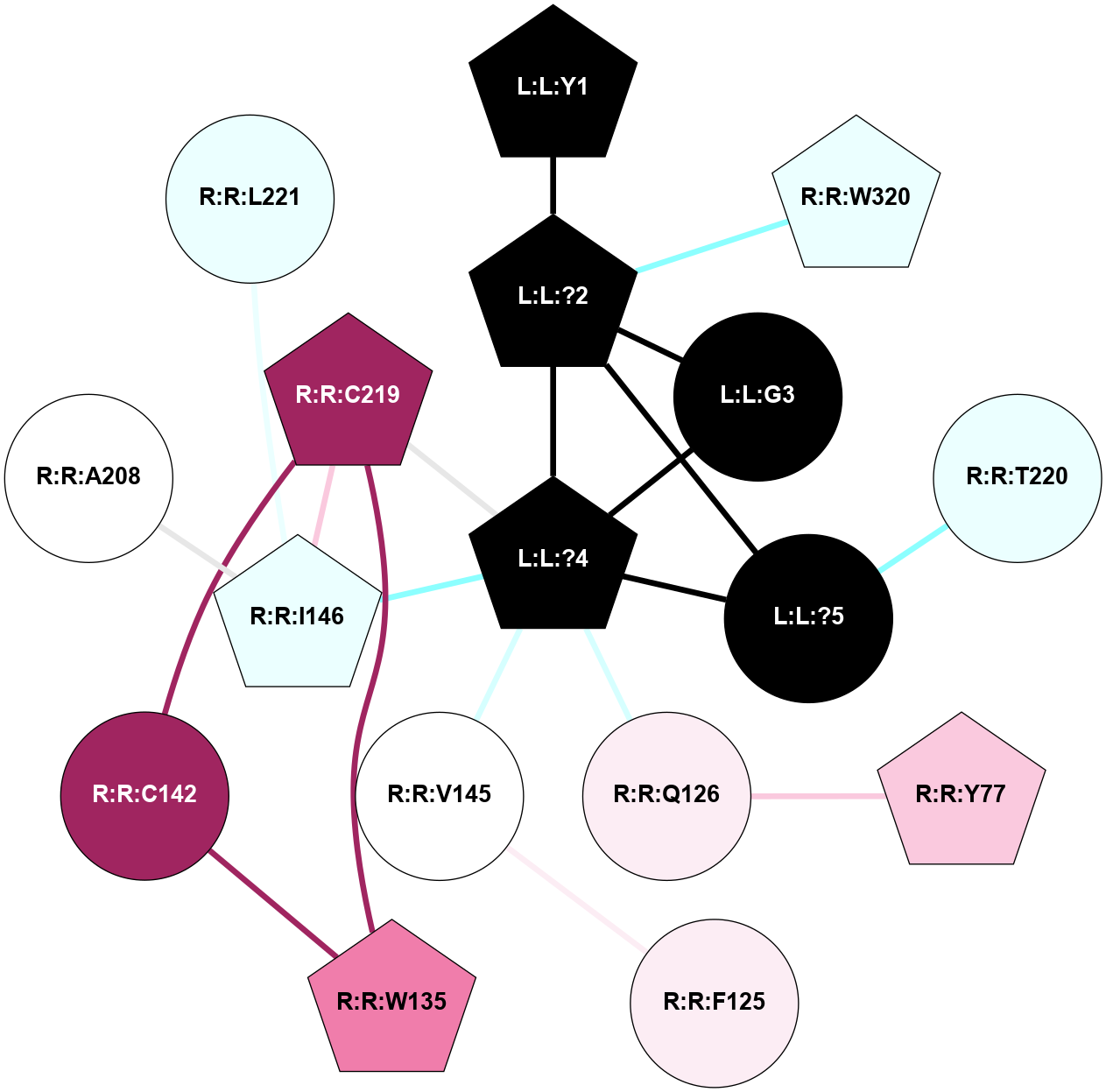 (Click to enlarge 🔍) | | Node1 | Node2 | LinkStrength | Comm | IsNode1Hub? | IsNode2Hub? | Node1Cons | Node2Cons | Node1Shell | Node2Shell | | L:L:?2 | L:L:Y1 | 14.31 | 6 | Yes | Yes | 0 | 0 | 1 | 2 | | L:L:?2 | L:L:G3 | 6.96 | 6 | Yes | No | 0 | 0 | 1 | 1 | | L:L:?2 | L:L:?4 | 4.87 | 6 | Yes | Yes | 0 | 0 | 1 | 0 | | L:L:?2 | L:L:?5 | 3.8 | 6 | Yes | No | 0 | 0 | 1 | 1 | | L:L:?2 | R:R:W320 | 13.9 | 6 | Yes | Yes | 0 | 4 | 1 | 2 | | L:L:?4 | L:L:G3 | 8.88 | 6 | Yes | No | 0 | 0 | 0 | 1 | | L:L:?4 | L:L:?5 | 20.99 | 6 | Yes | No | 0 | 0 | 0 | 1 | | L:L:?4 | R:R:Q126 | 14.97 | 6 | Yes | No | 0 | 6 | 0 | 1 | | L:L:?4 | R:R:V145 | 3.87 | 6 | Yes | No | 0 | 5 | 0 | 1 | | L:L:?4 | R:R:I146 | 8.64 | 6 | Yes | Yes | 0 | 4 | 0 | 1 | | L:L:?4 | R:R:C219 | 4.12 | 6 | Yes | Yes | 0 | 9 | 0 | 1 | | L:L:?5 | R:R:T220 | 3.97 | 6 | No | No | 0 | 4 | 1 | 2 | | R:R:Q126 | R:R:Y77 | 7.89 | 0 | No | Yes | 6 | 7 | 1 | 2 | | R:R:F125 | R:R:V145 | 3.93 | 0 | No | No | 6 | 5 | 2 | 1 | | R:R:C142 | R:R:W135 | 5.22 | 6 | No | Yes | 9 | 8 | 2 | 2 | | R:R:C219 | R:R:W135 | 6.53 | 6 | Yes | Yes | 9 | 8 | 1 | 2 | | R:R:C142 | R:R:C219 | 7.28 | 6 | No | Yes | 9 | 9 | 2 | 1 | | R:R:A208 | R:R:I146 | 3.25 | 0 | No | Yes | 5 | 4 | 2 | 1 | | R:R:C219 | R:R:I146 | 3.27 | 6 | Yes | Yes | 9 | 4 | 1 | 1 | | R:R:I146 | R:R:L221 | 4.28 | 6 | Yes | No | 4 | 4 | 1 | 2 | |