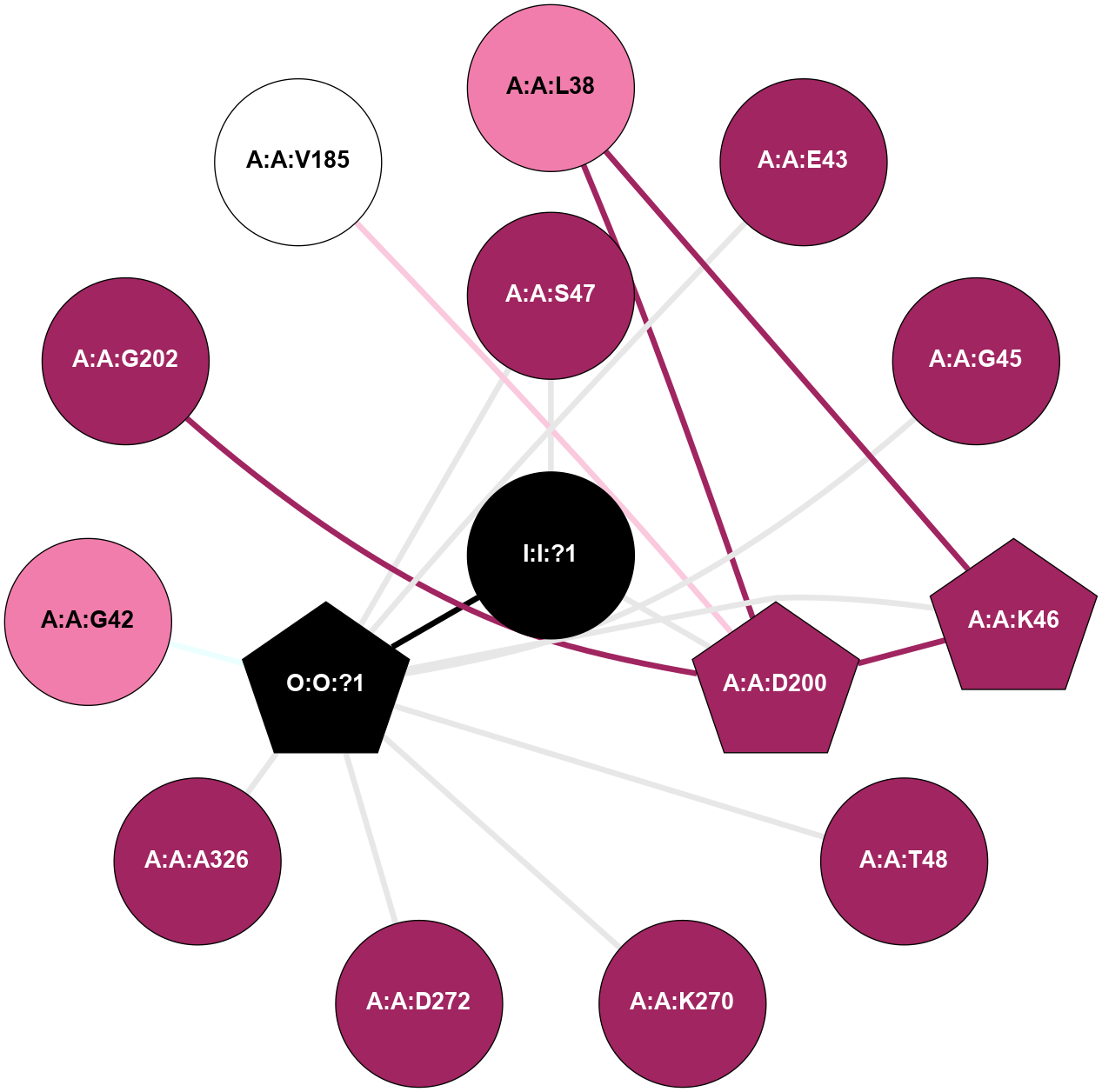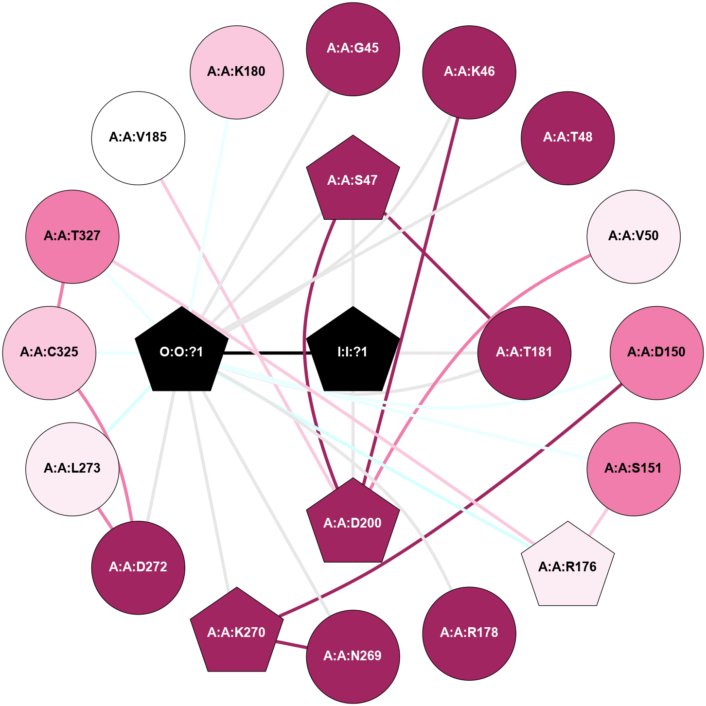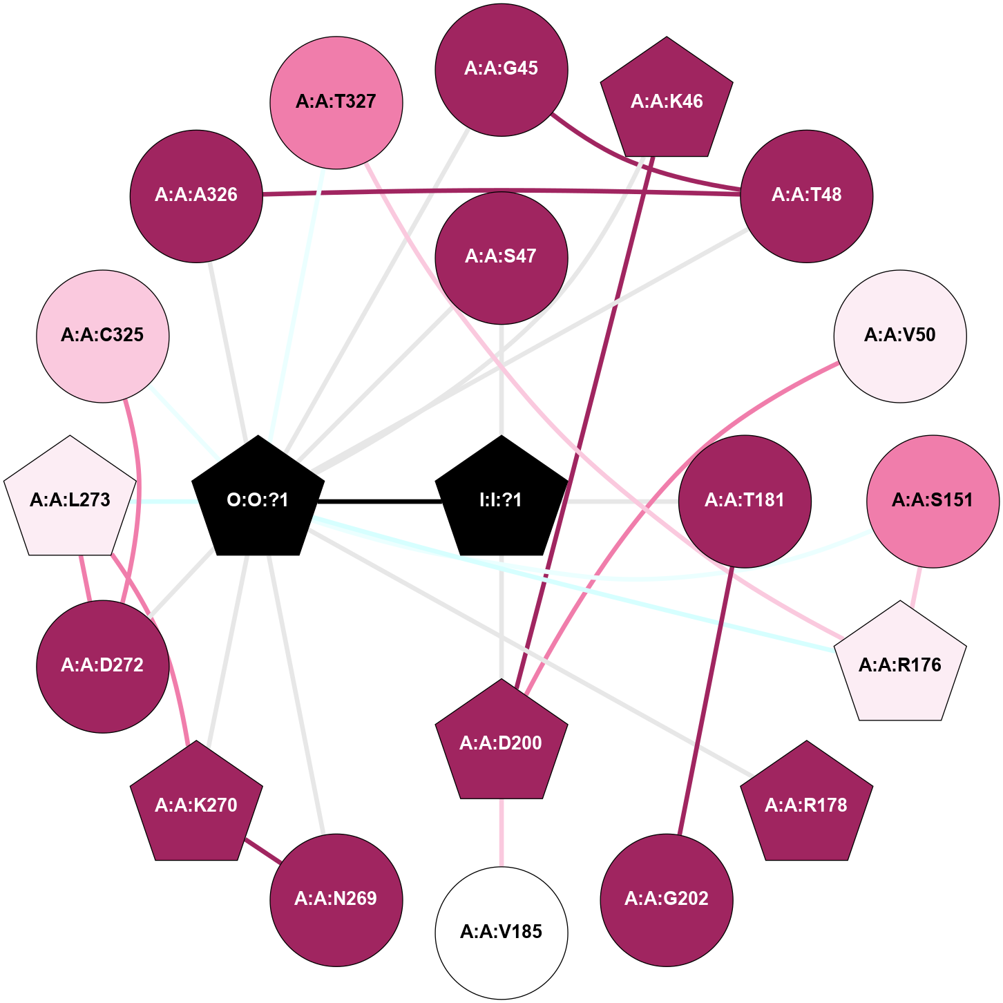 (Click to enlarge 🔍) | | Node1 | Node2 | LinkStrength | Comm | IsNode1Hub? | IsNode2Hub? | Node1Cons | Node2Cons | Node1Shell | Node2Shell | | A:A:G48 | I:I:?2 | 4.64 | 0 | No | Yes | 7 | 0 | 2 | 1 | | A:A:G51 | O:O:?1 | 7.42 | 0 | No | Yes | 9 | 0 | 2 | 1 | | A:A:D205 | A:A:K52 | 4.15 | 0 | No | Yes | 9 | 9 | 2 | 2 | | A:A:K52 | O:O:?1 | 10.71 | 0 | Yes | Yes | 9 | 0 | 2 | 1 | | A:A:S53 | A:A:T186 | 4.8 | 9 | Yes | No | 9 | 9 | 1 | 1 | | A:A:D205 | A:A:S53 | 5.89 | 0 | No | Yes | 9 | 9 | 2 | 1 | | A:A:S53 | I:I:?1 | 5.78 | 9 | Yes | Yes | 9 | 0 | 1 | 0 | | A:A:S53 | O:O:?1 | 6.52 | 9 | Yes | Yes | 9 | 0 | 1 | 1 | | A:A:T54 | O:O:?1 | 14.39 | 0 | No | Yes | 9 | 0 | 2 | 1 | | A:A:D155 | A:A:K275 | 6.91 | 9 | No | Yes | 8 | 9 | 2 | 2 | | A:A:D155 | O:O:?1 | 15.46 | 9 | No | Yes | 8 | 0 | 2 | 1 | | A:A:R183 | I:I:?2 | 6.59 | 9 | Yes | Yes | 9 | 0 | 2 | 1 | | A:A:R183 | O:O:?1 | 8.57 | 9 | Yes | Yes | 9 | 0 | 2 | 1 | | A:A:T186 | I:I:?2 | 4 | 9 | No | Yes | 9 | 0 | 1 | 1 | | A:A:T186 | I:I:?1 | 8.51 | 9 | No | Yes | 9 | 0 | 1 | 0 | | A:A:K275 | A:A:N274 | 5.6 | 9 | Yes | Yes | 9 | 9 | 2 | 2 | | A:A:N274 | O:O:?1 | 9.68 | 9 | Yes | Yes | 9 | 0 | 2 | 1 | | A:A:K275 | O:O:?1 | 18.36 | 9 | Yes | Yes | 9 | 0 | 2 | 1 | | A:A:D277 | O:O:?1 | 8.1 | 0 | Yes | Yes | 9 | 0 | 2 | 1 | | A:A:T332 | O:O:?1 | 16.79 | 0 | No | Yes | 9 | 0 | 2 | 1 | | I:I:?1 | I:I:?2 | 9.64 | 9 | Yes | Yes | 0 | 0 | 0 | 1 | | I:I:?2 | O:O:?1 | 13.58 | 9 | Yes | Yes | 0 | 0 | 1 | 1 | | I:I:?1 | O:O:?1 | 11.56 | 9 | Yes | Yes | 0 | 0 | 0 | 1 | |