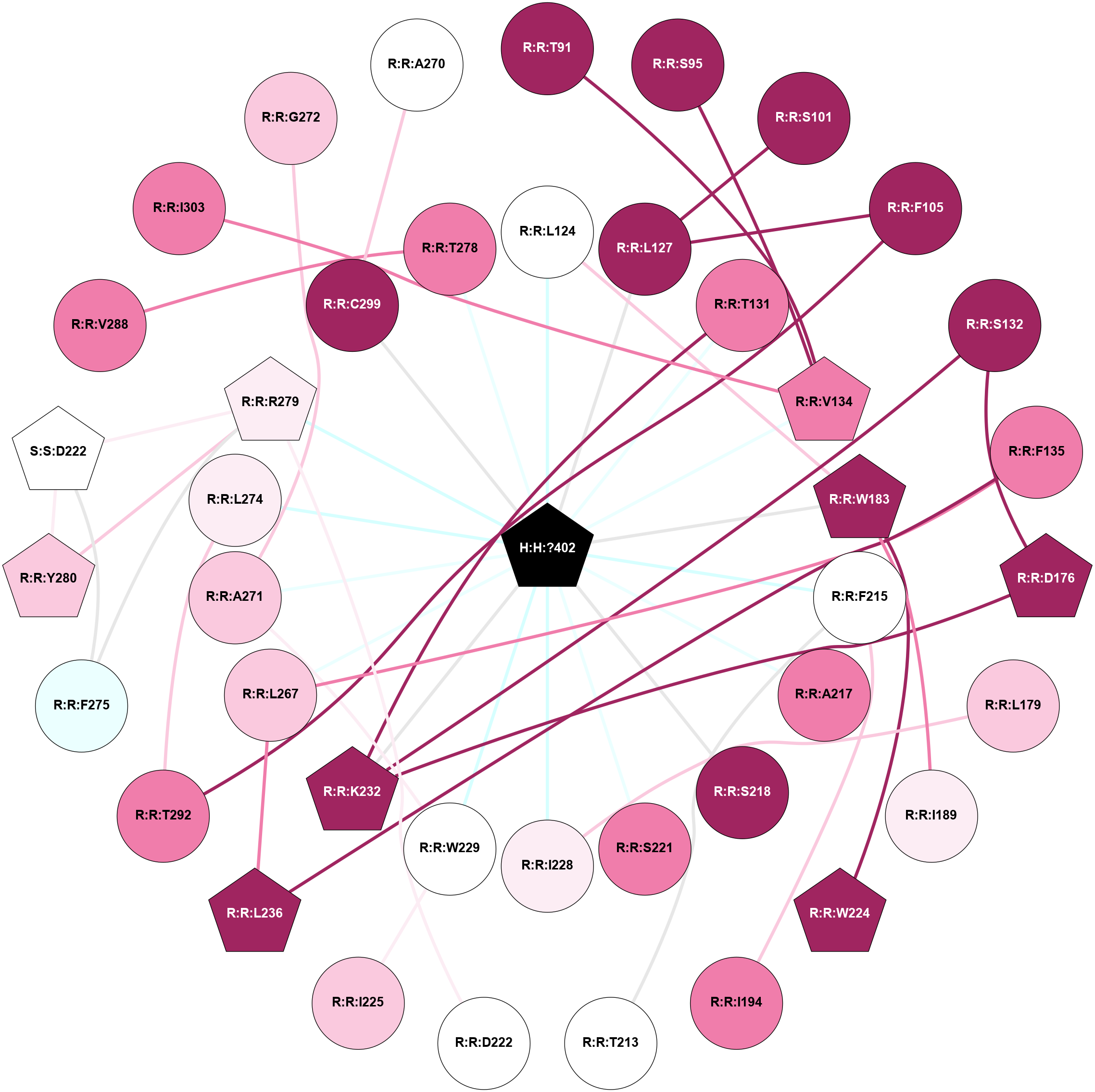 (Click to enlarge 🔍) | | Node1 | Node2 | LinkStrength | Comm | IsNode1Hub? | IsNode2Hub? | Node1Cons | Node2Cons | Node1Shell | Node2Shell | | H:H:?402 | R:R:L124 | 7.74 | 1 | Yes | No | 0 | 5 | 0 | 1 | | H:H:?402 | R:R:L127 | 3.22 | 1 | Yes | No | 0 | 9 | 0 | 1 | | H:H:?402 | R:R:T131 | 8.93 | 1 | Yes | No | 0 | 8 | 0 | 1 | | H:H:?402 | R:R:V134 | 3.47 | 1 | Yes | Yes | 0 | 8 | 0 | 1 | | H:H:?402 | R:R:W183 | 5.84 | 1 | Yes | Yes | 0 | 9 | 0 | 1 | | H:H:?402 | R:R:F215 | 3.97 | 1 | Yes | No | 0 | 5 | 0 | 1 | | H:H:?402 | R:R:A217 | 7.34 | 1 | Yes | No | 0 | 8 | 0 | 1 | | H:H:?402 | R:R:S218 | 4.2 | 1 | Yes | No | 0 | 9 | 0 | 1 | | H:H:?402 | R:R:S221 | 4.9 | 1 | Yes | No | 0 | 8 | 0 | 1 | | H:H:?402 | R:R:I228 | 3.99 | 1 | Yes | No | 0 | 6 | 0 | 1 | | H:H:?402 | R:R:W229 | 4.24 | 1 | Yes | No | 0 | 5 | 0 | 1 | | H:H:?402 | R:R:K232 | 3.94 | 1 | Yes | Yes | 0 | 9 | 0 | 1 | | H:H:?402 | R:R:L267 | 7.09 | 1 | Yes | No | 0 | 7 | 0 | 1 | | H:H:?402 | R:R:A271 | 3.67 | 1 | Yes | No | 0 | 7 | 0 | 1 | | H:H:?402 | R:R:L274 | 3.87 | 1 | Yes | No | 0 | 6 | 0 | 1 | | H:H:?402 | R:R:R279 | 7.92 | 1 | Yes | Yes | 0 | 6 | 0 | 1 | | H:H:?402 | R:R:C299 | 3.7 | 1 | Yes | No | 0 | 9 | 0 | 1 | | R:R:T91 | R:R:V134 | 4.76 | 0 | No | Yes | 9 | 8 | 2 | 1 | | R:R:S95 | R:R:V134 | 3.23 | 2 | No | Yes | 9 | 8 | 2 | 1 | | R:R:L127 | R:R:S101 | 9.01 | 0 | No | No | 9 | 9 | 1 | 2 | | R:R:F105 | R:R:L127 | 4.87 | 0 | No | No | 9 | 9 | 2 | 1 | | R:R:F105 | R:R:T292 | 7.78 | 0 | No | No | 9 | 8 | 2 | 2 | | R:R:L124 | R:R:W183 | 5.69 | 1 | No | Yes | 5 | 9 | 1 | 1 | | R:R:K232 | R:R:T131 | 4.5 | 1 | Yes | No | 9 | 8 | 1 | 1 | | R:R:D176 | R:R:S132 | 8.83 | 1 | Yes | No | 9 | 9 | 2 | 2 | | R:R:K232 | R:R:S132 | 4.59 | 1 | Yes | No | 9 | 9 | 1 | 2 | | R:R:F135 | R:R:L236 | 3.65 | 1 | No | Yes | 8 | 9 | 2 | 2 | | R:R:F135 | R:R:L267 | 4.87 | 1 | No | No | 8 | 7 | 2 | 1 | | R:R:D176 | R:R:K232 | 6.91 | 1 | Yes | Yes | 9 | 9 | 2 | 1 | | R:R:I228 | R:R:L179 | 4.28 | 0 | No | No | 6 | 7 | 1 | 2 | | R:R:I189 | R:R:W183 | 5.87 | 0 | No | Yes | 6 | 9 | 2 | 1 | | R:R:W183 | R:R:W224 | 20.62 | 1 | Yes | Yes | 9 | 9 | 1 | 2 | | R:R:F215 | R:R:I194 | 3.77 | 0 | No | No | 5 | 8 | 1 | 2 | | R:R:F215 | R:R:T213 | 5.19 | 0 | No | No | 5 | 5 | 1 | 2 | | R:R:D222 | R:R:R279 | 10.72 | 1 | No | Yes | 5 | 6 | 2 | 1 | | R:R:I225 | R:R:W229 | 9.4 | 0 | No | No | 7 | 5 | 2 | 1 | | R:R:A271 | R:R:W229 | 5.19 | 1 | No | No | 7 | 5 | 1 | 1 | | R:R:L236 | R:R:L267 | 4.15 | 1 | Yes | No | 9 | 7 | 2 | 1 | | R:R:L274 | R:R:T292 | 5.9 | 0 | No | No | 6 | 8 | 1 | 2 | | R:R:F275 | R:R:R279 | 9.62 | 1 | No | Yes | 4 | 6 | 2 | 1 | | R:R:F275 | S:S:D222 | 3.58 | 1 | No | Yes | 4 | 5 | 2 | 2 | | R:R:R279 | R:R:Y280 | 4.12 | 1 | Yes | Yes | 6 | 7 | 1 | 2 | | R:R:R279 | S:S:D222 | 13.1 | 1 | Yes | Yes | 6 | 5 | 1 | 2 | | R:R:Y280 | S:S:D222 | 11.49 | 1 | Yes | Yes | 7 | 5 | 2 | 2 | | R:R:T278 | R:R:V288 | 3.17 | 0 | No | No | 8 | 8 | 1 | 2 | | R:R:I303 | R:R:V134 | 3.07 | 0 | No | Yes | 8 | 8 | 2 | 1 | | H:H:?402 | R:R:T278 | 2.75 | 1 | Yes | No | 0 | 8 | 0 | 1 | | R:R:A271 | R:R:G272 | 1.95 | 1 | No | No | 7 | 7 | 1 | 2 | | R:R:A270 | R:R:C299 | 1.81 | 0 | No | No | 5 | 9 | 2 | 1 | |