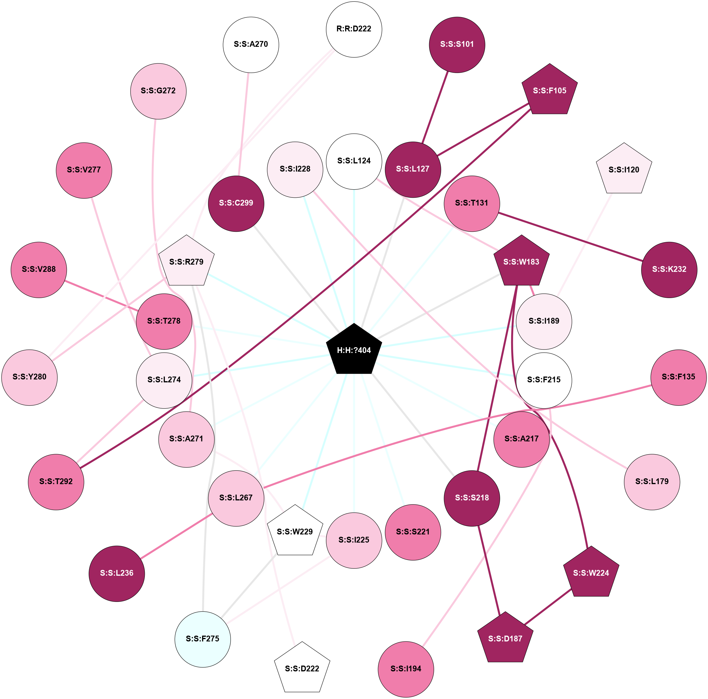 (Click to enlarge 🔍) | | Node1 | Node2 | LinkStrength | Comm | IsNode1Hub? | IsNode2Hub? | Node1Cons | Node2Cons | Node1Shell | Node2Shell | | H:H:?404 | S:S:L124 | 7.74 | 1 | Yes | No | 0 | 5 | 0 | 1 | | H:H:?404 | S:S:L127 | 3.87 | 1 | Yes | No | 0 | 9 | 0 | 1 | | H:H:?404 | S:S:T131 | 5.49 | 1 | Yes | No | 0 | 8 | 0 | 1 | | H:H:?404 | S:S:W183 | 8.49 | 1 | Yes | Yes | 0 | 9 | 0 | 1 | | H:H:?404 | S:S:I189 | 3.32 | 1 | Yes | No | 0 | 6 | 0 | 1 | | H:H:?404 | S:S:F215 | 6.24 | 1 | Yes | No | 0 | 5 | 0 | 1 | | H:H:?404 | S:S:A217 | 3.67 | 1 | Yes | No | 0 | 8 | 0 | 1 | | H:H:?404 | S:S:S218 | 3.5 | 1 | Yes | No | 0 | 9 | 0 | 1 | | H:H:?404 | S:S:S221 | 4.9 | 1 | Yes | No | 0 | 8 | 0 | 1 | | H:H:?404 | S:S:I225 | 4.65 | 1 | Yes | No | 0 | 7 | 0 | 1 | | H:H:?404 | S:S:W229 | 14.32 | 1 | Yes | Yes | 0 | 5 | 0 | 1 | | H:H:?404 | S:S:L267 | 7.09 | 1 | Yes | No | 0 | 7 | 0 | 1 | | H:H:?404 | S:S:A271 | 3.67 | 1 | Yes | No | 0 | 7 | 0 | 1 | | H:H:?404 | S:S:L274 | 4.51 | 1 | Yes | No | 0 | 6 | 0 | 1 | | H:H:?404 | S:S:T278 | 4.12 | 1 | Yes | No | 0 | 8 | 0 | 1 | | H:H:?404 | S:S:R279 | 6.79 | 1 | Yes | Yes | 0 | 6 | 0 | 1 | | H:H:?404 | S:S:C299 | 3.7 | 1 | Yes | No | 0 | 9 | 0 | 1 | | R:R:D222 | S:S:R279 | 15.48 | 1 | No | Yes | 5 | 6 | 2 | 1 | | R:R:D222 | S:S:Y280 | 11.49 | 1 | No | No | 5 | 7 | 2 | 2 | | S:S:L127 | S:S:S101 | 6.01 | 0 | No | No | 9 | 9 | 1 | 2 | | S:S:F105 | S:S:L127 | 8.53 | 0 | Yes | No | 9 | 9 | 2 | 1 | | S:S:F105 | S:S:T292 | 9.08 | 0 | Yes | No | 9 | 8 | 2 | 2 | | S:S:I120 | S:S:I189 | 4.42 | 0 | Yes | No | 6 | 6 | 2 | 1 | | S:S:L124 | S:S:W183 | 5.69 | 1 | No | Yes | 5 | 9 | 1 | 1 | | S:S:K232 | S:S:T131 | 4.5 | 15 | No | No | 9 | 8 | 2 | 1 | | S:S:F135 | S:S:L267 | 4.87 | 0 | No | No | 8 | 7 | 2 | 1 | | S:S:I228 | S:S:L179 | 4.28 | 0 | No | No | 6 | 7 | 1 | 2 | | S:S:I189 | S:S:W183 | 7.05 | 1 | No | Yes | 6 | 9 | 1 | 1 | | S:S:S218 | S:S:W183 | 4.94 | 1 | No | Yes | 9 | 9 | 1 | 1 | | S:S:W183 | S:S:W224 | 18.74 | 1 | Yes | Yes | 9 | 9 | 1 | 2 | | S:S:D187 | S:S:S218 | 5.89 | 1 | Yes | No | 9 | 9 | 2 | 1 | | S:S:D187 | S:S:W224 | 7.82 | 1 | Yes | Yes | 9 | 9 | 2 | 2 | | S:S:F215 | S:S:I194 | 3.77 | 0 | No | No | 5 | 8 | 1 | 2 | | S:S:D222 | S:S:R279 | 10.72 | 1 | Yes | Yes | 5 | 6 | 2 | 1 | | S:S:I225 | S:S:W229 | 7.05 | 1 | No | Yes | 7 | 5 | 1 | 1 | | S:S:F275 | S:S:I225 | 6.28 | 1 | No | No | 4 | 7 | 2 | 1 | | S:S:A271 | S:S:W229 | 3.89 | 1 | No | Yes | 7 | 5 | 1 | 1 | | S:S:F275 | S:S:W229 | 4.01 | 1 | No | Yes | 4 | 5 | 2 | 1 | | S:S:L236 | S:S:L267 | 5.54 | 0 | No | No | 9 | 7 | 2 | 1 | | S:S:L274 | S:S:T292 | 5.9 | 0 | No | No | 6 | 8 | 1 | 2 | | S:S:F275 | S:S:R279 | 11.76 | 1 | No | Yes | 4 | 6 | 2 | 1 | | S:S:R279 | S:S:Y280 | 5.14 | 1 | Yes | No | 6 | 7 | 1 | 2 | | S:S:T278 | S:S:V288 | 3.17 | 0 | No | No | 8 | 8 | 1 | 2 | | S:S:L274 | S:S:V277 | 2.98 | 0 | No | No | 6 | 8 | 1 | 2 | | H:H:?404 | S:S:I228 | 2.66 | 1 | Yes | No | 0 | 6 | 0 | 1 | | S:S:A271 | S:S:G272 | 1.95 | 1 | No | No | 7 | 7 | 1 | 2 | | S:S:A270 | S:S:C299 | 1.81 | 0 | No | No | 5 | 9 | 2 | 1 | |