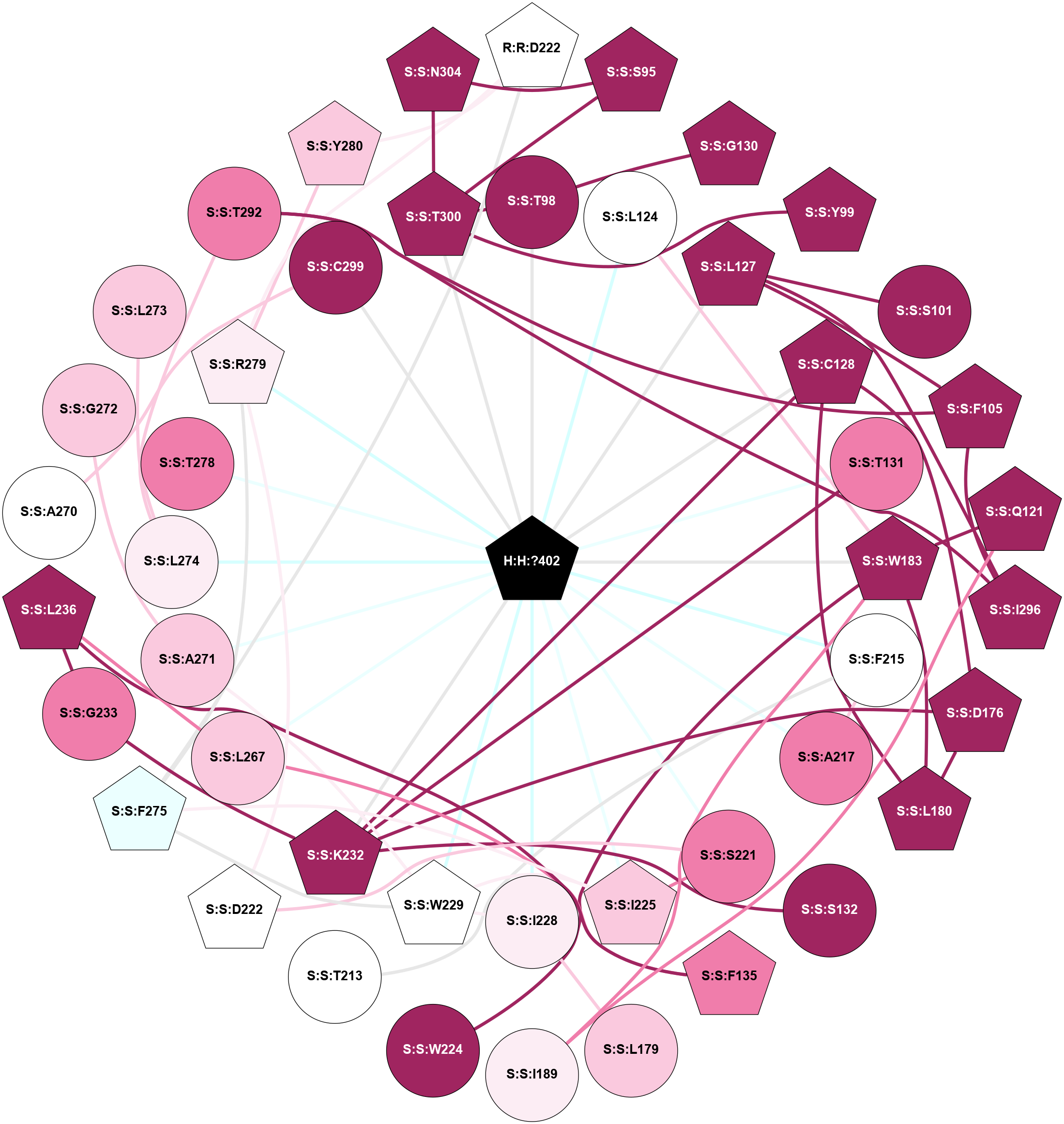 (Click to enlarge 🔍) | | Node1 | Node2 | LinkStrength | Comm | IsNode1Hub? | IsNode2Hub? | Node1Cons | Node2Cons | Node1Shell | Node2Shell | | H:H:?402 | S:S:T98 | 2.06 | 2 | Yes | No | 0 | 9 | 0 | 1 | | H:H:?402 | S:S:L124 | 8.38 | 2 | Yes | No | 0 | 5 | 0 | 1 | | H:H:?402 | S:S:L127 | 5.16 | 2 | Yes | Yes | 0 | 9 | 0 | 1 | | H:H:?402 | S:S:C128 | 2.96 | 2 | Yes | Yes | 0 | 9 | 0 | 1 | | H:H:?402 | S:S:T131 | 6.18 | 2 | Yes | No | 0 | 8 | 0 | 1 | | H:H:?402 | S:S:W183 | 11.14 | 2 | Yes | Yes | 0 | 9 | 0 | 1 | | H:H:?402 | S:S:F215 | 3.97 | 2 | Yes | No | 0 | 5 | 0 | 1 | | H:H:?402 | S:S:A217 | 4.4 | 2 | Yes | No | 0 | 8 | 0 | 1 | | H:H:?402 | S:S:S221 | 7.69 | 2 | Yes | No | 0 | 8 | 0 | 1 | | H:H:?402 | S:S:I225 | 3.32 | 2 | Yes | Yes | 0 | 7 | 0 | 1 | | H:H:?402 | S:S:I228 | 5.32 | 2 | Yes | No | 0 | 6 | 0 | 1 | | H:H:?402 | S:S:W229 | 11.67 | 2 | Yes | Yes | 0 | 5 | 0 | 1 | | H:H:?402 | S:S:K232 | 3.94 | 2 | Yes | Yes | 0 | 9 | 0 | 1 | | H:H:?402 | S:S:L267 | 5.16 | 2 | Yes | No | 0 | 7 | 0 | 1 | | H:H:?402 | S:S:A271 | 2.2 | 2 | Yes | No | 0 | 7 | 0 | 1 | | H:H:?402 | S:S:L274 | 5.8 | 2 | Yes | No | 0 | 6 | 0 | 1 | | H:H:?402 | S:S:T278 | 3.43 | 2 | Yes | No | 0 | 8 | 0 | 1 | | H:H:?402 | S:S:R279 | 7.92 | 2 | Yes | Yes | 0 | 6 | 0 | 1 | | H:H:?402 | S:S:C299 | 4.44 | 2 | Yes | No | 0 | 9 | 0 | 1 | | H:H:?402 | S:S:T300 | 2.75 | 2 | Yes | Yes | 0 | 9 | 0 | 1 | | R:R:D222 | S:S:F275 | 4.78 | 2 | Yes | Yes | 5 | 4 | 2 | 2 | | R:R:D222 | S:S:R279 | 10.72 | 2 | Yes | Yes | 5 | 6 | 2 | 1 | | R:R:D222 | S:S:Y280 | 5.75 | 2 | Yes | Yes | 5 | 7 | 2 | 2 | | S:S:S95 | S:S:T300 | 3.2 | 2 | Yes | Yes | 9 | 9 | 2 | 1 | | S:S:N304 | S:S:S95 | 10.43 | 2 | Yes | Yes | 9 | 9 | 2 | 2 | | S:S:G130 | S:S:T98 | 1.82 | 2 | Yes | No | 9 | 9 | 2 | 1 | | S:S:T300 | S:S:T98 | 7.85 | 2 | Yes | No | 9 | 9 | 1 | 1 | | S:S:T300 | S:S:Y99 | 12.48 | 2 | Yes | Yes | 9 | 9 | 1 | 2 | | S:S:L127 | S:S:S101 | 6.01 | 2 | Yes | No | 9 | 9 | 1 | 2 | | S:S:F105 | S:S:L127 | 2.44 | 2 | Yes | Yes | 9 | 9 | 2 | 1 | | S:S:F105 | S:S:T292 | 9.08 | 2 | Yes | No | 9 | 8 | 2 | 2 | | S:S:F105 | S:S:I296 | 2.51 | 2 | Yes | Yes | 9 | 9 | 2 | 2 | | S:S:Q121 | S:S:W183 | 5.48 | 2 | Yes | Yes | 9 | 9 | 2 | 1 | | S:S:I189 | S:S:Q121 | 6.86 | 2 | No | Yes | 6 | 9 | 2 | 2 | | S:S:L124 | S:S:W183 | 5.69 | 2 | No | Yes | 5 | 9 | 1 | 1 | | S:S:I296 | S:S:L127 | 2.85 | 2 | Yes | Yes | 9 | 9 | 2 | 1 | | S:S:C128 | S:S:D176 | 10.89 | 2 | Yes | Yes | 9 | 9 | 1 | 2 | | S:S:C128 | S:S:L180 | 4.76 | 2 | Yes | Yes | 9 | 9 | 1 | 2 | | S:S:C128 | S:S:K232 | 3.23 | 2 | Yes | Yes | 9 | 9 | 1 | 1 | | S:S:K232 | S:S:T131 | 6.01 | 2 | Yes | No | 9 | 8 | 1 | 1 | | S:S:K232 | S:S:S132 | 3.06 | 2 | Yes | No | 9 | 9 | 1 | 2 | | S:S:F135 | S:S:L236 | 4.87 | 2 | Yes | Yes | 8 | 9 | 2 | 2 | | S:S:F135 | S:S:L267 | 3.65 | 2 | Yes | No | 8 | 7 | 2 | 1 | | S:S:D176 | S:S:L180 | 8.14 | 2 | Yes | Yes | 9 | 9 | 2 | 2 | | S:S:D176 | S:S:K232 | 2.77 | 2 | Yes | Yes | 9 | 9 | 2 | 1 | | S:S:I228 | S:S:L179 | 2.85 | 2 | No | No | 6 | 7 | 1 | 2 | | S:S:L180 | S:S:W183 | 2.28 | 2 | Yes | Yes | 9 | 9 | 2 | 1 | | S:S:I189 | S:S:W183 | 7.05 | 2 | No | Yes | 6 | 9 | 2 | 1 | | S:S:W183 | S:S:W224 | 16.87 | 2 | Yes | No | 9 | 9 | 1 | 2 | | S:S:F215 | S:S:T213 | 6.49 | 2 | No | No | 5 | 5 | 1 | 2 | | S:S:A217 | S:S:F215 | 2.77 | 2 | No | No | 8 | 5 | 1 | 1 | | S:S:D222 | S:S:S221 | 2.94 | 2 | Yes | No | 5 | 8 | 2 | 1 | | S:S:I225 | S:S:S221 | 3.1 | 2 | Yes | No | 7 | 8 | 1 | 1 | | S:S:D222 | S:S:R279 | 8.34 | 2 | Yes | Yes | 5 | 6 | 2 | 1 | | S:S:I225 | S:S:W229 | 9.4 | 2 | Yes | Yes | 7 | 5 | 1 | 1 | | S:S:F275 | S:S:I225 | 2.51 | 2 | Yes | Yes | 4 | 7 | 2 | 1 | | S:S:I228 | S:S:W229 | 3.52 | 2 | No | Yes | 6 | 5 | 1 | 1 | | S:S:A271 | S:S:W229 | 3.89 | 2 | No | Yes | 7 | 5 | 1 | 1 | | S:S:F275 | S:S:W229 | 4.01 | 2 | Yes | Yes | 4 | 5 | 2 | 1 | | S:S:G233 | S:S:K232 | 1.74 | 0 | No | Yes | 8 | 9 | 2 | 1 | | S:S:G233 | S:S:L236 | 3.42 | 0 | No | Yes | 8 | 9 | 2 | 2 | | S:S:L236 | S:S:L267 | 6.92 | 2 | Yes | No | 9 | 7 | 2 | 1 | | S:S:A270 | S:S:C299 | 1.81 | 0 | No | No | 5 | 9 | 2 | 1 | | S:S:A271 | S:S:G272 | 1.95 | 2 | No | No | 7 | 7 | 1 | 2 | | S:S:L273 | S:S:L274 | 4.15 | 0 | No | No | 7 | 6 | 2 | 1 | | S:S:L274 | S:S:T292 | 5.9 | 0 | No | No | 6 | 8 | 1 | 2 | | S:S:F275 | S:S:R279 | 11.76 | 2 | Yes | Yes | 4 | 6 | 2 | 1 | | S:S:R279 | S:S:Y280 | 8.23 | 2 | Yes | Yes | 6 | 7 | 1 | 2 | | S:S:I296 | S:S:T292 | 3.04 | 2 | Yes | No | 9 | 8 | 2 | 2 | | S:S:N304 | S:S:T300 | 2.92 | 2 | Yes | Yes | 9 | 9 | 2 | 1 | |
