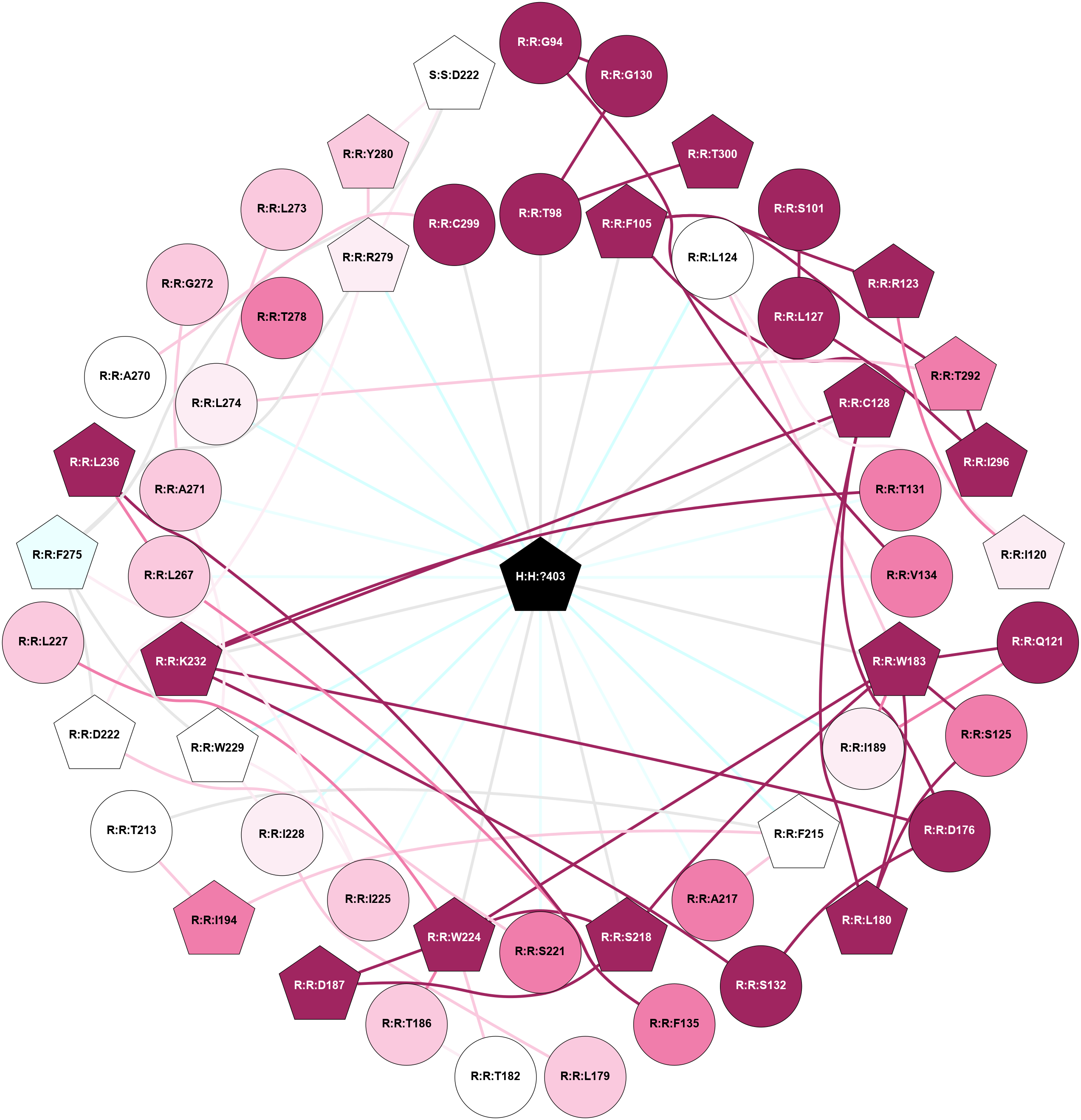 (Click to enlarge 🔍) | | Node1 | Node2 | LinkStrength | Comm | IsNode1Hub? | IsNode2Hub? | Node1Cons | Node2Cons | Node1Shell | Node2Shell | | H:H:?403 | R:R:T98 | 2.06 | 2 | Yes | No | 0 | 9 | 0 | 1 | | H:H:?403 | R:R:F105 | 2.27 | 2 | Yes | Yes | 0 | 9 | 0 | 1 | | H:H:?403 | R:R:L124 | 7.09 | 2 | Yes | No | 0 | 5 | 0 | 1 | | H:H:?403 | R:R:L127 | 9.67 | 2 | Yes | No | 0 | 9 | 0 | 1 | | H:H:?403 | R:R:C128 | 3.7 | 2 | Yes | Yes | 0 | 9 | 0 | 1 | | H:H:?403 | R:R:T131 | 7.55 | 2 | Yes | No | 0 | 8 | 0 | 1 | | H:H:?403 | R:R:V134 | 3.47 | 2 | Yes | No | 0 | 8 | 0 | 1 | | H:H:?403 | R:R:W183 | 5.31 | 2 | Yes | Yes | 0 | 9 | 0 | 1 | | H:H:?403 | R:R:I189 | 2.66 | 2 | Yes | No | 0 | 6 | 0 | 1 | | H:H:?403 | R:R:F215 | 3.4 | 2 | Yes | Yes | 0 | 5 | 0 | 1 | | H:H:?403 | R:R:A217 | 8.07 | 2 | Yes | No | 0 | 8 | 0 | 1 | | H:H:?403 | R:R:S218 | 3.5 | 2 | Yes | Yes | 0 | 9 | 0 | 1 | | H:H:?403 | R:R:S221 | 7.69 | 2 | Yes | No | 0 | 8 | 0 | 1 | | H:H:?403 | R:R:W224 | 2.12 | 2 | Yes | Yes | 0 | 9 | 0 | 1 | | H:H:?403 | R:R:I225 | 2.66 | 2 | Yes | No | 0 | 7 | 0 | 1 | | H:H:?403 | R:R:I228 | 3.99 | 2 | Yes | No | 0 | 6 | 0 | 1 | | H:H:?403 | R:R:W229 | 9.02 | 2 | Yes | Yes | 0 | 5 | 0 | 1 | | H:H:?403 | R:R:K232 | 3.94 | 2 | Yes | Yes | 0 | 9 | 0 | 1 | | H:H:?403 | R:R:L267 | 6.45 | 2 | Yes | No | 0 | 7 | 0 | 1 | | H:H:?403 | R:R:A271 | 2.2 | 2 | Yes | No | 0 | 7 | 0 | 1 | | H:H:?403 | R:R:L274 | 5.8 | 2 | Yes | No | 0 | 6 | 0 | 1 | | H:H:?403 | R:R:T278 | 4.12 | 2 | Yes | No | 0 | 8 | 0 | 1 | | H:H:?403 | R:R:R279 | 7.36 | 2 | Yes | Yes | 0 | 6 | 0 | 1 | | H:H:?403 | R:R:C299 | 2.96 | 2 | Yes | No | 0 | 9 | 0 | 1 | | R:R:G130 | R:R:G94 | 2.11 | 0 | No | No | 9 | 9 | 2 | 2 | | R:R:G94 | R:R:V134 | 1.84 | 0 | No | No | 9 | 8 | 2 | 1 | | R:R:G130 | R:R:T98 | 1.82 | 0 | No | No | 9 | 9 | 2 | 1 | | R:R:T300 | R:R:T98 | 4.71 | 3 | Yes | No | 9 | 9 | 2 | 1 | | R:R:L127 | R:R:S101 | 6.01 | 0 | No | No | 9 | 9 | 1 | 2 | | R:R:F105 | R:R:R123 | 21.38 | 2 | Yes | Yes | 9 | 9 | 1 | 2 | | R:R:F105 | R:R:T292 | 10.38 | 2 | Yes | Yes | 9 | 8 | 1 | 2 | | R:R:F105 | R:R:I296 | 2.51 | 2 | Yes | Yes | 9 | 9 | 1 | 2 | | R:R:I120 | R:R:R123 | 7.52 | 0 | Yes | Yes | 6 | 9 | 2 | 2 | | R:R:I120 | R:R:L124 | 2.85 | 0 | Yes | No | 6 | 5 | 2 | 1 | | R:R:Q121 | R:R:W183 | 3.29 | 2 | No | Yes | 9 | 9 | 2 | 1 | | R:R:I189 | R:R:Q121 | 5.49 | 2 | No | No | 6 | 9 | 1 | 2 | | R:R:L124 | R:R:W183 | 4.56 | 2 | No | Yes | 5 | 9 | 1 | 1 | | R:R:L180 | R:R:S125 | 10.51 | 2 | Yes | No | 9 | 8 | 2 | 2 | | R:R:S125 | R:R:W183 | 2.47 | 2 | No | Yes | 8 | 9 | 2 | 1 | | R:R:I296 | R:R:L127 | 5.71 | 2 | Yes | No | 9 | 9 | 2 | 1 | | R:R:C128 | R:R:D176 | 4.67 | 2 | Yes | No | 9 | 9 | 1 | 2 | | R:R:C128 | R:R:L180 | 6.35 | 2 | Yes | Yes | 9 | 9 | 1 | 2 | | R:R:C128 | R:R:K232 | 4.85 | 2 | Yes | Yes | 9 | 9 | 1 | 1 | | R:R:K232 | R:R:T131 | 6.01 | 2 | Yes | No | 9 | 8 | 1 | 1 | | R:R:D176 | R:R:S132 | 8.83 | 2 | No | No | 9 | 9 | 2 | 2 | | R:R:K232 | R:R:S132 | 4.59 | 2 | Yes | No | 9 | 9 | 1 | 2 | | R:R:F135 | R:R:L236 | 6.09 | 2 | No | Yes | 8 | 9 | 2 | 2 | | R:R:F135 | R:R:L267 | 6.09 | 2 | No | No | 8 | 7 | 2 | 1 | | R:R:D176 | R:R:K232 | 6.91 | 2 | No | Yes | 9 | 9 | 2 | 1 | | R:R:I228 | R:R:L179 | 4.28 | 2 | No | No | 6 | 7 | 1 | 2 | | R:R:L180 | R:R:W183 | 2.28 | 2 | Yes | Yes | 9 | 9 | 2 | 1 | | R:R:T182 | R:R:T186 | 6.28 | 2 | No | No | 5 | 7 | 2 | 2 | | R:R:T182 | R:R:W224 | 2.43 | 2 | No | Yes | 5 | 9 | 2 | 1 | | R:R:I189 | R:R:W183 | 7.05 | 2 | No | Yes | 6 | 9 | 1 | 1 | | R:R:S218 | R:R:W183 | 2.47 | 2 | Yes | Yes | 9 | 9 | 1 | 1 | | R:R:W183 | R:R:W224 | 19.68 | 2 | Yes | Yes | 9 | 9 | 1 | 1 | | R:R:T186 | R:R:W224 | 2.43 | 2 | No | Yes | 7 | 9 | 2 | 1 | | R:R:D187 | R:R:S218 | 8.83 | 2 | Yes | Yes | 9 | 9 | 2 | 1 | | R:R:D187 | R:R:W224 | 13.4 | 2 | Yes | Yes | 9 | 9 | 2 | 1 | | R:R:I194 | R:R:T213 | 3.04 | 2 | Yes | No | 8 | 5 | 2 | 2 | | R:R:F215 | R:R:I194 | 3.77 | 2 | Yes | Yes | 5 | 8 | 1 | 2 | | R:R:F215 | R:R:T213 | 7.78 | 2 | Yes | No | 5 | 5 | 1 | 2 | | R:R:A217 | R:R:F215 | 2.77 | 2 | No | Yes | 8 | 5 | 1 | 1 | | R:R:S218 | R:R:W224 | 2.47 | 2 | Yes | Yes | 9 | 9 | 1 | 1 | | R:R:D222 | R:R:S221 | 2.94 | 2 | Yes | No | 5 | 8 | 2 | 1 | | R:R:D222 | R:R:F275 | 2.39 | 2 | Yes | Yes | 5 | 4 | 2 | 2 | | R:R:D222 | R:R:R279 | 11.91 | 2 | Yes | Yes | 5 | 6 | 2 | 1 | | R:R:L227 | R:R:W224 | 2.28 | 0 | No | Yes | 7 | 9 | 2 | 1 | | R:R:I225 | R:R:W229 | 8.22 | 2 | No | Yes | 7 | 5 | 1 | 1 | | R:R:F275 | R:R:I225 | 8.79 | 2 | Yes | No | 4 | 7 | 2 | 1 | | R:R:I228 | R:R:W229 | 4.7 | 2 | No | Yes | 6 | 5 | 1 | 1 | | R:R:A271 | R:R:W229 | 3.89 | 2 | No | Yes | 7 | 5 | 1 | 1 | | R:R:F275 | R:R:W229 | 6.01 | 2 | Yes | Yes | 4 | 5 | 2 | 1 | | R:R:L236 | R:R:L267 | 6.92 | 2 | Yes | No | 9 | 7 | 2 | 1 | | R:R:A270 | R:R:C299 | 1.81 | 0 | No | No | 5 | 9 | 2 | 1 | | R:R:A271 | R:R:G272 | 1.95 | 2 | No | No | 7 | 7 | 1 | 2 | | R:R:L273 | R:R:L274 | 2.77 | 0 | No | No | 7 | 6 | 2 | 1 | | R:R:L274 | R:R:T292 | 5.9 | 0 | No | Yes | 6 | 8 | 1 | 2 | | R:R:F275 | R:R:R279 | 10.69 | 2 | Yes | Yes | 4 | 6 | 2 | 1 | | R:R:F275 | S:S:D222 | 3.58 | 2 | Yes | Yes | 4 | 5 | 2 | 2 | | R:R:R279 | R:R:Y280 | 7.2 | 2 | Yes | Yes | 6 | 7 | 1 | 2 | | R:R:R279 | S:S:D222 | 10.72 | 2 | Yes | Yes | 6 | 5 | 1 | 2 | | R:R:Y280 | S:S:D222 | 8.05 | 2 | Yes | Yes | 7 | 5 | 2 | 2 | | R:R:I296 | R:R:T292 | 3.04 | 2 | Yes | Yes | 9 | 8 | 2 | 2 | |