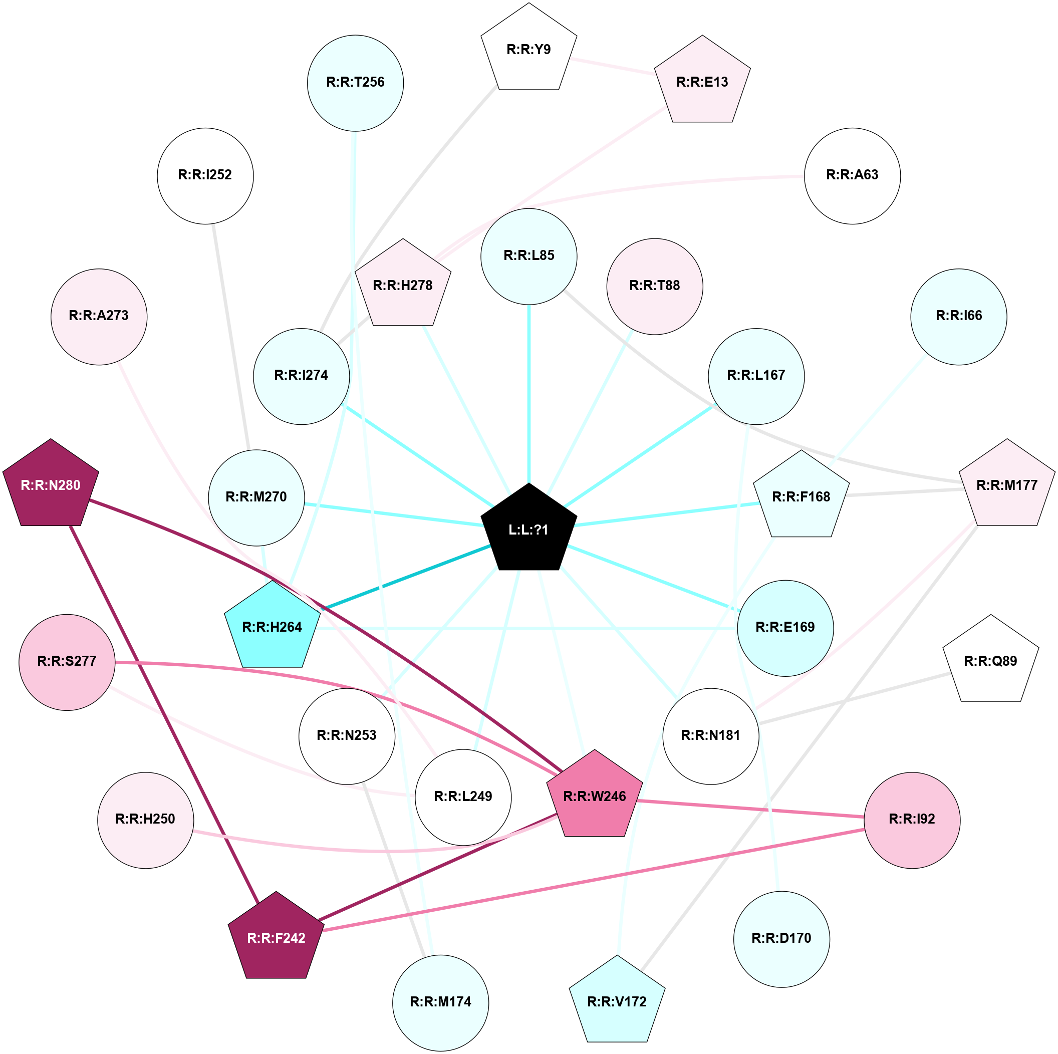 (Click to enlarge 🔍) | | Node1 | Node2 | LinkStrength | Comm | IsNode1Hub? | IsNode2Hub? | Node1Cons | Node2Cons | Node1Shell | Node2Shell | | L:L:?1 | R:R:L85 | 3.23 | 1 | Yes | No | 0 | 4 | 0 | 1 | | L:L:?1 | R:R:T88 | 8.6 | 1 | Yes | No | 0 | 6 | 0 | 1 | | L:L:?1 | R:R:L167 | 5.66 | 1 | Yes | No | 0 | 4 | 0 | 1 | | L:L:?1 | R:R:F168 | 29.15 | 1 | Yes | Yes | 0 | 4 | 0 | 1 | | L:L:?1 | R:R:E169 | 10.83 | 1 | Yes | No | 0 | 3 | 0 | 1 | | L:L:?1 | R:R:N181 | 4.01 | 1 | Yes | No | 0 | 5 | 0 | 1 | | L:L:?1 | R:R:W246 | 7.31 | 1 | Yes | Yes | 0 | 8 | 0 | 1 | | L:L:?1 | R:R:L249 | 8.89 | 1 | Yes | No | 0 | 5 | 0 | 1 | | L:L:?1 | R:R:N253 | 9.62 | 1 | Yes | No | 0 | 5 | 0 | 1 | | L:L:?1 | R:R:H264 | 15.76 | 1 | Yes | Yes | 0 | 2 | 0 | 1 | | L:L:?1 | R:R:M270 | 7.43 | 1 | Yes | No | 0 | 4 | 0 | 1 | | L:L:?1 | R:R:I274 | 4.17 | 1 | Yes | No | 0 | 4 | 0 | 1 | | L:L:?1 | R:R:H278 | 8.26 | 1 | Yes | Yes | 0 | 6 | 0 | 1 | | R:R:E13 | R:R:Y9 | 16.83 | 0 | Yes | Yes | 6 | 5 | 2 | 2 | | R:R:I274 | R:R:Y9 | 7.25 | 1 | No | Yes | 4 | 5 | 1 | 2 | | R:R:E13 | R:R:H278 | 8.62 | 0 | Yes | Yes | 6 | 6 | 2 | 1 | | R:R:A63 | R:R:H278 | 2.93 | 0 | No | Yes | 5 | 6 | 2 | 1 | | R:R:F168 | R:R:I66 | 3.77 | 1 | Yes | No | 4 | 4 | 1 | 2 | | R:R:L85 | R:R:M177 | 2.83 | 0 | No | Yes | 4 | 6 | 1 | 2 | | R:R:N181 | R:R:Q89 | 5.28 | 0 | No | Yes | 5 | 5 | 1 | 2 | | R:R:F242 | R:R:I92 | 6.28 | 1 | Yes | No | 9 | 7 | 2 | 2 | | R:R:I92 | R:R:W246 | 4.7 | 1 | No | Yes | 7 | 8 | 2 | 1 | | R:R:D170 | R:R:L167 | 9.5 | 0 | No | No | 4 | 4 | 2 | 1 | | R:R:F168 | R:R:V172 | 13.11 | 1 | Yes | Yes | 4 | 3 | 1 | 2 | | R:R:F168 | R:R:M177 | 7.46 | 1 | Yes | Yes | 4 | 6 | 1 | 2 | | R:R:E169 | R:R:H264 | 8.62 | 1 | No | Yes | 3 | 2 | 1 | 1 | | R:R:M177 | R:R:V172 | 3.04 | 1 | Yes | Yes | 6 | 3 | 2 | 2 | | R:R:M174 | R:R:N253 | 4.21 | 0 | No | No | 4 | 5 | 2 | 1 | | R:R:M174 | R:R:T256 | 3.01 | 0 | No | No | 4 | 4 | 2 | 2 | | R:R:M177 | R:R:N181 | 7.01 | 1 | Yes | No | 6 | 5 | 2 | 1 | | R:R:F242 | R:R:W246 | 13.03 | 1 | Yes | Yes | 9 | 8 | 2 | 1 | | R:R:F242 | R:R:N280 | 6.04 | 1 | Yes | Yes | 9 | 9 | 2 | 2 | | R:R:H250 | R:R:W246 | 5.29 | 1 | No | Yes | 6 | 8 | 2 | 1 | | R:R:S277 | R:R:W246 | 4.94 | 0 | No | Yes | 7 | 8 | 2 | 1 | | R:R:N280 | R:R:W246 | 6.78 | 1 | Yes | Yes | 9 | 8 | 2 | 1 | | R:R:A273 | R:R:L249 | 3.15 | 0 | No | No | 6 | 5 | 2 | 1 | | R:R:L249 | R:R:S277 | 6.01 | 0 | No | No | 5 | 7 | 1 | 2 | | R:R:I252 | R:R:M270 | 2.92 | 0 | No | No | 5 | 4 | 2 | 1 | | R:R:H264 | R:R:T256 | 5.48 | 1 | Yes | No | 2 | 4 | 1 | 2 | | R:R:H264 | R:R:M270 | 3.94 | 1 | Yes | No | 2 | 4 | 1 | 1 | | R:R:H278 | R:R:I274 | 5.3 | 1 | Yes | No | 6 | 4 | 1 | 1 | |