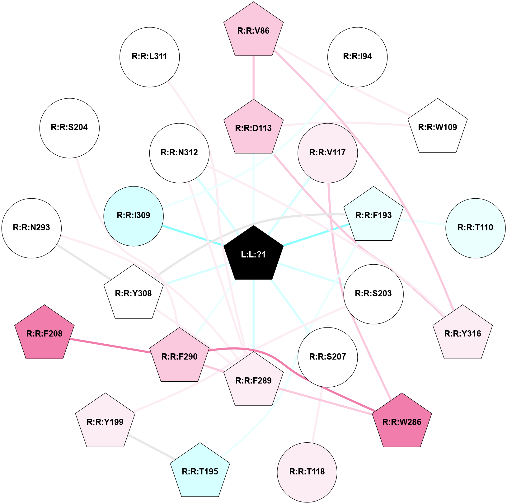 (Click to enlarge 🔍) | | Node1 | Node2 | LinkStrength | Comm | IsNode1Hub? | IsNode2Hub? | Node1Cons | Node2Cons | Node1Shell | Node2Shell | | L:L:?1 | R:R:D113 | 8.01 | 1 | Yes | Yes | 0 | 7 | 0 | 1 | | L:L:?1 | R:R:V117 | 5.86 | 1 | Yes | No | 0 | 6 | 0 | 1 | | L:L:?1 | R:R:F193 | 17.57 | 1 | Yes | Yes | 0 | 4 | 0 | 1 | | L:L:?1 | R:R:S203 | 11.82 | 1 | Yes | No | 0 | 5 | 0 | 1 | | L:L:?1 | R:R:S207 | 5.91 | 1 | Yes | No | 0 | 5 | 0 | 1 | | L:L:?1 | R:R:F289 | 6.39 | 1 | Yes | Yes | 0 | 6 | 0 | 1 | | L:L:?1 | R:R:F290 | 7.19 | 1 | Yes | Yes | 0 | 7 | 0 | 1 | | L:L:?1 | R:R:Y308 | 4.61 | 1 | Yes | Yes | 0 | 5 | 0 | 1 | | L:L:?1 | R:R:I309 | 4.68 | 1 | Yes | No | 0 | 3 | 0 | 1 | | L:L:?1 | R:R:N312 | 12.61 | 1 | Yes | No | 0 | 5 | 0 | 1 | | R:R:V86 | R:R:W109 | 7.36 | 1 | Yes | Yes | 7 | 5 | 2 | 2 | | R:R:D113 | R:R:V86 | 16.07 | 1 | Yes | Yes | 7 | 7 | 1 | 2 | | R:R:V86 | R:R:Y316 | 3.79 | 1 | Yes | Yes | 7 | 6 | 2 | 2 | | R:R:I309 | R:R:I94 | 5.89 | 0 | No | No | 3 | 5 | 1 | 2 | | R:R:D113 | R:R:W109 | 7.82 | 1 | Yes | Yes | 7 | 5 | 1 | 2 | | R:R:F193 | R:R:T110 | 3.89 | 1 | Yes | No | 4 | 4 | 1 | 2 | | R:R:D113 | R:R:Y316 | 10.34 | 1 | Yes | Yes | 7 | 6 | 1 | 2 | | R:R:V117 | R:R:W286 | 4.9 | 0 | No | Yes | 6 | 8 | 1 | 2 | | R:R:S207 | R:R:T118 | 9.59 | 0 | No | No | 5 | 6 | 1 | 2 | | R:R:F193 | R:R:T195 | 9.08 | 1 | Yes | Yes | 4 | 3 | 1 | 2 | | R:R:F193 | R:R:Y308 | 4.13 | 1 | Yes | Yes | 4 | 5 | 1 | 1 | | R:R:T195 | R:R:Y199 | 7.49 | 1 | Yes | Yes | 3 | 6 | 2 | 2 | | R:R:S203 | R:R:Y199 | 11.45 | 0 | No | Yes | 5 | 6 | 1 | 2 | | R:R:F208 | R:R:F290 | 21.43 | 0 | Yes | Yes | 8 | 7 | 2 | 1 | | R:R:F289 | R:R:W286 | 7.02 | 1 | Yes | Yes | 6 | 8 | 1 | 2 | | R:R:F290 | R:R:W286 | 10.02 | 1 | Yes | Yes | 7 | 8 | 1 | 2 | | R:R:F289 | R:R:F290 | 4.29 | 1 | Yes | Yes | 6 | 7 | 1 | 1 | | R:R:F289 | R:R:N293 | 13.29 | 1 | Yes | No | 6 | 5 | 1 | 2 | | R:R:F289 | R:R:Y308 | 6.19 | 1 | Yes | Yes | 6 | 5 | 1 | 1 | | R:R:F289 | R:R:N312 | 10.87 | 1 | Yes | No | 6 | 5 | 1 | 1 | | R:R:N293 | R:R:Y308 | 3.49 | 1 | No | Yes | 5 | 5 | 2 | 1 | | R:R:N312 | R:R:Y316 | 9.3 | 1 | No | Yes | 5 | 6 | 1 | 2 | | R:R:F290 | R:R:S204 | 2.64 | 1 | Yes | No | 7 | 5 | 1 | 2 | | R:R:F289 | R:R:L311 | 2.44 | 1 | Yes | No | 6 | 5 | 1 | 2 | |