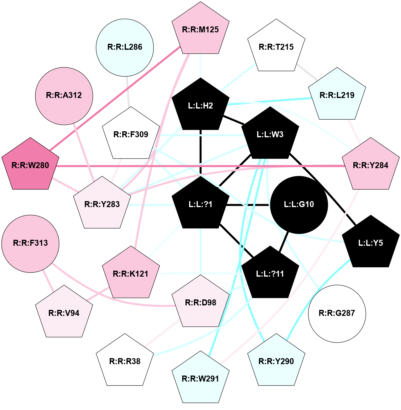 (Click to enlarge 🔍) | | Node1 | Node2 | LinkStrength | Comm | IsNode1Hub? | IsNode2Hub? | Node1Cons | Node2Cons | Node1Shell | Node2Shell | | L:L:?1 | L:L:R2 | 2.59 | 0 | Yes | No | 0 | 0 | 0 | 1 | | L:L:?1 | L:L:P3 | 7 | 0 | Yes | No | 0 | 0 | 0 | 1 | | L:L:?1 | R:R:D284 | 5.79 | 0 | Yes | Yes | 0 | 4 | 0 | 1 | | L:L:?1 | R:R:L285 | 5.9 | 0 | Yes | No | 0 | 3 | 0 | 1 | | L:L:R2 | R:R:S275 | 5.27 | 0 | No | No | 0 | 4 | 1 | 2 | | R:R:W279 | R:R:Y271 | 6.75 | 12 | Yes | Yes | 1 | 4 | 2 | 2 | | R:R:D284 | R:R:Y271 | 9.2 | 12 | Yes | Yes | 4 | 4 | 1 | 2 | | R:R:M288 | R:R:Y271 | 17.96 | 12 | No | Yes | 4 | 4 | 2 | 2 | | R:R:S275 | R:R:W279 | 11.12 | 0 | No | Yes | 4 | 1 | 2 | 2 | | R:R:D284 | R:R:W279 | 15.63 | 12 | Yes | Yes | 4 | 1 | 1 | 2 | | R:R:C281 | R:R:L285 | 3.17 | 0 | No | No | 8 | 3 | 2 | 1 | | R:R:D284 | R:R:M288 | 2.77 | 12 | Yes | No | 4 | 4 | 1 | 2 | |