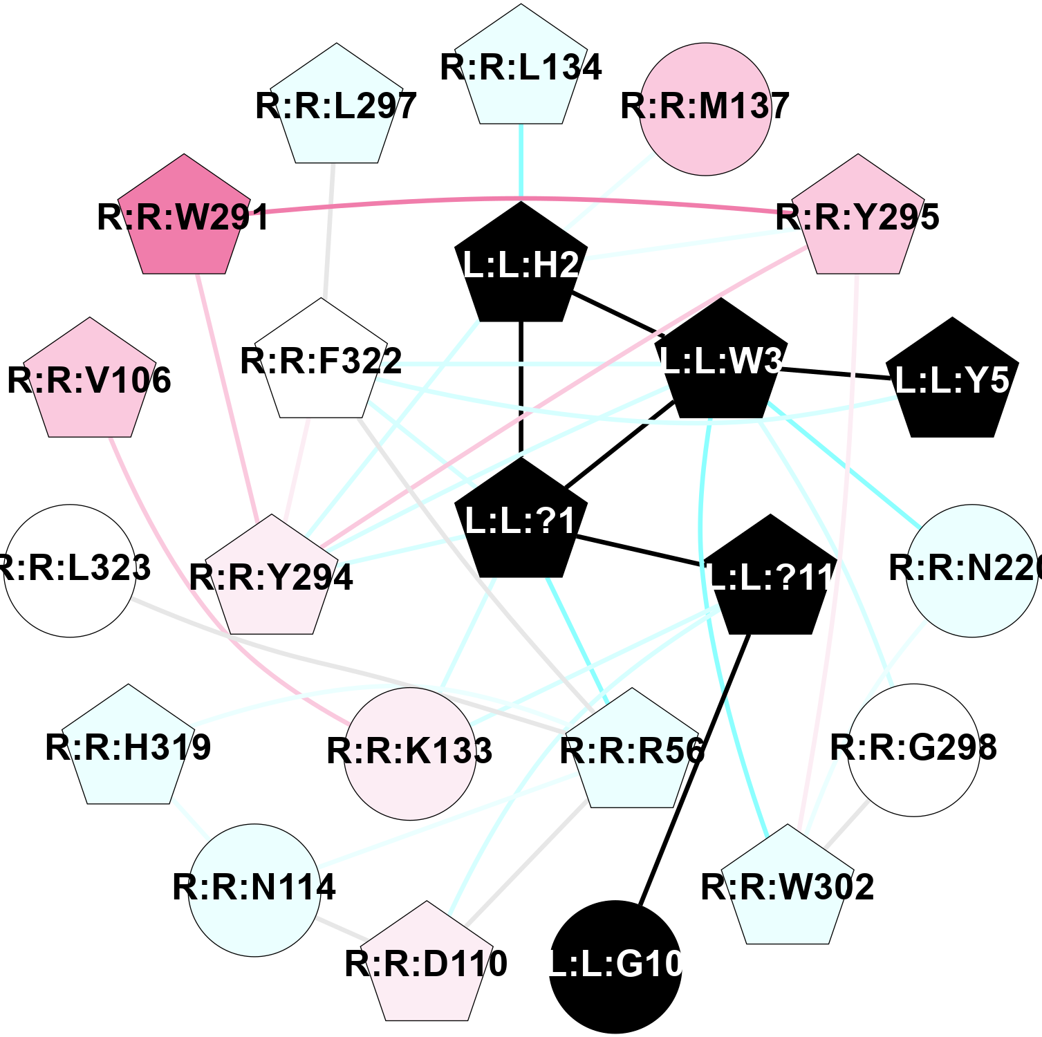 (Click to enlarge 🔍) | | Node1 | Node2 | LinkStrength | Comm | IsNode1Hub? | IsNode2Hub? | Node1Cons | Node2Cons | Node1Shell | Node2Shell | | L:L:?1 | L:L:H2 | 5.5 | 1 | Yes | Yes | 0 | 0 | 0 | 1 | | L:L:?1 | L:L:W3 | 25.59 | 1 | Yes | Yes | 0 | 0 | 0 | 1 | | L:L:?1 | L:L:?11 | 14.66 | 1 | Yes | Yes | 0 | 0 | 0 | 1 | | L:L:?1 | R:R:R56 | 3.9 | 1 | Yes | Yes | 0 | 4 | 0 | 1 | | L:L:?1 | R:R:K133 | 4.53 | 1 | Yes | No | 0 | 6 | 0 | 1 | | L:L:?1 | R:R:Y294 | 17.56 | 1 | Yes | Yes | 0 | 6 | 0 | 1 | | L:L:?1 | R:R:F322 | 20.85 | 1 | Yes | Yes | 0 | 5 | 0 | 1 | | L:L:H2 | L:L:W3 | 11.64 | 1 | Yes | Yes | 0 | 0 | 1 | 1 | | L:L:H2 | R:R:L134 | 3.86 | 1 | Yes | Yes | 0 | 4 | 1 | 2 | | L:L:H2 | R:R:M137 | 6.57 | 1 | Yes | No | 0 | 7 | 1 | 2 | | L:L:H2 | R:R:Y294 | 10.89 | 1 | Yes | Yes | 0 | 6 | 1 | 1 | | L:L:H2 | R:R:Y295 | 6.53 | 1 | Yes | Yes | 0 | 7 | 1 | 2 | | L:L:W3 | L:L:Y5 | 3.86 | 1 | Yes | Yes | 0 | 0 | 1 | 2 | | L:L:W3 | R:R:N220 | 3.39 | 1 | Yes | No | 0 | 4 | 1 | 2 | | L:L:W3 | R:R:Y294 | 17.36 | 1 | Yes | Yes | 0 | 6 | 1 | 1 | | L:L:W3 | R:R:G298 | 4.22 | 1 | Yes | No | 0 | 5 | 1 | 2 | | L:L:W3 | R:R:W302 | 16.87 | 1 | Yes | Yes | 0 | 4 | 1 | 2 | | L:L:W3 | R:R:F322 | 4.01 | 1 | Yes | Yes | 0 | 5 | 1 | 1 | | L:L:Y5 | R:R:F322 | 5.16 | 1 | Yes | Yes | 0 | 5 | 2 | 1 | | L:L:?11 | L:L:G10 | 4.23 | 1 | Yes | No | 0 | 0 | 1 | 2 | | L:L:?11 | R:R:D110 | 3.36 | 1 | Yes | Yes | 0 | 6 | 1 | 2 | | L:L:?11 | R:R:K133 | 6.98 | 1 | Yes | No | 0 | 6 | 1 | 1 | | R:R:D110 | R:R:R56 | 10.72 | 1 | Yes | Yes | 6 | 4 | 2 | 1 | | R:R:N114 | R:R:R56 | 9.64 | 1 | No | Yes | 4 | 4 | 2 | 1 | | R:R:H319 | R:R:R56 | 10.16 | 1 | Yes | Yes | 4 | 4 | 2 | 1 | | R:R:F322 | R:R:R56 | 5.34 | 1 | Yes | Yes | 5 | 4 | 1 | 1 | | R:R:L323 | R:R:R56 | 14.58 | 0 | No | Yes | 5 | 4 | 2 | 1 | | R:R:K133 | R:R:V106 | 4.55 | 1 | No | Yes | 6 | 7 | 1 | 2 | | R:R:D110 | R:R:N114 | 4.04 | 1 | Yes | No | 6 | 4 | 2 | 2 | | R:R:H319 | R:R:N114 | 5.1 | 1 | Yes | No | 4 | 4 | 2 | 2 | | R:R:N220 | R:R:W302 | 23.73 | 1 | No | Yes | 4 | 4 | 2 | 2 | | R:R:W291 | R:R:Y294 | 3.86 | 1 | Yes | Yes | 8 | 6 | 2 | 1 | | R:R:W291 | R:R:Y295 | 8.68 | 1 | Yes | Yes | 8 | 7 | 2 | 2 | | R:R:Y294 | R:R:Y295 | 6.95 | 1 | Yes | Yes | 6 | 7 | 1 | 2 | | R:R:F322 | R:R:Y294 | 7.22 | 1 | Yes | Yes | 5 | 6 | 1 | 1 | | R:R:W302 | R:R:Y295 | 3.86 | 1 | Yes | Yes | 4 | 7 | 2 | 2 | | R:R:F322 | R:R:L297 | 7.31 | 1 | Yes | Yes | 5 | 4 | 1 | 2 | | R:R:G298 | R:R:W302 | 8.44 | 1 | No | Yes | 5 | 4 | 2 | 2 | |