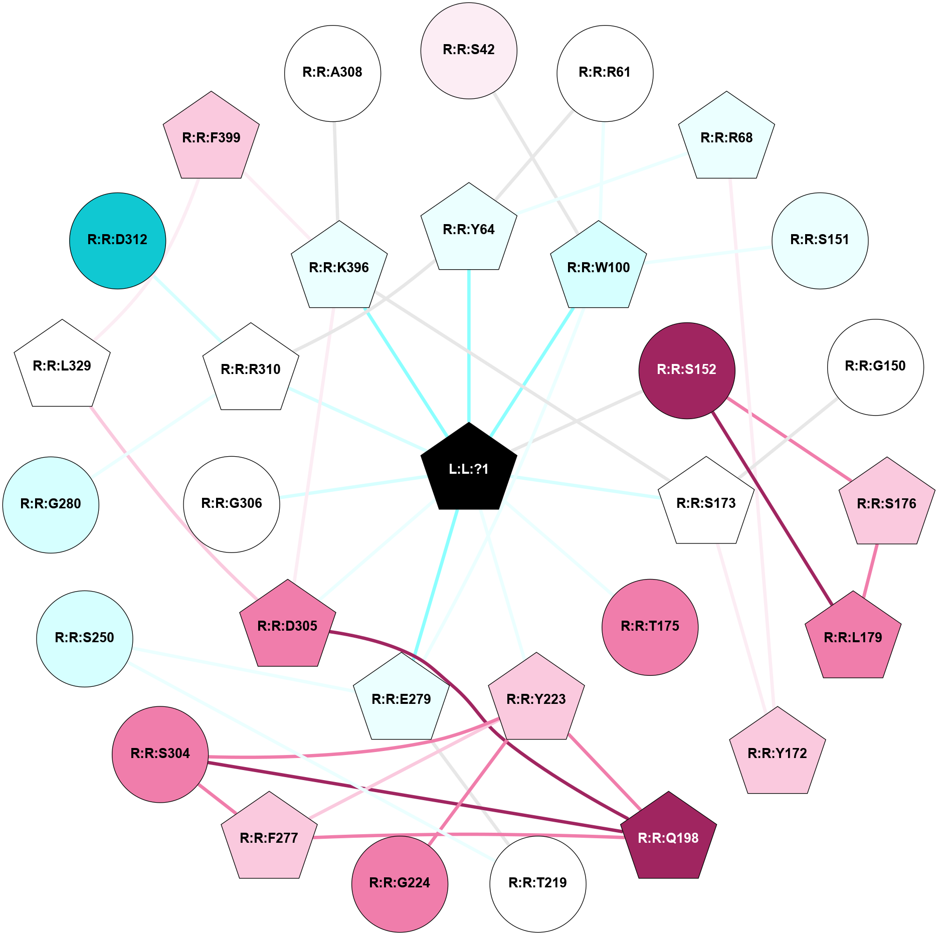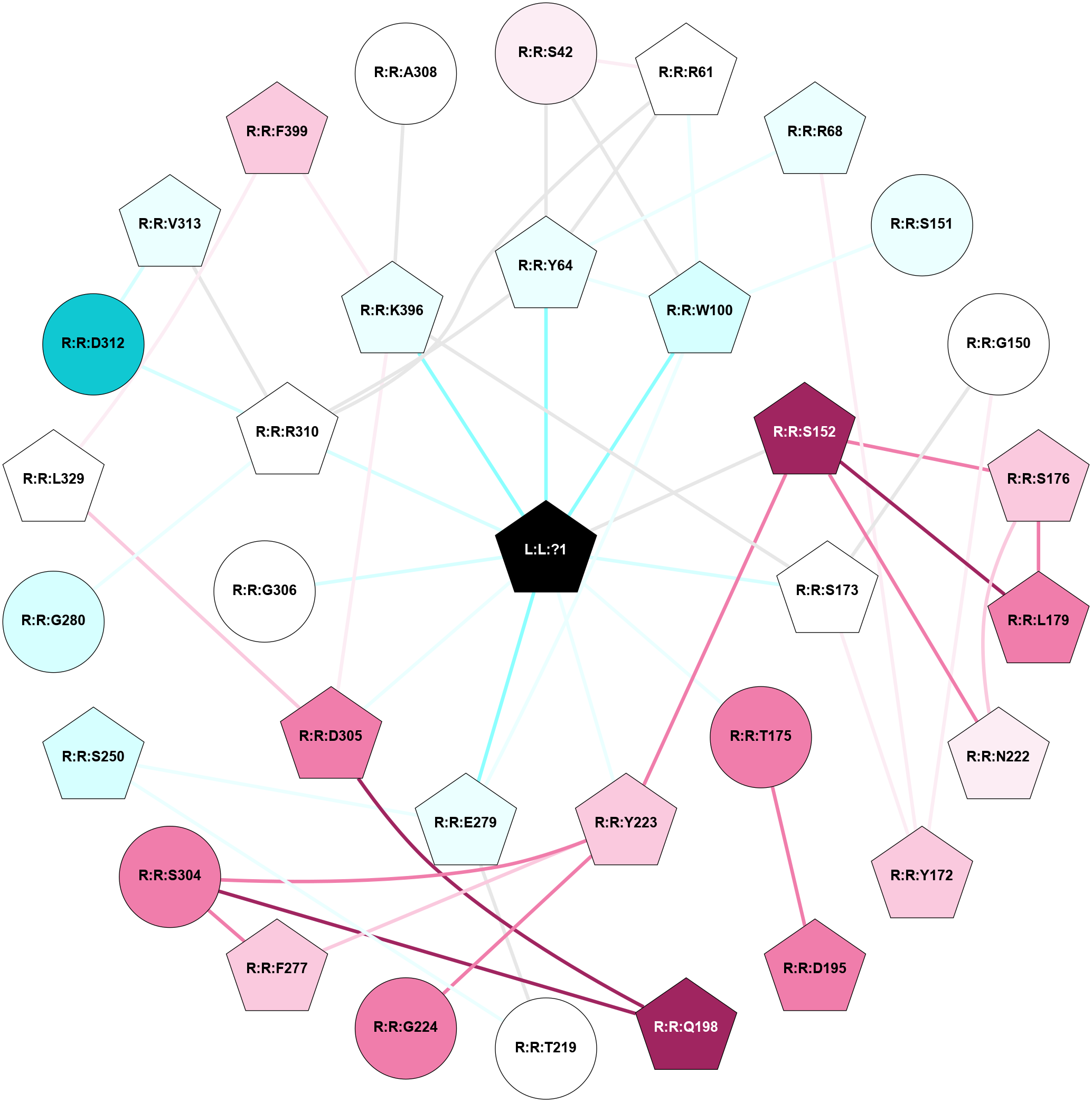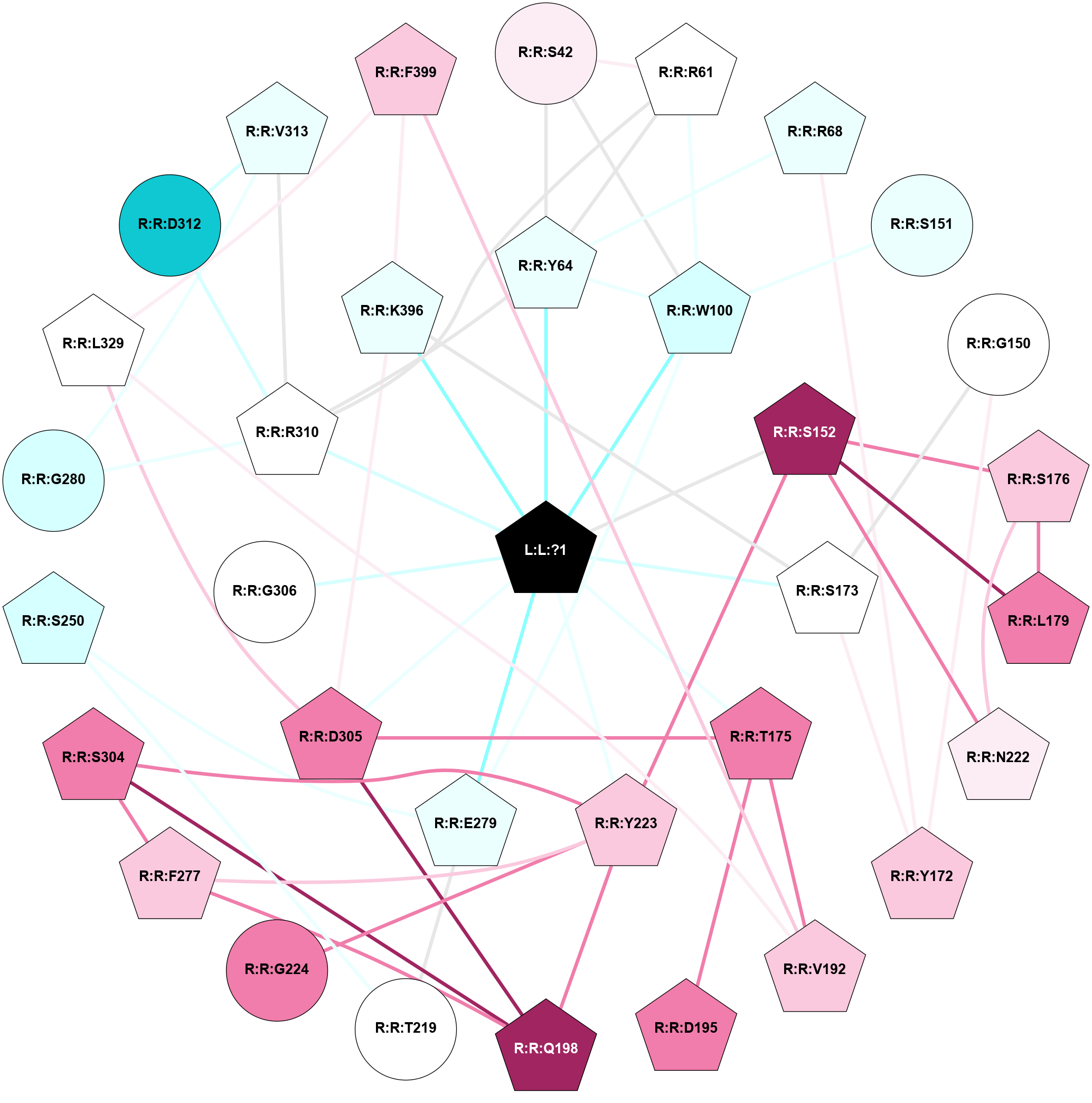 (Click to enlarge 🔍) | | Node1 | Node2 | LinkStrength | Comm | IsNode1Hub? | IsNode2Hub? | Node1Cons | Node2Cons | Node1Shell | Node2Shell | | L:L:?1 | R:R:Y64 | 7.3 | 2 | Yes | Yes | 0 | 4 | 0 | 1 | | L:L:?1 | R:R:W100 | 4.73 | 2 | Yes | Yes | 0 | 3 | 0 | 1 | | L:L:?1 | R:R:S152 | 4.15 | 2 | Yes | No | 0 | 9 | 0 | 1 | | L:L:?1 | R:R:T175 | 3.06 | 2 | Yes | No | 0 | 8 | 0 | 1 | | L:L:?1 | R:R:Y223 | 19.46 | 2 | Yes | Yes | 0 | 7 | 0 | 1 | | L:L:?1 | R:R:E279 | 6.41 | 2 | Yes | No | 0 | 4 | 0 | 1 | | L:L:?1 | R:R:D305 | 2.82 | 2 | Yes | Yes | 0 | 8 | 0 | 1 | | L:L:?1 | R:R:G306 | 3.55 | 2 | Yes | No | 0 | 5 | 0 | 1 | | L:L:?1 | R:R:K396 | 2.93 | 2 | Yes | No | 0 | 4 | 0 | 1 | | R:R:R61 | R:R:S42 | 6.59 | 2 | Yes | No | 5 | 6 | 2 | 2 | | R:R:S42 | R:R:W100 | 7.41 | 2 | No | Yes | 6 | 3 | 2 | 1 | | R:R:R61 | R:R:Y64 | 12.35 | 2 | Yes | Yes | 5 | 4 | 2 | 1 | | R:R:R61 | R:R:W100 | 5 | 2 | Yes | Yes | 5 | 3 | 2 | 1 | | R:R:R68 | R:R:Y64 | 8.23 | 2 | Yes | Yes | 4 | 4 | 2 | 1 | | R:R:R310 | R:R:Y64 | 11.32 | 0 | Yes | Yes | 5 | 4 | 2 | 1 | | R:R:D394 | R:R:Y64 | 6.9 | 2 | Yes | Yes | 5 | 4 | 2 | 1 | | R:R:D394 | R:R:R68 | 8.34 | 2 | Yes | Yes | 5 | 4 | 2 | 2 | | R:R:S151 | R:R:W100 | 4.94 | 0 | No | Yes | 4 | 3 | 2 | 1 | | R:R:E279 | R:R:W100 | 3.27 | 2 | No | Yes | 4 | 3 | 1 | 1 | | R:R:S152 | R:R:S176 | 6.52 | 2 | No | No | 9 | 7 | 1 | 2 | | R:R:S152 | R:R:Y223 | 3.82 | 2 | No | Yes | 9 | 7 | 1 | 1 | | R:R:K396 | R:R:S173 | 9.18 | 0 | No | No | 4 | 5 | 1 | 2 | | R:R:T175 | R:R:V192 | 3.17 | 0 | No | No | 8 | 7 | 1 | 2 | | R:R:D195 | R:R:T175 | 2.89 | 0 | Yes | No | 8 | 8 | 2 | 1 | | R:R:D195 | R:R:S176 | 2.94 | 0 | Yes | No | 8 | 7 | 2 | 2 | | R:R:F399 | R:R:V192 | 9.18 | 2 | Yes | No | 7 | 7 | 2 | 2 | | R:R:Q198 | R:R:S304 | 5.78 | 2 | Yes | Yes | 9 | 8 | 2 | 2 | | R:R:D305 | R:R:Q198 | 15.66 | 2 | Yes | Yes | 8 | 9 | 1 | 2 | | R:R:G224 | R:R:Y223 | 4.35 | 0 | No | Yes | 8 | 7 | 2 | 1 | | R:R:F277 | R:R:Y223 | 3.09 | 2 | Yes | Yes | 7 | 7 | 2 | 1 | | R:R:S304 | R:R:Y223 | 3.82 | 2 | Yes | Yes | 8 | 7 | 2 | 1 | | R:R:D305 | R:R:Y223 | 5.75 | 2 | Yes | Yes | 8 | 7 | 1 | 1 | | R:R:E279 | R:R:S250 | 5.75 | 2 | No | No | 4 | 3 | 1 | 2 | | R:R:F277 | R:R:S304 | 6.61 | 2 | Yes | Yes | 7 | 8 | 2 | 2 | | R:R:D305 | R:R:S304 | 5.89 | 2 | Yes | Yes | 8 | 8 | 1 | 2 | | R:R:F399 | R:R:K396 | 6.2 | 2 | Yes | No | 7 | 4 | 2 | 1 | |