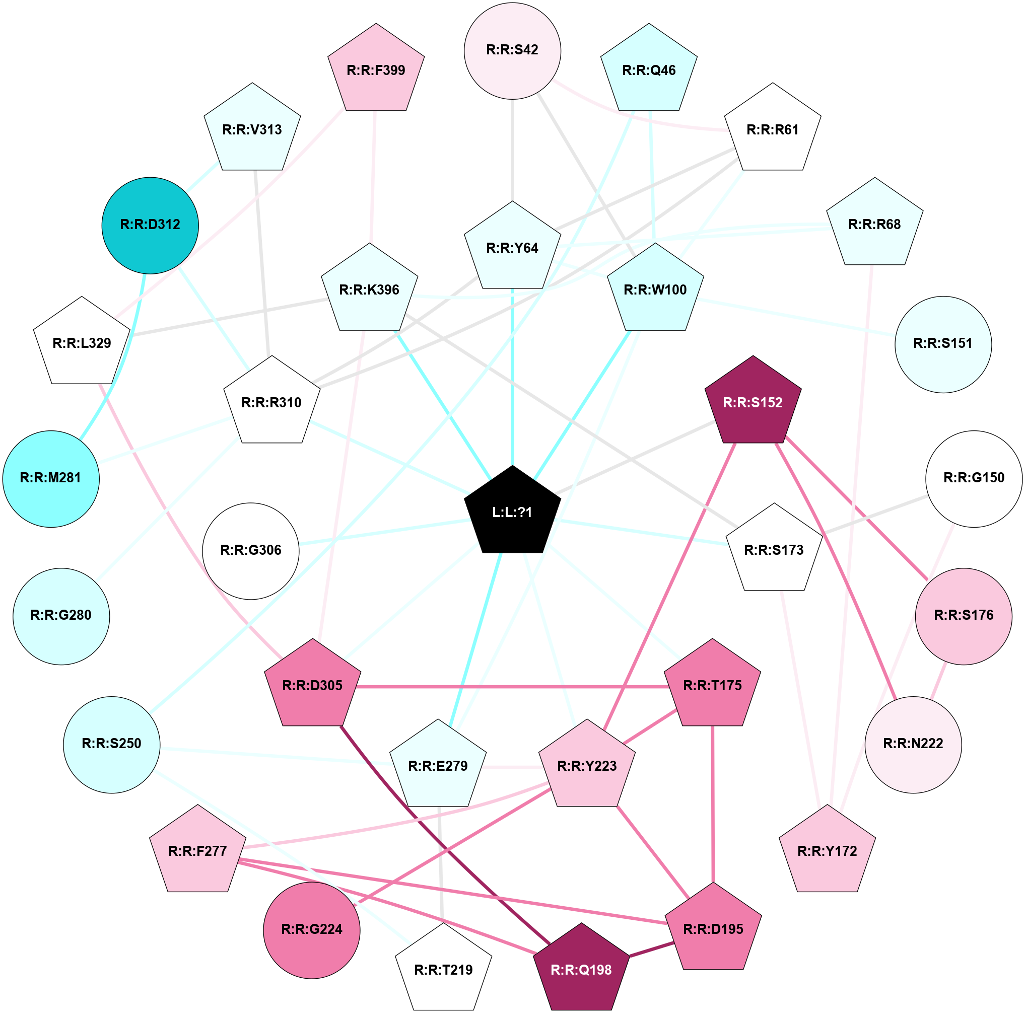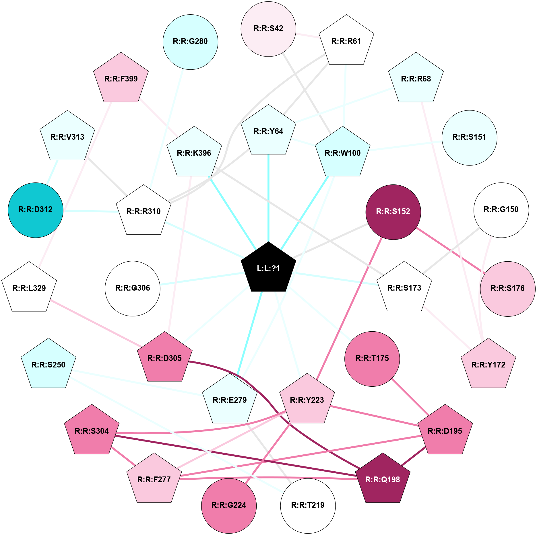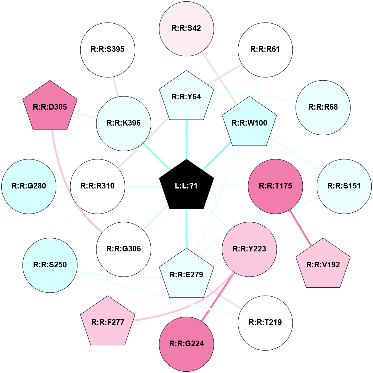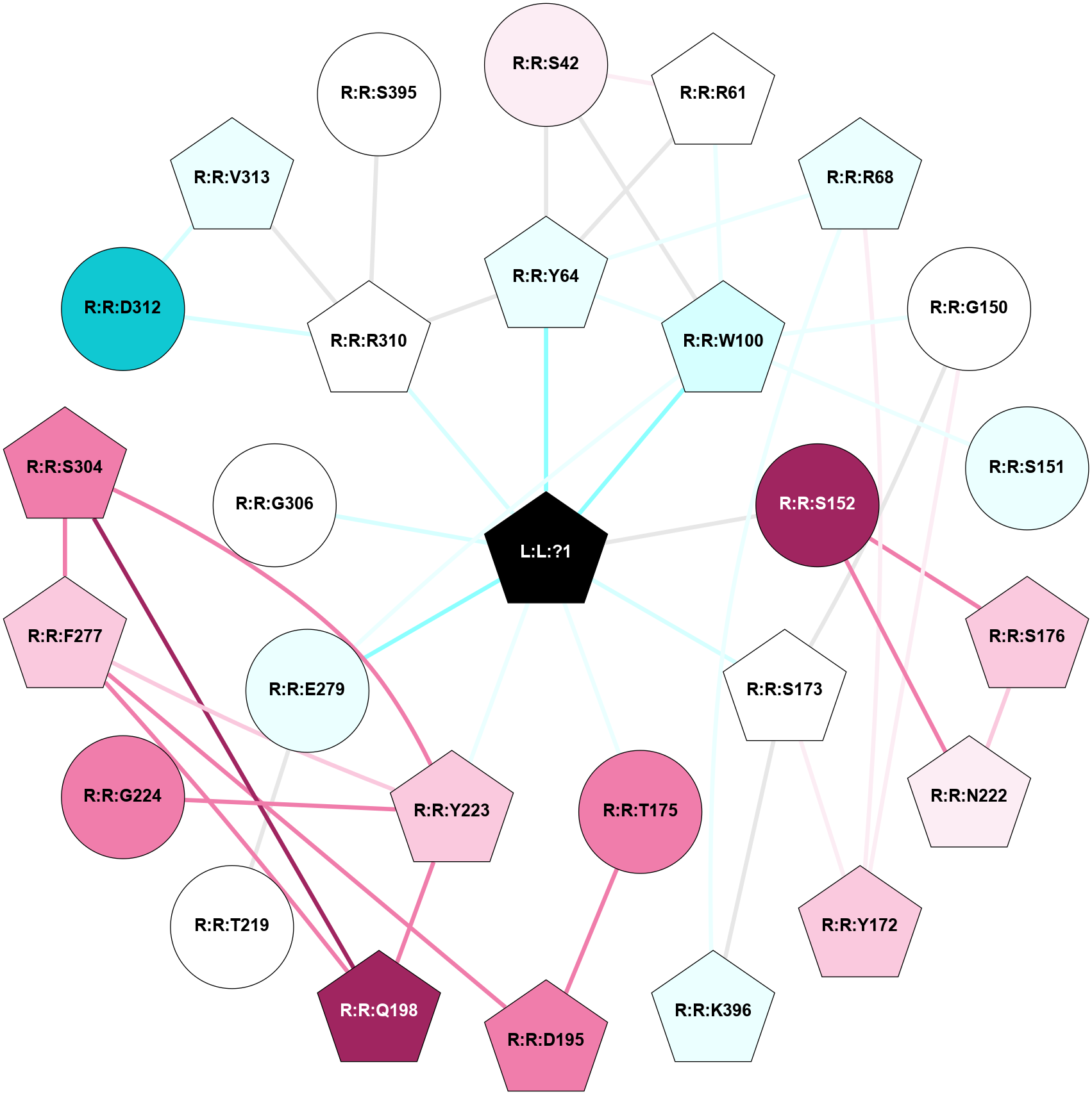 (Click to enlarge 🔍) | | Node1 | Node2 | LinkStrength | Comm | IsNode1Hub? | IsNode2Hub? | Node1Cons | Node2Cons | Node1Shell | Node2Shell | | L:L:?1 | R:R:Y64 | 7.3 | 2 | Yes | Yes | 0 | 4 | 0 | 1 | | L:L:?1 | R:R:W100 | 4.73 | 2 | Yes | Yes | 0 | 3 | 0 | 1 | | L:L:?1 | R:R:S152 | 4.15 | 2 | Yes | No | 0 | 9 | 0 | 1 | | L:L:?1 | R:R:T175 | 3.06 | 2 | Yes | No | 0 | 8 | 0 | 1 | | L:L:?1 | R:R:Y223 | 19.46 | 2 | Yes | Yes | 0 | 7 | 0 | 1 | | L:L:?1 | R:R:E279 | 6.41 | 2 | Yes | No | 0 | 4 | 0 | 1 | | L:L:?1 | R:R:D305 | 2.82 | 2 | Yes | Yes | 0 | 8 | 0 | 1 | | L:L:?1 | R:R:G306 | 3.55 | 2 | Yes | No | 0 | 5 | 0 | 1 | | L:L:?1 | R:R:K396 | 2.93 | 2 | Yes | No | 0 | 4 | 0 | 1 | | R:R:R61 | R:R:S42 | 6.59 | 2 | Yes | No | 5 | 6 | 2 | 2 | | R:R:S42 | R:R:W100 | 7.41 | 2 | No | Yes | 6 | 3 | 2 | 1 | | R:R:R61 | R:R:Y64 | 12.35 | 2 | Yes | Yes | 5 | 4 | 2 | 1 | | R:R:R61 | R:R:W100 | 5 | 2 | Yes | Yes | 5 | 3 | 2 | 1 | | R:R:R68 | R:R:Y64 | 8.23 | 2 | Yes | Yes | 4 | 4 | 2 | 1 | | R:R:R310 | R:R:Y64 | 11.32 | 0 | Yes | Yes | 5 | 4 | 2 | 1 | | R:R:D394 | R:R:Y64 | 6.9 | 2 | Yes | Yes | 5 | 4 | 2 | 1 | | R:R:D394 | R:R:R68 | 8.34 | 2 | Yes | Yes | 5 | 4 | 2 | 2 | | R:R:S151 | R:R:W100 | 4.94 | 0 | No | Yes | 4 | 3 | 2 | 1 | | R:R:E279 | R:R:W100 | 3.27 | 2 | No | Yes | 4 | 3 | 1 | 1 | | R:R:S152 | R:R:S176 | 6.52 | 2 | No | No | 9 | 7 | 1 | 2 | | R:R:S152 | R:R:Y223 | 3.82 | 2 | No | Yes | 9 | 7 | 1 | 1 | | R:R:K396 | R:R:S173 | 9.18 | 0 | No | No | 4 | 5 | 1 | 2 | | R:R:T175 | R:R:V192 | 3.17 | 0 | No | No | 8 | 7 | 1 | 2 | | R:R:D195 | R:R:T175 | 2.89 | 0 | Yes | No | 8 | 8 | 2 | 1 | | R:R:D195 | R:R:S176 | 2.94 | 0 | Yes | No | 8 | 7 | 2 | 2 | | R:R:F399 | R:R:V192 | 9.18 | 2 | Yes | No | 7 | 7 | 2 | 2 | | R:R:Q198 | R:R:S304 | 5.78 | 2 | Yes | Yes | 9 | 8 | 2 | 2 | | R:R:D305 | R:R:Q198 | 15.66 | 2 | Yes | Yes | 8 | 9 | 1 | 2 | | R:R:G224 | R:R:Y223 | 4.35 | 0 | No | Yes | 8 | 7 | 2 | 1 | | R:R:F277 | R:R:Y223 | 3.09 | 2 | Yes | Yes | 7 | 7 | 2 | 1 | | R:R:S304 | R:R:Y223 | 3.82 | 2 | Yes | Yes | 8 | 7 | 2 | 1 | | R:R:D305 | R:R:Y223 | 5.75 | 2 | Yes | Yes | 8 | 7 | 1 | 1 | | R:R:E279 | R:R:S250 | 5.75 | 2 | No | No | 4 | 3 | 1 | 2 | | R:R:F277 | R:R:S304 | 6.61 | 2 | Yes | Yes | 7 | 8 | 2 | 2 | | R:R:D305 | R:R:S304 | 5.89 | 2 | Yes | Yes | 8 | 8 | 1 | 2 | | R:R:F399 | R:R:K396 | 6.2 | 2 | Yes | No | 7 | 4 | 2 | 1 | |