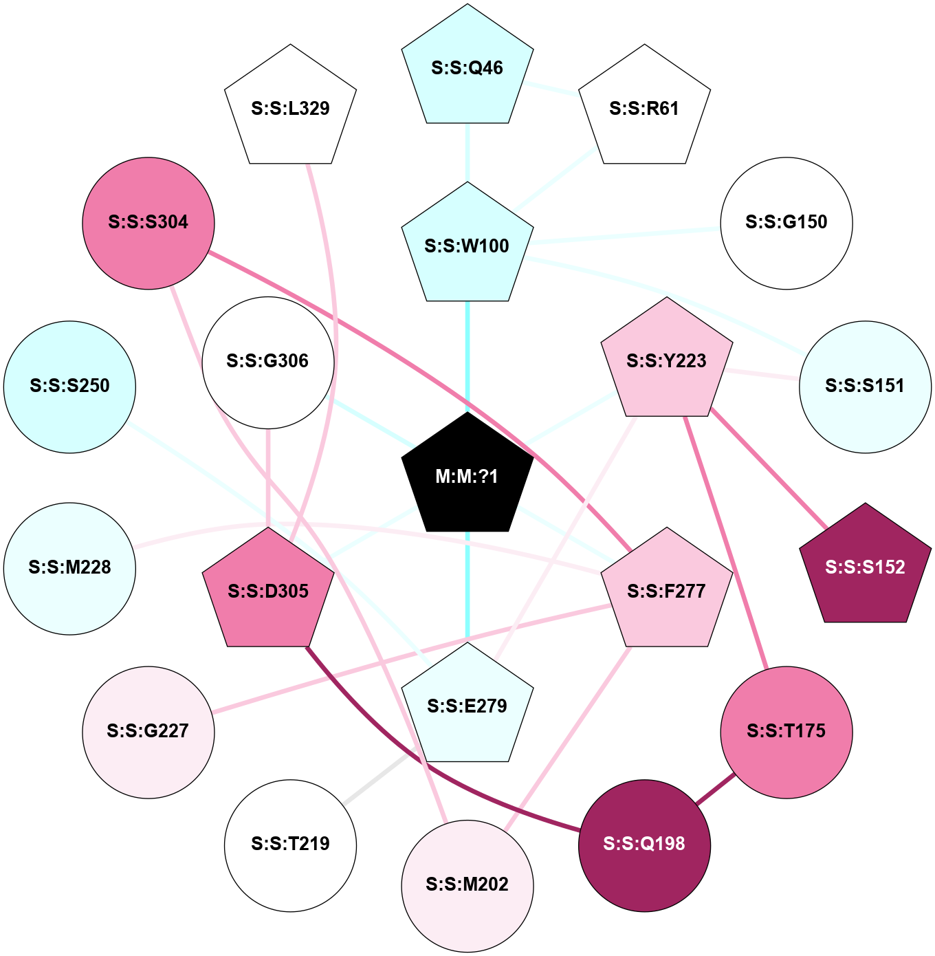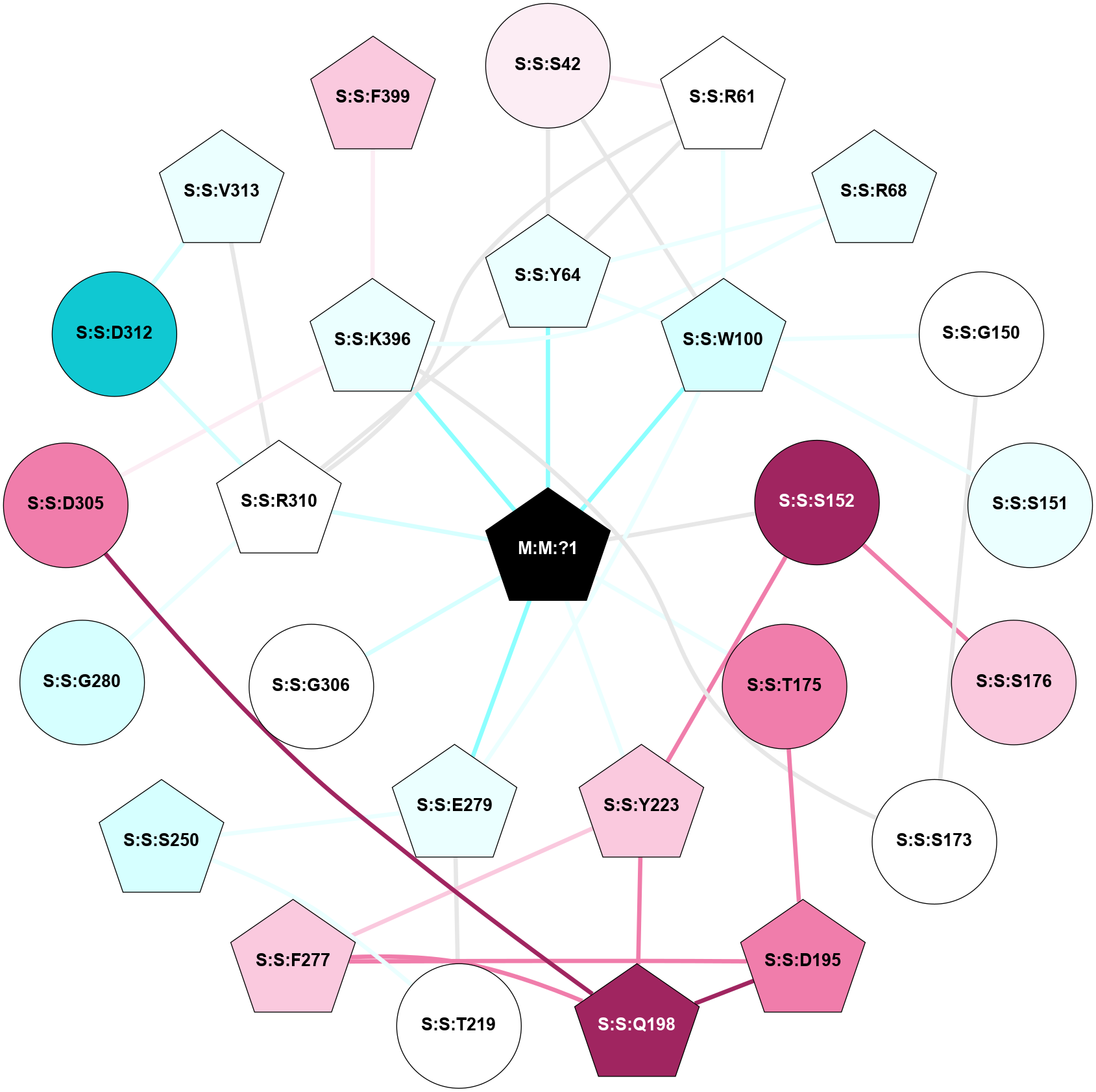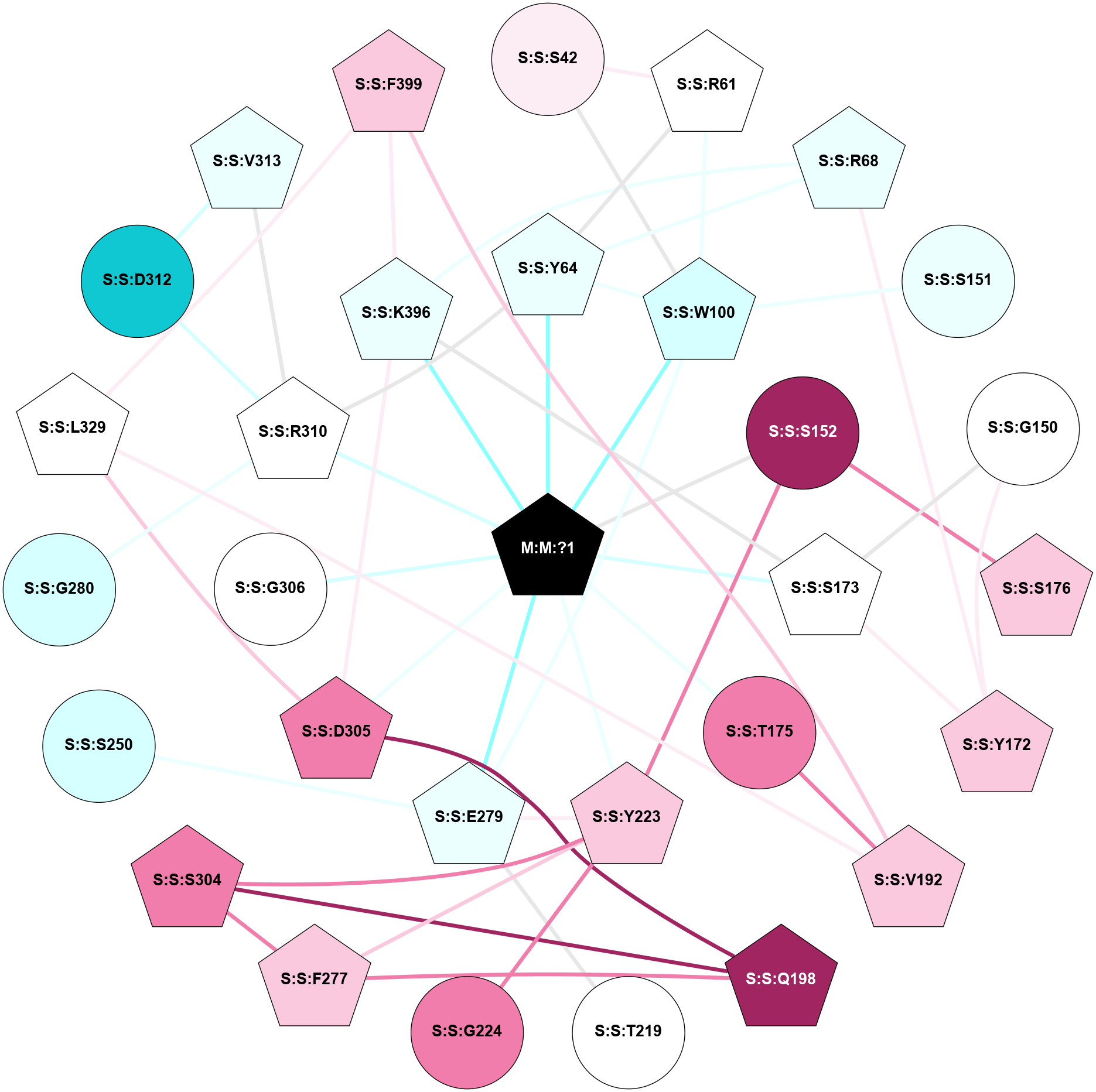 (Click to enlarge 🔍) | | Node1 | Node2 | LinkStrength | Comm | IsNode1Hub? | IsNode2Hub? | Node1Cons | Node2Cons | Node1Shell | Node2Shell | | M:M:?1 | S:S:Y64 | 7.3 | 1 | Yes | Yes | 0 | 4 | 0 | 1 | | M:M:?1 | S:S:W100 | 4.73 | 1 | Yes | Yes | 0 | 3 | 0 | 1 | | M:M:?1 | S:S:S152 | 4.15 | 1 | Yes | No | 0 | 9 | 0 | 1 | | M:M:?1 | S:S:T175 | 3.06 | 1 | Yes | No | 0 | 8 | 0 | 1 | | M:M:?1 | S:S:Y223 | 21.89 | 1 | Yes | Yes | 0 | 7 | 0 | 1 | | M:M:?1 | S:S:E279 | 6.41 | 1 | Yes | No | 0 | 4 | 0 | 1 | | M:M:?1 | S:S:D305 | 2.82 | 1 | Yes | Yes | 0 | 8 | 0 | 1 | | M:M:?1 | S:S:G306 | 3.55 | 1 | Yes | No | 0 | 5 | 0 | 1 | | M:M:?1 | S:S:K396 | 2.93 | 1 | Yes | Yes | 0 | 4 | 0 | 1 | | S:S:R61 | S:S:S42 | 6.59 | 1 | Yes | No | 5 | 6 | 2 | 2 | | S:S:S42 | S:S:W100 | 7.41 | 1 | No | Yes | 6 | 3 | 2 | 1 | | S:S:R61 | S:S:Y64 | 12.35 | 1 | Yes | Yes | 5 | 4 | 2 | 1 | | S:S:R61 | S:S:W100 | 5 | 1 | Yes | Yes | 5 | 3 | 2 | 1 | | S:S:R68 | S:S:Y64 | 9.26 | 1 | Yes | Yes | 4 | 4 | 2 | 1 | | S:S:R310 | S:S:Y64 | 11.32 | 0 | Yes | Yes | 5 | 4 | 2 | 1 | | S:S:D394 | S:S:Y64 | 5.75 | 1 | Yes | Yes | 5 | 4 | 2 | 1 | | S:S:D394 | S:S:R68 | 14.29 | 1 | Yes | Yes | 5 | 4 | 2 | 2 | | S:S:S151 | S:S:W100 | 4.94 | 0 | No | Yes | 4 | 3 | 2 | 1 | | S:S:E279 | S:S:W100 | 3.27 | 1 | No | Yes | 4 | 3 | 1 | 1 | | S:S:S152 | S:S:S176 | 6.52 | 1 | No | Yes | 9 | 7 | 1 | 2 | | S:S:S152 | S:S:Y223 | 3.82 | 1 | No | Yes | 9 | 7 | 1 | 1 | | S:S:K396 | S:S:S173 | 9.18 | 1 | Yes | No | 4 | 5 | 1 | 2 | | S:S:T175 | S:S:V192 | 3.17 | 0 | No | No | 8 | 7 | 1 | 2 | | S:S:D195 | S:S:T175 | 2.89 | 0 | Yes | No | 8 | 8 | 2 | 1 | | S:S:D195 | S:S:S176 | 2.94 | 0 | Yes | Yes | 8 | 7 | 2 | 2 | | S:S:F399 | S:S:V192 | 9.18 | 1 | Yes | No | 7 | 7 | 2 | 2 | | S:S:Q198 | S:S:S304 | 5.78 | 1 | Yes | Yes | 9 | 8 | 2 | 2 | | S:S:D305 | S:S:Q198 | 14.36 | 1 | Yes | Yes | 8 | 9 | 1 | 2 | | S:S:G224 | S:S:Y223 | 4.35 | 0 | No | Yes | 8 | 7 | 2 | 1 | | S:S:F277 | S:S:Y223 | 3.09 | 1 | Yes | Yes | 7 | 7 | 2 | 1 | | S:S:S304 | S:S:Y223 | 3.82 | 1 | Yes | Yes | 8 | 7 | 2 | 1 | | S:S:D305 | S:S:Y223 | 5.75 | 1 | Yes | Yes | 8 | 7 | 1 | 1 | | S:S:E279 | S:S:S250 | 5.75 | 1 | No | No | 4 | 3 | 1 | 2 | | S:S:F277 | S:S:S304 | 7.93 | 1 | Yes | Yes | 7 | 8 | 2 | 2 | | S:S:D305 | S:S:S304 | 5.89 | 1 | Yes | Yes | 8 | 8 | 1 | 2 | | S:S:D305 | S:S:K396 | 2.77 | 1 | Yes | Yes | 8 | 4 | 1 | 1 | | S:S:F399 | S:S:K396 | 6.2 | 1 | Yes | Yes | 7 | 4 | 2 | 1 | |