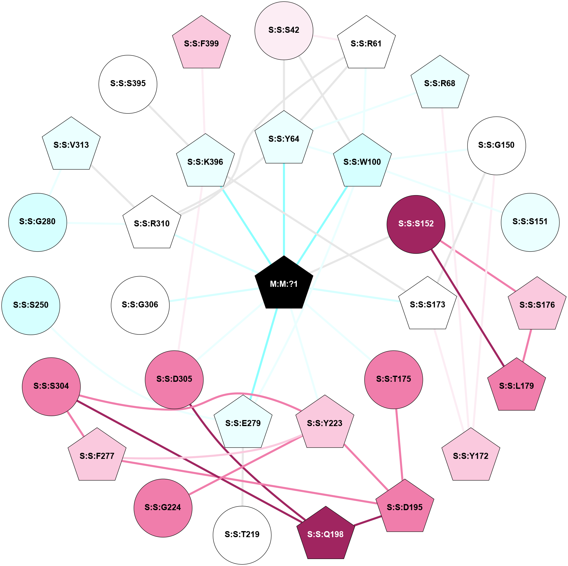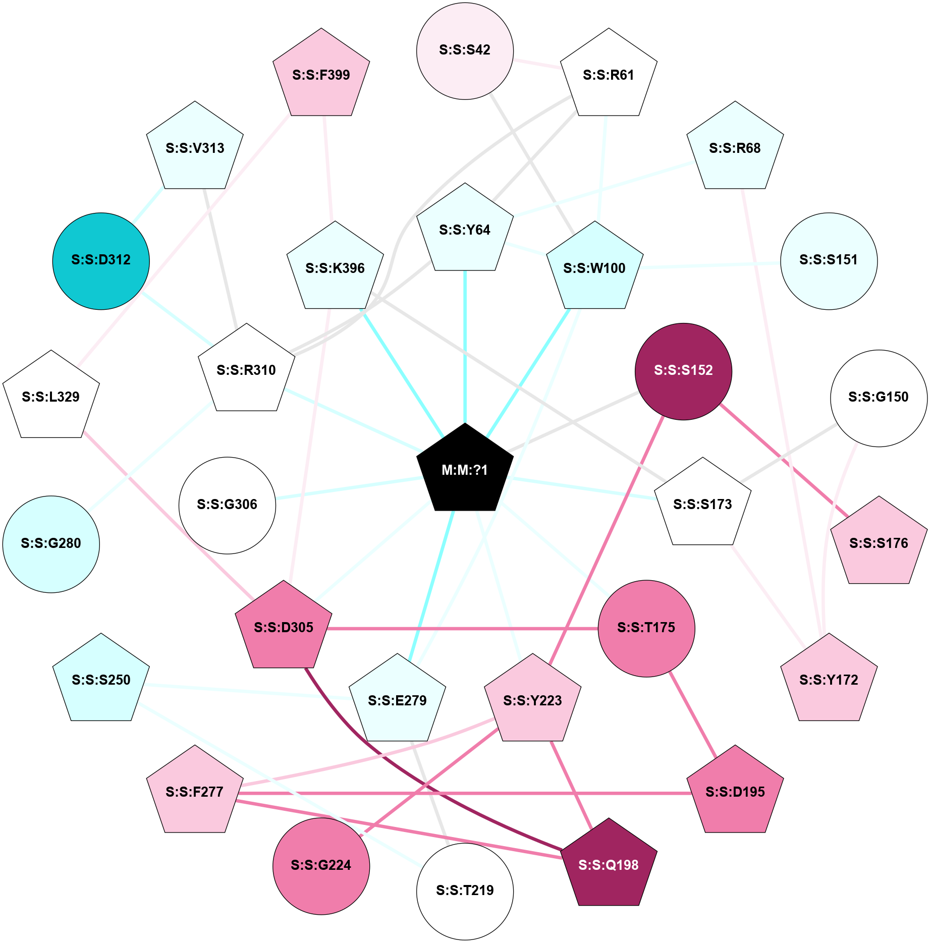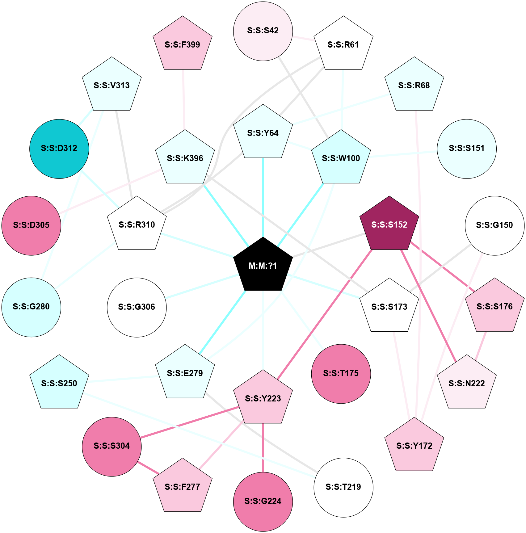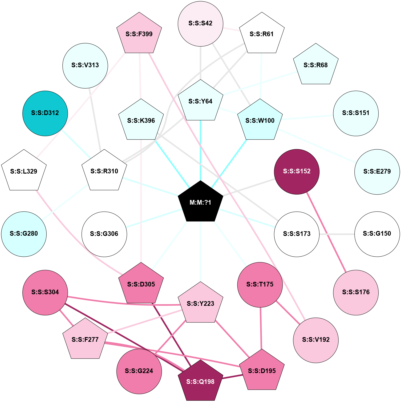 (Click to enlarge 🔍) | | Node1 | Node2 | LinkStrength | Comm | IsNode1Hub? | IsNode2Hub? | Node1Cons | Node2Cons | Node1Shell | Node2Shell | | M:M:?1 | S:S:Y64 | 7.3 | 1 | Yes | Yes | 0 | 4 | 0 | 1 | | M:M:?1 | S:S:W100 | 4.73 | 1 | Yes | Yes | 0 | 3 | 0 | 1 | | M:M:?1 | S:S:S152 | 4.15 | 1 | Yes | No | 0 | 9 | 0 | 1 | | M:M:?1 | S:S:T175 | 3.06 | 1 | Yes | No | 0 | 8 | 0 | 1 | | M:M:?1 | S:S:Y223 | 21.89 | 1 | Yes | Yes | 0 | 7 | 0 | 1 | | M:M:?1 | S:S:E279 | 6.41 | 1 | Yes | No | 0 | 4 | 0 | 1 | | M:M:?1 | S:S:D305 | 2.82 | 1 | Yes | Yes | 0 | 8 | 0 | 1 | | M:M:?1 | S:S:G306 | 3.55 | 1 | Yes | No | 0 | 5 | 0 | 1 | | M:M:?1 | S:S:K396 | 2.93 | 1 | Yes | Yes | 0 | 4 | 0 | 1 | | S:S:R61 | S:S:S42 | 6.59 | 1 | Yes | No | 5 | 6 | 2 | 2 | | S:S:S42 | S:S:W100 | 7.41 | 1 | No | Yes | 6 | 3 | 2 | 1 | | S:S:R61 | S:S:Y64 | 12.35 | 1 | Yes | Yes | 5 | 4 | 2 | 1 | | S:S:R61 | S:S:W100 | 5 | 1 | Yes | Yes | 5 | 3 | 2 | 1 | | S:S:R68 | S:S:Y64 | 9.26 | 1 | Yes | Yes | 4 | 4 | 2 | 1 | | S:S:R310 | S:S:Y64 | 11.32 | 0 | Yes | Yes | 5 | 4 | 2 | 1 | | S:S:D394 | S:S:Y64 | 5.75 | 1 | Yes | Yes | 5 | 4 | 2 | 1 | | S:S:D394 | S:S:R68 | 14.29 | 1 | Yes | Yes | 5 | 4 | 2 | 2 | | S:S:S151 | S:S:W100 | 4.94 | 0 | No | Yes | 4 | 3 | 2 | 1 | | S:S:E279 | S:S:W100 | 3.27 | 1 | No | Yes | 4 | 3 | 1 | 1 | | S:S:S152 | S:S:S176 | 6.52 | 1 | No | Yes | 9 | 7 | 1 | 2 | | S:S:S152 | S:S:Y223 | 3.82 | 1 | No | Yes | 9 | 7 | 1 | 1 | | S:S:K396 | S:S:S173 | 9.18 | 1 | Yes | No | 4 | 5 | 1 | 2 | | S:S:T175 | S:S:V192 | 3.17 | 0 | No | No | 8 | 7 | 1 | 2 | | S:S:D195 | S:S:T175 | 2.89 | 0 | Yes | No | 8 | 8 | 2 | 1 | | S:S:D195 | S:S:S176 | 2.94 | 0 | Yes | Yes | 8 | 7 | 2 | 2 | | S:S:F399 | S:S:V192 | 9.18 | 1 | Yes | No | 7 | 7 | 2 | 2 | | S:S:Q198 | S:S:S304 | 5.78 | 1 | Yes | Yes | 9 | 8 | 2 | 2 | | S:S:D305 | S:S:Q198 | 14.36 | 1 | Yes | Yes | 8 | 9 | 1 | 2 | | S:S:G224 | S:S:Y223 | 4.35 | 0 | No | Yes | 8 | 7 | 2 | 1 | | S:S:F277 | S:S:Y223 | 3.09 | 1 | Yes | Yes | 7 | 7 | 2 | 1 | | S:S:S304 | S:S:Y223 | 3.82 | 1 | Yes | Yes | 8 | 7 | 2 | 1 | | S:S:D305 | S:S:Y223 | 5.75 | 1 | Yes | Yes | 8 | 7 | 1 | 1 | | S:S:E279 | S:S:S250 | 5.75 | 1 | No | No | 4 | 3 | 1 | 2 | | S:S:F277 | S:S:S304 | 7.93 | 1 | Yes | Yes | 7 | 8 | 2 | 2 | | S:S:D305 | S:S:S304 | 5.89 | 1 | Yes | Yes | 8 | 8 | 1 | 2 | | S:S:D305 | S:S:K396 | 2.77 | 1 | Yes | Yes | 8 | 4 | 1 | 1 | | S:S:F399 | S:S:K396 | 6.2 | 1 | Yes | Yes | 7 | 4 | 2 | 1 | |