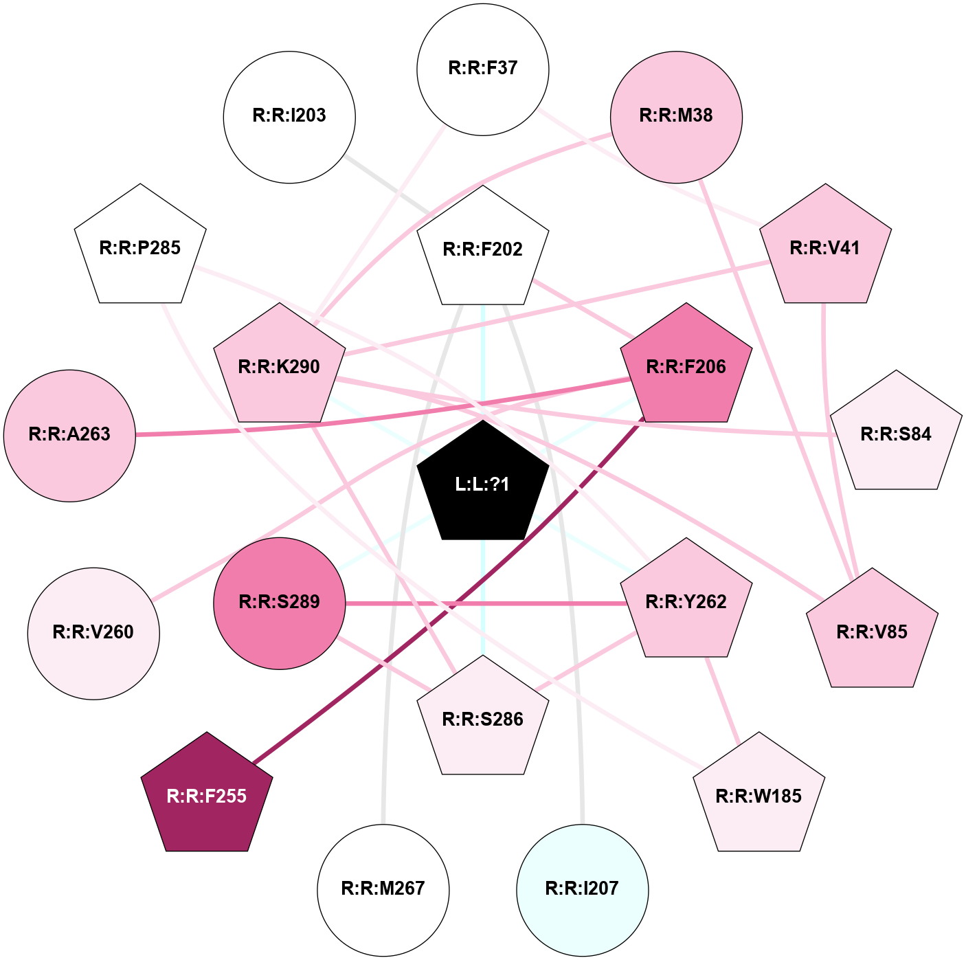 (Click to enlarge 🔍) | | Node1 | Node2 | LinkStrength | Comm | IsNode1Hub? | IsNode2Hub? | Node1Cons | Node2Cons | Node1Shell | Node2Shell | | L:L:?1 | R:R:M207 | 14.08 | 0 | Yes | No | 0 | 5 | 0 | 1 | | L:L:?1 | R:R:W265 | 11.35 | 0 | Yes | No | 0 | 8 | 0 | 1 | | L:L:?1 | R:R:Y268 | 18.68 | 0 | Yes | Yes | 0 | 6 | 0 | 1 | | L:L:?1 | R:R:A269 | 2.09 | 0 | Yes | No | 0 | 7 | 0 | 1 | | L:L:?1 | R:R:A272 | 2.09 | 0 | Yes | No | 0 | 5 | 0 | 1 | | L:L:?1 | R:R:K296 | 12.17 | 0 | Yes | No | 0 | 7 | 0 | 1 | | R:R:K296 | R:R:M86 | 2.88 | 0 | No | Yes | 7 | 7 | 1 | 2 | | R:R:F91 | R:R:K296 | 8.69 | 17 | Yes | No | 7 | 7 | 2 | 1 | | R:R:Y191 | R:R:Y268 | 3.97 | 0 | No | Yes | 6 | 6 | 2 | 1 | | R:R:M207 | R:R:Y206 | 2.39 | 0 | No | Yes | 5 | 4 | 1 | 2 | | R:R:H211 | R:R:M207 | 17.07 | 4 | Yes | No | 6 | 5 | 2 | 1 | | R:R:A269 | R:R:F208 | 2.77 | 0 | No | No | 7 | 5 | 1 | 2 | | R:R:A269 | R:R:F212 | 8.32 | 0 | No | No | 7 | 8 | 1 | 2 | | R:R:C264 | R:R:W265 | 6.53 | 4 | Yes | No | 8 | 8 | 2 | 1 | | R:R:P291 | R:R:Y268 | 5.56 | 0 | Yes | Yes | 6 | 6 | 2 | 1 | | R:R:A295 | R:R:Y268 | 2.67 | 0 | No | Yes | 8 | 6 | 2 | 1 | |