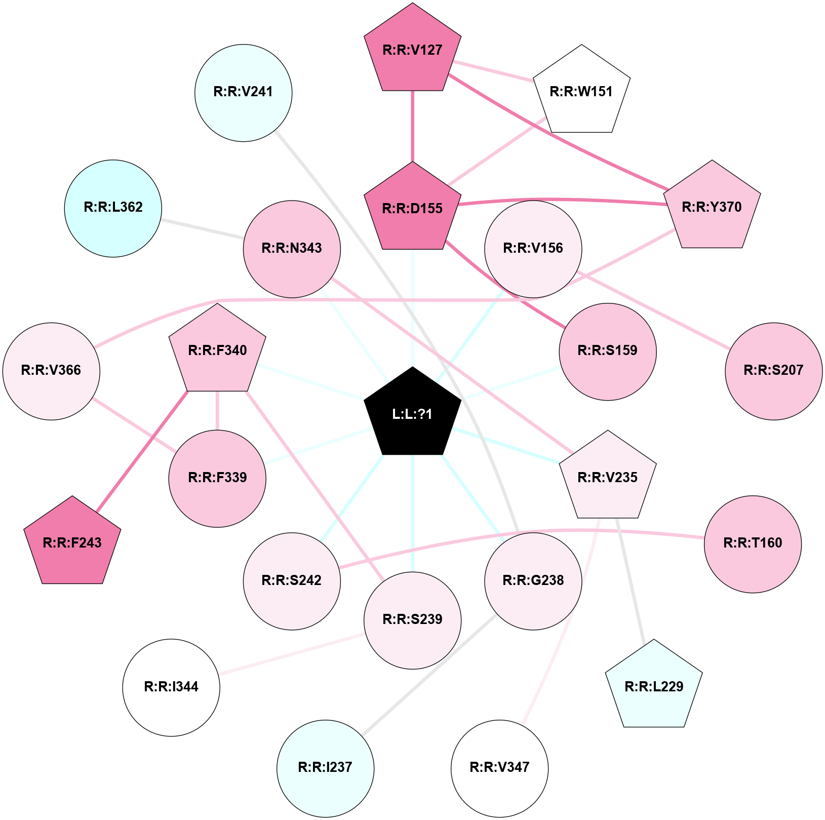 (Click to enlarge 🔍) | | Node1 | Node2 | LinkStrength | Comm | IsNode1Hub? | IsNode2Hub? | Node1Cons | Node2Cons | Node1Shell | Node2Shell | | L:L:?1 | R:R:D155 | 9.23 | 1 | Yes | Yes | 0 | 8 | 0 | 1 | | L:L:?1 | R:R:V156 | 11.4 | 1 | Yes | No | 0 | 6 | 0 | 1 | | L:L:?1 | R:R:S159 | 8.94 | 1 | Yes | No | 0 | 7 | 0 | 1 | | L:L:?1 | R:R:V235 | 3.8 | 1 | Yes | Yes | 0 | 6 | 0 | 1 | | L:L:?1 | R:R:G238 | 2.91 | 1 | Yes | No | 0 | 6 | 0 | 1 | | L:L:?1 | R:R:S239 | 3.83 | 1 | Yes | No | 0 | 6 | 0 | 1 | | L:L:?1 | R:R:S242 | 8.94 | 1 | Yes | No | 0 | 6 | 0 | 1 | | L:L:?1 | R:R:F339 | 8.29 | 1 | Yes | No | 0 | 7 | 0 | 1 | | L:L:?1 | R:R:F340 | 12.43 | 1 | Yes | Yes | 0 | 7 | 0 | 1 | | L:L:?1 | R:R:N343 | 3.5 | 1 | Yes | No | 0 | 7 | 0 | 1 | | R:R:V127 | R:R:W151 | 3.68 | 1 | Yes | Yes | 8 | 5 | 2 | 2 | | R:R:D155 | R:R:V127 | 4.38 | 1 | Yes | Yes | 8 | 8 | 1 | 2 | | R:R:V127 | R:R:Y370 | 3.79 | 1 | Yes | Yes | 8 | 7 | 2 | 2 | | R:R:D155 | R:R:W151 | 3.35 | 1 | Yes | Yes | 8 | 5 | 1 | 2 | | R:R:D155 | R:R:S159 | 2.94 | 1 | Yes | No | 8 | 7 | 1 | 1 | | R:R:D155 | R:R:Y370 | 10.34 | 1 | Yes | Yes | 8 | 7 | 1 | 2 | | R:R:S207 | R:R:V156 | 4.85 | 0 | No | No | 7 | 6 | 2 | 1 | | R:R:S242 | R:R:T160 | 7.99 | 0 | No | No | 6 | 7 | 1 | 2 | | R:R:L229 | R:R:V235 | 2.98 | 0 | Yes | Yes | 4 | 6 | 2 | 1 | | R:R:N343 | R:R:V235 | 4.43 | 1 | No | Yes | 7 | 6 | 1 | 1 | | R:R:V235 | R:R:V347 | 3.21 | 1 | Yes | No | 6 | 5 | 1 | 2 | | R:R:G238 | R:R:I237 | 3.53 | 0 | No | No | 6 | 4 | 1 | 2 | | R:R:F340 | R:R:S239 | 5.28 | 1 | Yes | No | 7 | 6 | 1 | 1 | | R:R:I344 | R:R:S239 | 4.64 | 0 | No | No | 5 | 6 | 2 | 1 | | R:R:F243 | R:R:F340 | 23.58 | 1 | Yes | Yes | 8 | 7 | 2 | 1 | | R:R:F339 | R:R:F340 | 7.5 | 1 | No | Yes | 7 | 7 | 1 | 1 | | R:R:F339 | R:R:V366 | 3.93 | 1 | No | No | 7 | 6 | 1 | 2 | | R:R:V366 | R:R:Y370 | 6.31 | 0 | No | Yes | 6 | 7 | 2 | 2 | | R:R:L362 | R:R:N343 | 2.75 | 0 | No | No | 3 | 7 | 2 | 1 | | R:R:G238 | R:R:V241 | 1.84 | 0 | No | No | 6 | 4 | 1 | 2 | |
