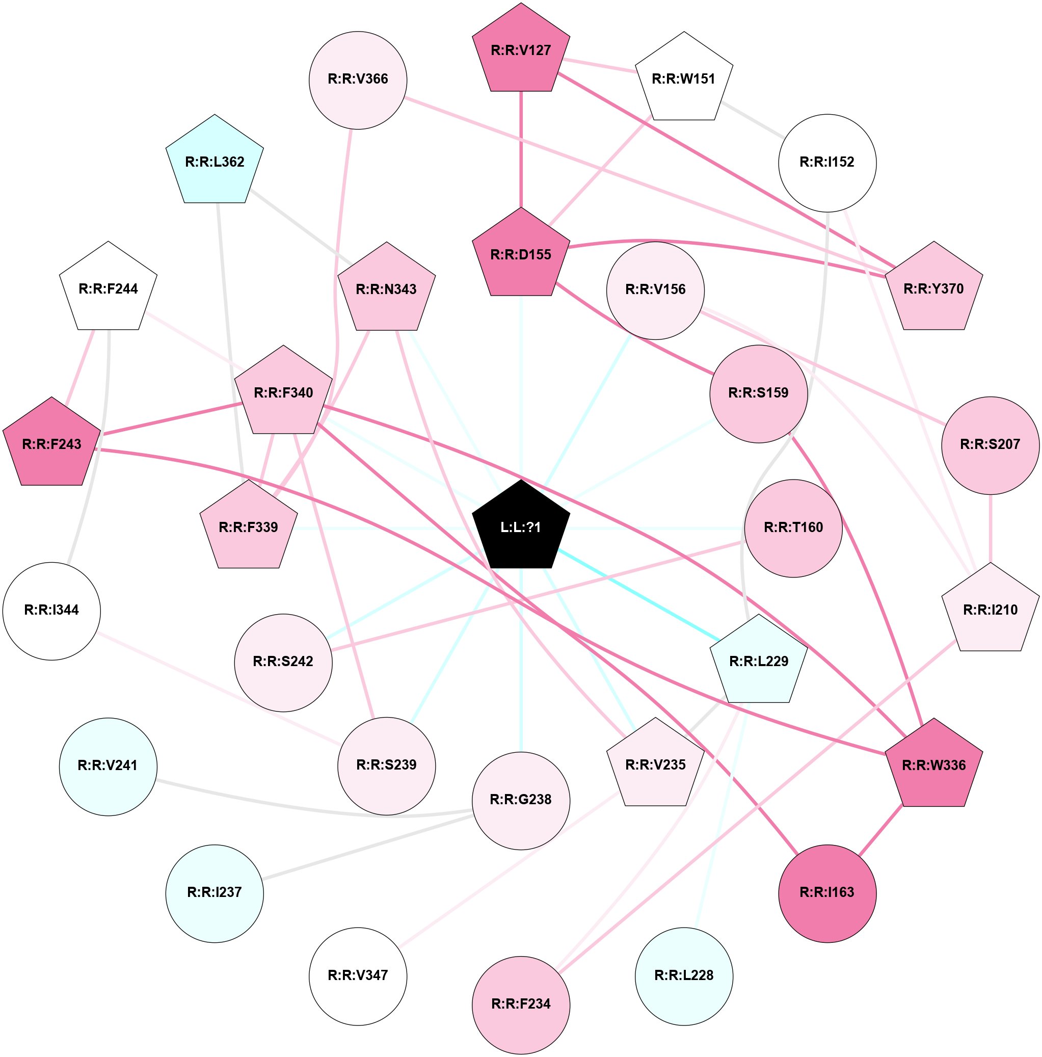 (Click to enlarge 🔍) | | Node1 | Node2 | LinkStrength | Comm | IsNode1Hub? | IsNode2Hub? | Node1Cons | Node2Cons | Node1Shell | Node2Shell | | L:L:?1 | R:R:W151 | 6.67 | 0 | Yes | Yes | 0 | 5 | 0 | 1 | | L:L:?1 | R:R:D155 | 12.49 | 0 | Yes | No | 0 | 8 | 0 | 1 | | L:L:?1 | R:R:V156 | 3.74 | 0 | Yes | No | 0 | 6 | 0 | 1 | | L:L:?1 | R:R:L228 | 6.95 | 0 | Yes | No | 0 | 4 | 0 | 1 | | L:L:?1 | R:R:F339 | 6.12 | 0 | Yes | Yes | 0 | 7 | 0 | 1 | | R:R:V127 | R:R:W151 | 3.68 | 1 | Yes | Yes | 8 | 5 | 2 | 1 | | R:R:D155 | R:R:V127 | 7.3 | 1 | No | Yes | 8 | 8 | 1 | 2 | | R:R:V127 | R:R:Y370 | 3.79 | 1 | Yes | Yes | 8 | 7 | 2 | 2 | | R:R:V130 | R:R:W151 | 13.48 | 0 | No | Yes | 4 | 5 | 2 | 1 | | R:R:W141 | R:R:W151 | 6.56 | 1 | Yes | Yes | 7 | 5 | 2 | 1 | | R:R:C227 | R:R:W141 | 14.37 | 1 | Yes | Yes | 9 | 7 | 2 | 2 | | R:R:C227 | R:R:W151 | 3.92 | 1 | Yes | Yes | 9 | 5 | 2 | 1 | | R:R:D155 | R:R:Y370 | 10.34 | 1 | No | Yes | 8 | 7 | 1 | 2 | | R:R:I210 | R:R:V156 | 4.61 | 0 | No | No | 6 | 6 | 2 | 1 | | R:R:K223 | R:R:L228 | 7.05 | 0 | No | No | 3 | 4 | 2 | 1 | | R:R:F339 | R:R:W336 | 7.02 | 1 | Yes | Yes | 7 | 8 | 1 | 2 | | R:R:W336 | R:R:Y370 | 3.86 | 0 | Yes | Yes | 8 | 7 | 2 | 2 | | R:R:F339 | R:R:N343 | 4.83 | 1 | Yes | No | 7 | 7 | 1 | 2 | | R:R:F339 | R:R:L362 | 7.31 | 1 | Yes | No | 7 | 3 | 1 | 2 | | R:R:F339 | R:R:V366 | 5.24 | 1 | Yes | No | 7 | 6 | 1 | 2 | | R:R:L362 | R:R:N343 | 6.87 | 1 | No | No | 3 | 7 | 2 | 2 | | R:R:V366 | R:R:Y370 | 6.31 | 1 | No | Yes | 6 | 7 | 2 | 2 | |