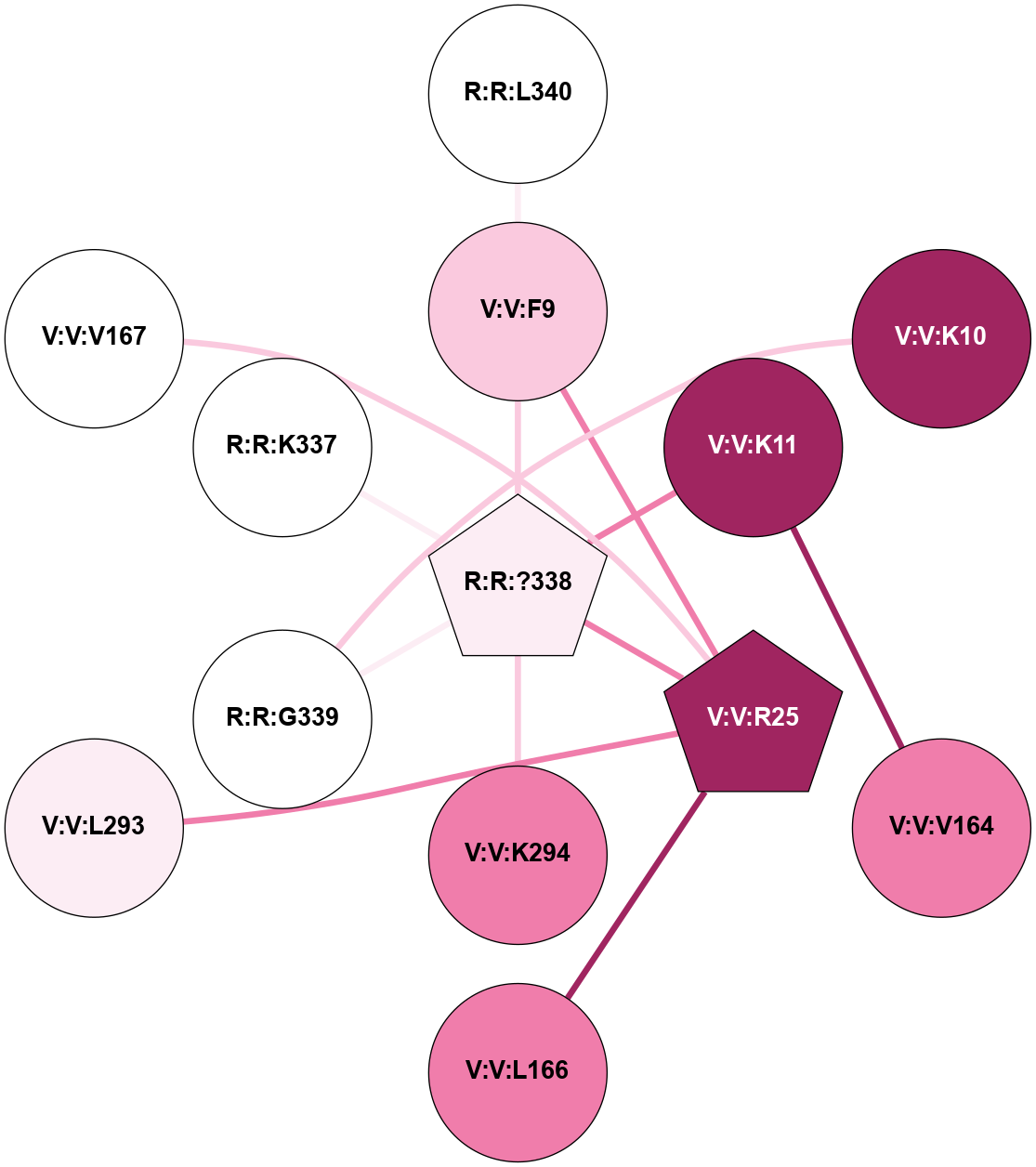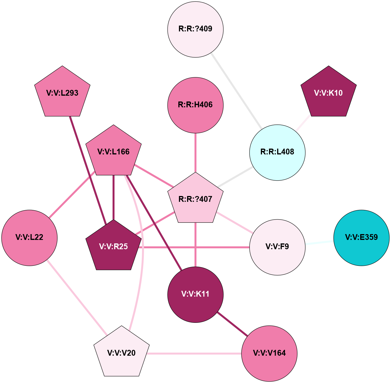 (Click to enlarge 🔍) | | Node1 | Node2 | LinkStrength | Comm | IsNode1Hub? | IsNode2Hub? | Node1Cons | Node2Cons | Node1Shell | Node2Shell | | R:R:?360 | V:V:K11 | 5.98 | 0 | Yes | Yes | 3 | 9 | 2 | 1 | | R:R:?362 | R:R:?363 | 26.03 | 0 | No | Yes | 5 | 4 | 1 | 0 | | R:R:?362 | V:V:H295 | 7.38 | 0 | No | No | 5 | 7 | 1 | 2 | | R:R:?363 | V:V:K11 | 19.65 | 11 | Yes | Yes | 4 | 9 | 0 | 1 | | R:R:?363 | V:V:R25 | 17.92 | 11 | Yes | Yes | 4 | 9 | 0 | 1 | | R:R:?363 | V:V:L166 | 5.67 | 11 | Yes | Yes | 4 | 8 | 0 | 1 | | R:R:?363 | V:V:K294 | 6.93 | 11 | Yes | No | 4 | 9 | 0 | 1 | | V:V:F9 | V:V:R25 | 10.69 | 0 | No | Yes | 6 | 9 | 2 | 1 | | V:V:K11 | V:V:V164 | 4.55 | 11 | Yes | No | 9 | 8 | 1 | 2 | | V:V:K11 | V:V:L166 | 9.87 | 11 | Yes | Yes | 9 | 8 | 1 | 1 | | V:V:L166 | V:V:L22 | 5.54 | 11 | Yes | No | 8 | 8 | 1 | 2 | | V:V:L166 | V:V:R25 | 7.29 | 11 | Yes | Yes | 8 | 9 | 1 | 1 | | V:V:L293 | V:V:R25 | 13.36 | 0 | No | Yes | 8 | 9 | 2 | 1 | |