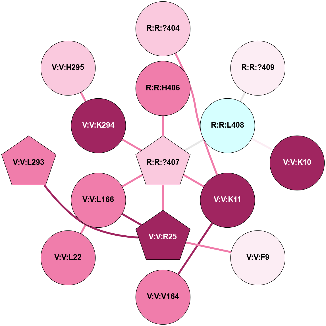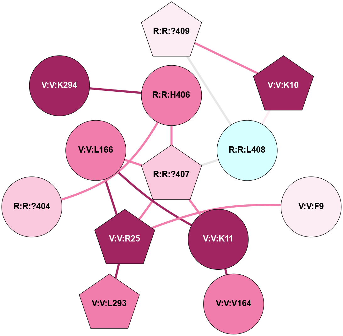 (Click to enlarge 🔍) | | Node1 | Node2 | LinkStrength | Comm | IsNode1Hub? | IsNode2Hub? | Node1Cons | Node2Cons | Node1Shell | Node2Shell | | R:R:?404 | V:V:K11 | 7.19 | 0 | No | No | 7 | 9 | 2 | 1 | | R:R:?407 | R:R:H406 | 4.22 | 9 | Yes | No | 7 | 8 | 0 | 1 | | R:R:?407 | R:R:L408 | 6.82 | 9 | Yes | No | 7 | 3 | 0 | 1 | | R:R:?407 | V:V:K11 | 19.68 | 9 | Yes | No | 7 | 9 | 0 | 1 | | R:R:?407 | V:V:R25 | 12.97 | 9 | Yes | Yes | 7 | 9 | 0 | 1 | | R:R:?407 | V:V:L166 | 6.82 | 9 | Yes | No | 7 | 8 | 0 | 1 | | R:R:?407 | V:V:K294 | 6.95 | 9 | Yes | No | 7 | 9 | 0 | 1 | | R:R:?409 | R:R:L408 | 3.53 | 19 | No | No | 6 | 3 | 2 | 1 | | R:R:L408 | V:V:K10 | 7.05 | 0 | No | No | 3 | 9 | 1 | 2 | | V:V:F9 | V:V:R25 | 8.55 | 0 | No | Yes | 6 | 9 | 2 | 1 | | V:V:K11 | V:V:V164 | 4.55 | 0 | No | No | 9 | 8 | 1 | 2 | | V:V:L166 | V:V:L22 | 4.15 | 9 | No | No | 8 | 8 | 1 | 2 | | V:V:L166 | V:V:R25 | 7.29 | 9 | No | Yes | 8 | 9 | 1 | 1 | | V:V:L293 | V:V:R25 | 4.86 | 9 | Yes | Yes | 8 | 9 | 2 | 1 | | V:V:H295 | V:V:K294 | 6.55 | 0 | No | No | 7 | 9 | 2 | 1 | |