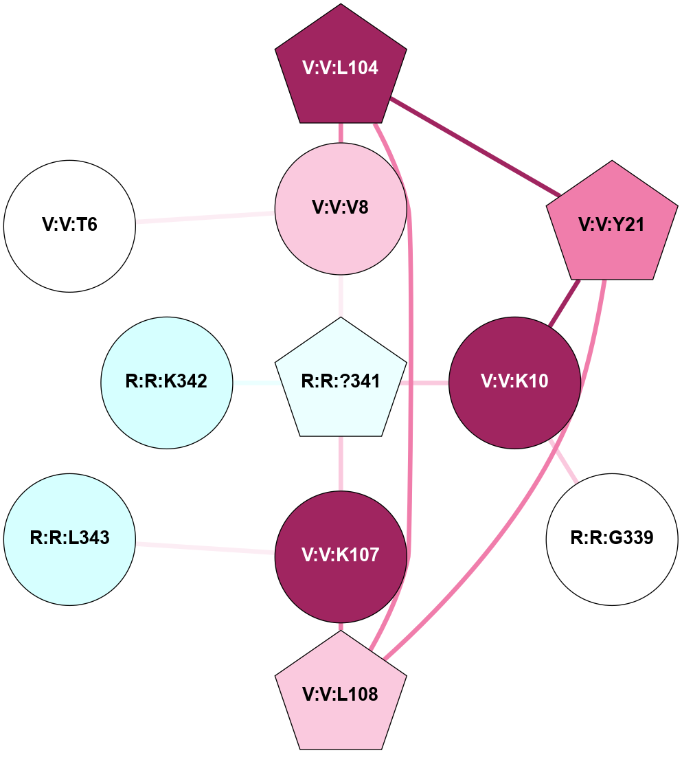 (Click to enlarge 🔍) | | Node1 | Node2 | LinkStrength | Comm | IsNode1Hub? | IsNode2Hub? | Node1Cons | Node2Cons | Node1Shell | Node2Shell | | V:V:L104 | V:V:V8 | 2.98 | 4 | Yes | No | 9 | 7 | 2 | 1 | | R:R:?341 | V:V:V8 | 6.12 | 0 | Yes | No | 4 | 7 | 0 | 1 | | V:V:K10 | V:V:Y21 | 4.78 | 0 | No | Yes | 9 | 8 | 1 | 2 | | R:R:G339 | V:V:K10 | 3.49 | 0 | No | No | 5 | 9 | 2 | 1 | | R:R:?341 | V:V:K10 | 12.74 | 0 | Yes | No | 4 | 9 | 0 | 1 | | V:V:L104 | V:V:Y21 | 8.21 | 4 | Yes | Yes | 9 | 8 | 2 | 2 | | V:V:L108 | V:V:Y21 | 5.86 | 4 | Yes | Yes | 7 | 8 | 2 | 2 | | V:V:L104 | V:V:L108 | 4.15 | 4 | Yes | Yes | 9 | 7 | 2 | 2 | | V:V:K107 | V:V:L108 | 7.05 | 0 | No | Yes | 9 | 7 | 1 | 2 | | R:R:?341 | V:V:K107 | 11.58 | 0 | Yes | No | 4 | 9 | 0 | 1 | | R:R:L343 | V:V:K107 | 11.28 | 0 | No | No | 3 | 9 | 2 | 1 | | R:R:?341 | R:R:K342 | 4.63 | 0 | Yes | No | 4 | 3 | 0 | 1 | | V:V:T6 | V:V:V8 | 1.59 | 0 | No | No | 5 | 7 | 2 | 1 | |