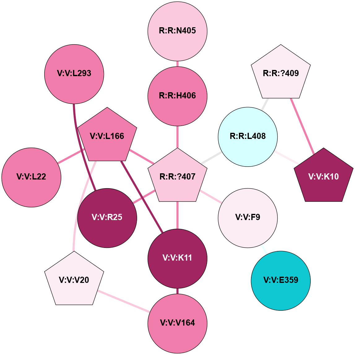 (Click to enlarge 🔍) | | Node1 | Node2 | LinkStrength | Comm | IsNode1Hub? | IsNode2Hub? | Node1Cons | Node2Cons | Node1Shell | Node2Shell | | R:R:?362 | R:R:?363 | 26.03 | 0 | No | Yes | 5 | 4 | 0 | 1 | | R:R:?362 | V:V:H295 | 7.38 | 0 | No | No | 5 | 7 | 0 | 1 | | R:R:?363 | V:V:K11 | 19.65 | 11 | Yes | Yes | 4 | 9 | 1 | 2 | | R:R:?363 | V:V:R25 | 17.92 | 11 | Yes | Yes | 4 | 9 | 1 | 2 | | R:R:?363 | V:V:L166 | 5.67 | 11 | Yes | Yes | 4 | 8 | 1 | 2 | | R:R:?363 | V:V:K294 | 6.93 | 11 | Yes | No | 4 | 9 | 1 | 2 | | V:V:K11 | V:V:L166 | 9.87 | 11 | Yes | Yes | 9 | 8 | 2 | 2 | | V:V:L166 | V:V:R25 | 7.29 | 11 | Yes | Yes | 8 | 9 | 2 | 2 | |