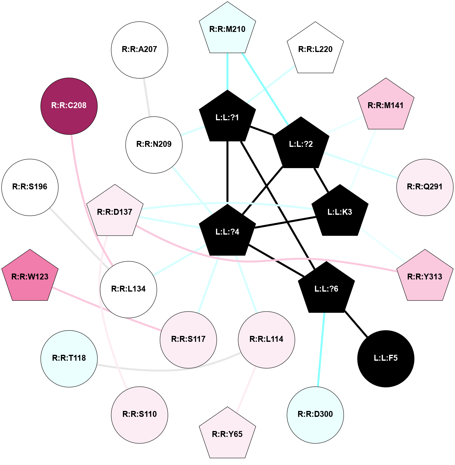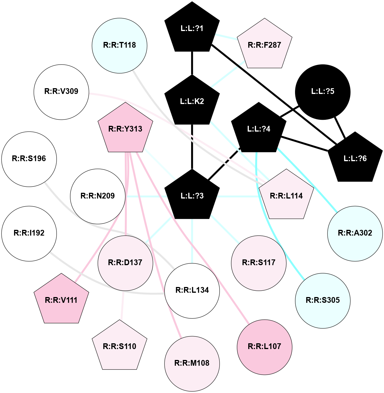 (Click to enlarge 🔍) | | Node1 | Node2 | LinkStrength | Comm | IsNode1Hub? | IsNode2Hub? | Node1Cons | Node2Cons | Node1Shell | Node2Shell | | L:L:?1 | L:L:K2 | 26.86 | 2 | Yes | Yes | 0 | 0 | 2 | 1 | | L:L:?1 | L:L:?6 | 16.88 | 2 | Yes | Yes | 0 | 0 | 2 | 2 | | L:L:?1 | R:R:F287 | 7.73 | 2 | Yes | Yes | 0 | 6 | 2 | 2 | | L:L:?3 | L:L:K2 | 19.67 | 2 | Yes | Yes | 0 | 0 | 0 | 1 | | L:L:K2 | R:R:L114 | 4.23 | 2 | Yes | Yes | 0 | 6 | 1 | 1 | | L:L:K2 | R:R:F287 | 4.96 | 2 | Yes | Yes | 0 | 6 | 1 | 2 | | L:L:?3 | L:L:?4 | 16.98 | 2 | Yes | Yes | 0 | 0 | 0 | 1 | | L:L:?3 | R:R:L114 | 28.39 | 2 | Yes | Yes | 0 | 6 | 0 | 1 | | L:L:?3 | R:R:S117 | 8.62 | 2 | Yes | No | 0 | 6 | 0 | 1 | | L:L:?3 | R:R:L134 | 4.54 | 2 | Yes | No | 0 | 5 | 0 | 1 | | L:L:?3 | R:R:D137 | 13.36 | 2 | Yes | No | 0 | 6 | 0 | 1 | | L:L:?3 | R:R:N209 | 3.38 | 2 | Yes | No | 0 | 5 | 0 | 1 | | L:L:?3 | R:R:Y313 | 3.85 | 2 | Yes | Yes | 0 | 7 | 0 | 1 | | L:L:?4 | L:L:?5 | 57.37 | 2 | Yes | No | 0 | 0 | 1 | 2 | | L:L:?4 | L:L:?6 | 10.57 | 2 | Yes | Yes | 0 | 0 | 1 | 2 | | L:L:?4 | R:R:A302 | 7.44 | 2 | Yes | No | 0 | 4 | 1 | 2 | | L:L:?4 | R:R:S305 | 10.63 | 2 | Yes | No | 0 | 4 | 1 | 2 | | L:L:?5 | L:L:?6 | 24.21 | 2 | No | Yes | 0 | 0 | 2 | 2 | | R:R:L107 | R:R:Y313 | 3.52 | 0 | No | Yes | 7 | 7 | 2 | 1 | | R:R:M108 | R:R:Y313 | 3.59 | 2 | No | Yes | 6 | 7 | 2 | 1 | | R:R:D137 | R:R:S110 | 8.83 | 2 | No | Yes | 6 | 6 | 1 | 2 | | R:R:V111 | R:R:Y313 | 3.79 | 0 | Yes | Yes | 7 | 7 | 2 | 1 | | R:R:I192 | R:R:L134 | 4.28 | 0 | No | No | 5 | 5 | 2 | 1 | | R:R:D137 | R:R:Y313 | 4.6 | 2 | No | Yes | 6 | 7 | 1 | 1 | | R:R:L134 | R:R:S196 | 3 | 0 | No | No | 5 | 5 | 1 | 2 | | R:R:L114 | R:R:V309 | 2.98 | 2 | Yes | No | 6 | 5 | 1 | 2 | | R:R:L114 | R:R:T118 | 2.95 | 2 | Yes | No | 6 | 4 | 1 | 2 | |