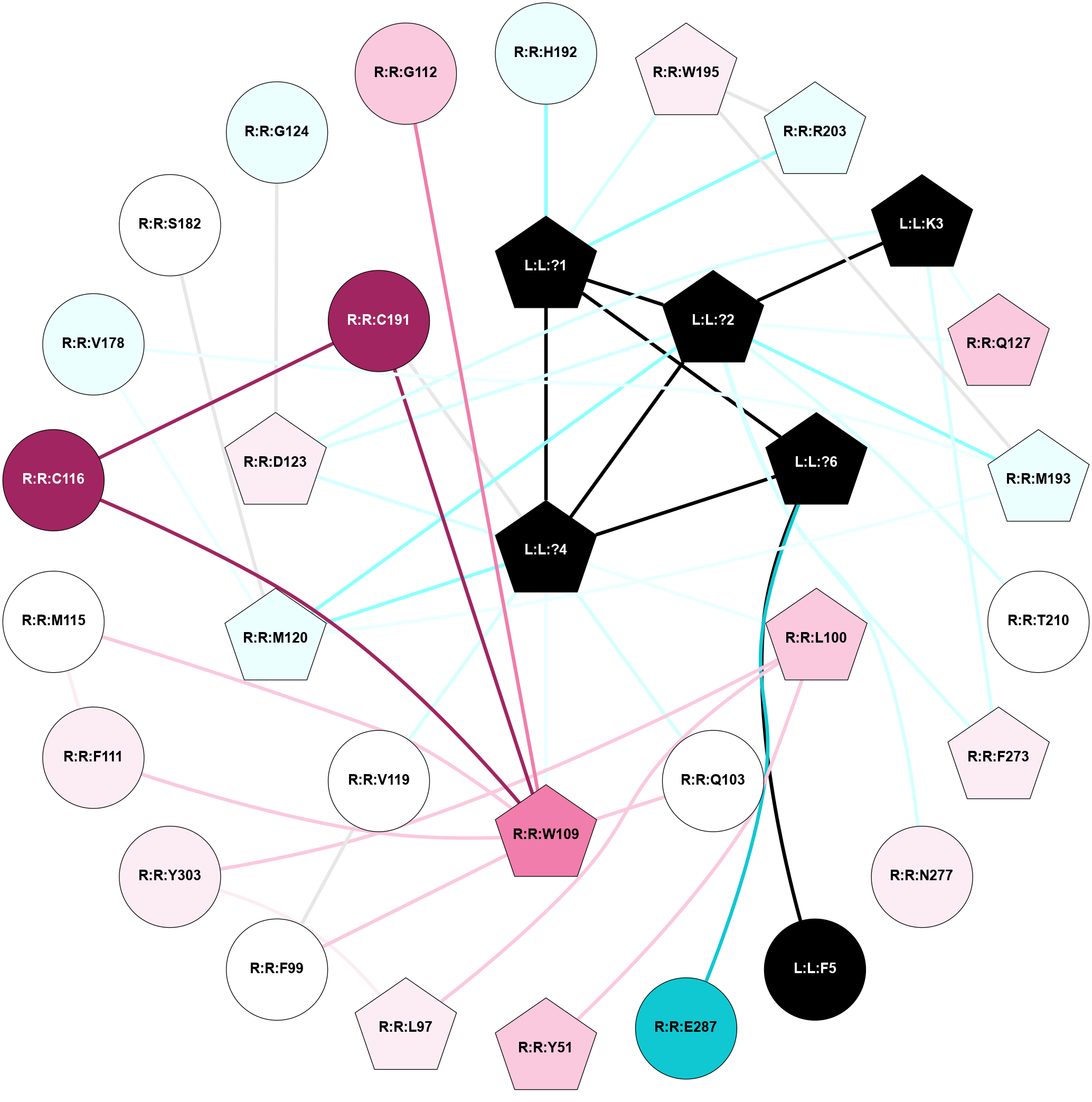(Click to enlarge 🔍) | | Node1 | Node2 | LinkStrength | Comm | IsNode1Hub? | IsNode2Hub? | Node1Cons | Node2Cons | Node1Shell | Node2Shell | | L:L:?1 | L:L:?2 | 13.32 | 2 | Yes | Yes | 0 | 0 | 1 | 1 | | L:L:?1 | L:L:?4 | 9.18 | 2 | Yes | Yes | 0 | 0 | 1 | 0 | | L:L:?1 | L:L:?6 | 26.31 | 2 | Yes | Yes | 0 | 0 | 1 | 1 | | L:L:?1 | R:R:H192 | 6.24 | 2 | Yes | No | 0 | 4 | 1 | 2 | | L:L:?1 | R:R:W195 | 11.97 | 2 | Yes | Yes | 0 | 6 | 1 | 2 | | L:L:?1 | R:R:R203 | 11.79 | 2 | Yes | Yes | 0 | 4 | 1 | 2 | | L:L:?2 | L:L:K3 | 22.39 | 2 | Yes | Yes | 0 | 0 | 1 | 2 | | L:L:?2 | L:L:?4 | 4.51 | 2 | Yes | Yes | 0 | 0 | 1 | 0 | | L:L:?2 | R:R:M120 | 3.37 | 2 | Yes | Yes | 0 | 4 | 1 | 1 | | L:L:?2 | R:R:D123 | 3.23 | 2 | Yes | Yes | 0 | 6 | 1 | 1 | | L:L:?2 | R:R:Q127 | 6.34 | 2 | Yes | Yes | 0 | 7 | 1 | 2 | | L:L:?2 | R:R:M193 | 6.73 | 2 | Yes | Yes | 0 | 4 | 1 | 2 | | L:L:?2 | R:R:T210 | 4.68 | 2 | Yes | No | 0 | 5 | 1 | 2 | | L:L:?2 | R:R:F273 | 7.73 | 2 | Yes | Yes | 0 | 6 | 1 | 2 | | L:L:?2 | R:R:N277 | 3.27 | 2 | Yes | No | 0 | 6 | 1 | 2 | | L:L:K3 | R:R:D123 | 12.44 | 2 | Yes | Yes | 0 | 6 | 2 | 1 | | L:L:K3 | R:R:Q127 | 4.07 | 2 | Yes | Yes | 0 | 7 | 2 | 2 | | L:L:K3 | R:R:F273 | 6.2 | 2 | Yes | Yes | 0 | 6 | 2 | 2 | | L:L:?4 | L:L:?6 | 9.61 | 2 | Yes | Yes | 0 | 0 | 0 | 1 | | L:L:?4 | R:R:L100 | 14.76 | 2 | Yes | Yes | 0 | 7 | 0 | 1 | | L:L:?4 | R:R:Q103 | 9.83 | 2 | Yes | No | 0 | 5 | 0 | 1 | | L:L:?4 | R:R:W109 | 4.67 | 2 | Yes | Yes | 0 | 8 | 0 | 1 | | L:L:?4 | R:R:V119 | 13.44 | 2 | Yes | No | 0 | 5 | 0 | 1 | | L:L:?4 | R:R:M120 | 4.64 | 2 | Yes | Yes | 0 | 4 | 0 | 1 | | L:L:?4 | R:R:D123 | 6.68 | 2 | Yes | Yes | 0 | 6 | 0 | 1 | | L:L:?4 | R:R:C191 | 2.6 | 2 | Yes | No | 0 | 9 | 0 | 1 | | L:L:?6 | L:L:F5 | 26.35 | 2 | Yes | No | 0 | 0 | 1 | 2 | | L:L:?6 | R:R:E287 | 6.23 | 2 | Yes | No | 0 | 1 | 1 | 2 | | R:R:L100 | R:R:Y51 | 3.52 | 2 | Yes | Yes | 7 | 7 | 1 | 2 | | R:R:L100 | R:R:L97 | 4.15 | 2 | Yes | Yes | 7 | 6 | 1 | 2 | | R:R:L97 | R:R:Y303 | 9.38 | 2 | Yes | No | 6 | 6 | 2 | 2 | | R:R:F99 | R:R:W109 | 5.01 | 0 | No | Yes | 5 | 8 | 2 | 1 | | R:R:F99 | R:R:V119 | 5.24 | 0 | No | No | 5 | 5 | 2 | 1 | | R:R:L100 | R:R:Y303 | 3.52 | 2 | Yes | No | 7 | 6 | 1 | 2 | | R:R:Q103 | R:R:W109 | 4.38 | 2 | No | Yes | 5 | 8 | 1 | 1 | | R:R:F111 | R:R:W109 | 10.02 | 2 | No | Yes | 6 | 8 | 2 | 1 | | R:R:M115 | R:R:W109 | 3.49 | 2 | No | Yes | 5 | 8 | 2 | 1 | | R:R:C116 | R:R:W109 | 7.84 | 2 | No | Yes | 9 | 8 | 2 | 1 | | R:R:C191 | R:R:W109 | 11.75 | 2 | No | Yes | 9 | 8 | 1 | 1 | | R:R:F111 | R:R:M115 | 3.73 | 2 | No | No | 6 | 5 | 2 | 2 | | R:R:C116 | R:R:C191 | 7.28 | 2 | No | No | 9 | 9 | 2 | 1 | | R:R:M120 | R:R:V178 | 3.04 | 2 | Yes | No | 4 | 4 | 1 | 2 | | R:R:M120 | R:R:S182 | 6.13 | 2 | Yes | No | 4 | 5 | 1 | 2 | | R:R:M120 | R:R:M193 | 8.66 | 2 | Yes | Yes | 4 | 4 | 1 | 2 | | R:R:D123 | R:R:G124 | 5.03 | 2 | Yes | No | 6 | 4 | 1 | 2 | | R:R:M193 | R:R:V178 | 9.13 | 2 | Yes | No | 4 | 4 | 2 | 2 | | R:R:M193 | R:R:W195 | 5.82 | 2 | Yes | Yes | 4 | 6 | 2 | 2 | | R:R:R203 | R:R:W195 | 8 | 2 | Yes | Yes | 4 | 6 | 2 | 2 | | R:R:G112 | R:R:W109 | 1.41 | 0 | No | Yes | 7 | 8 | 2 | 1 | |