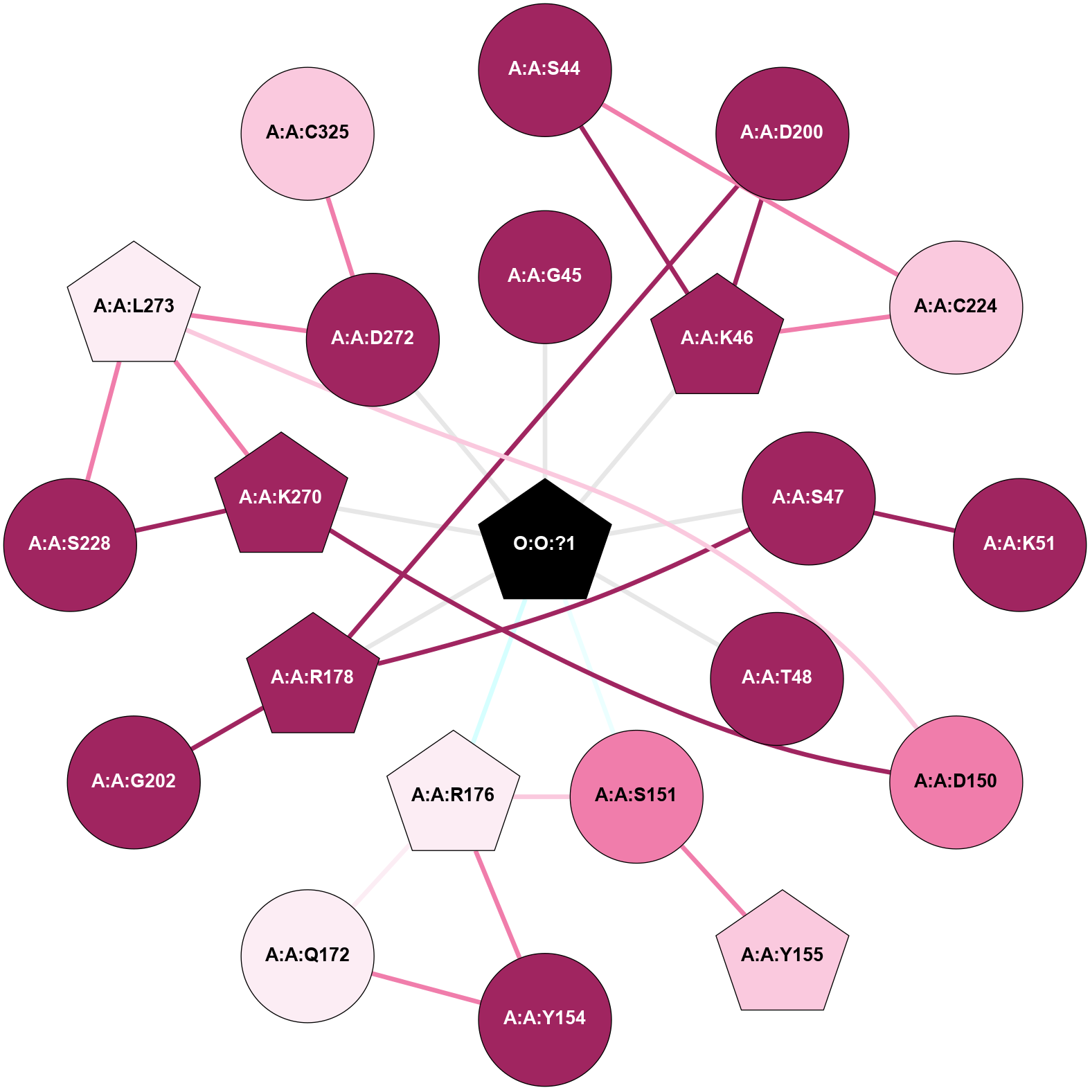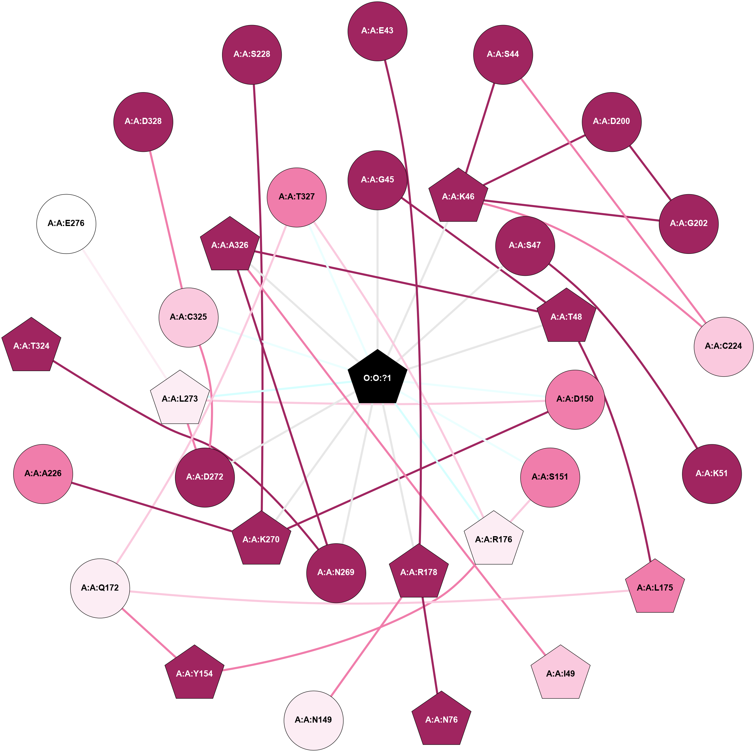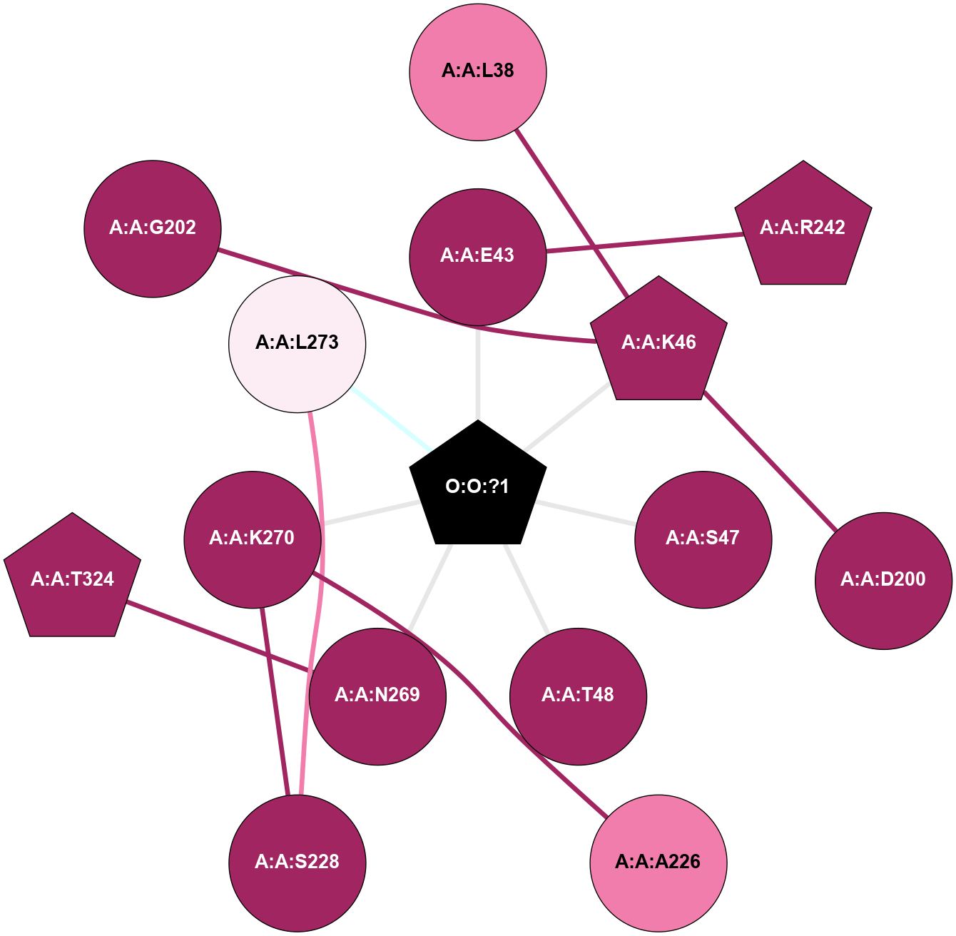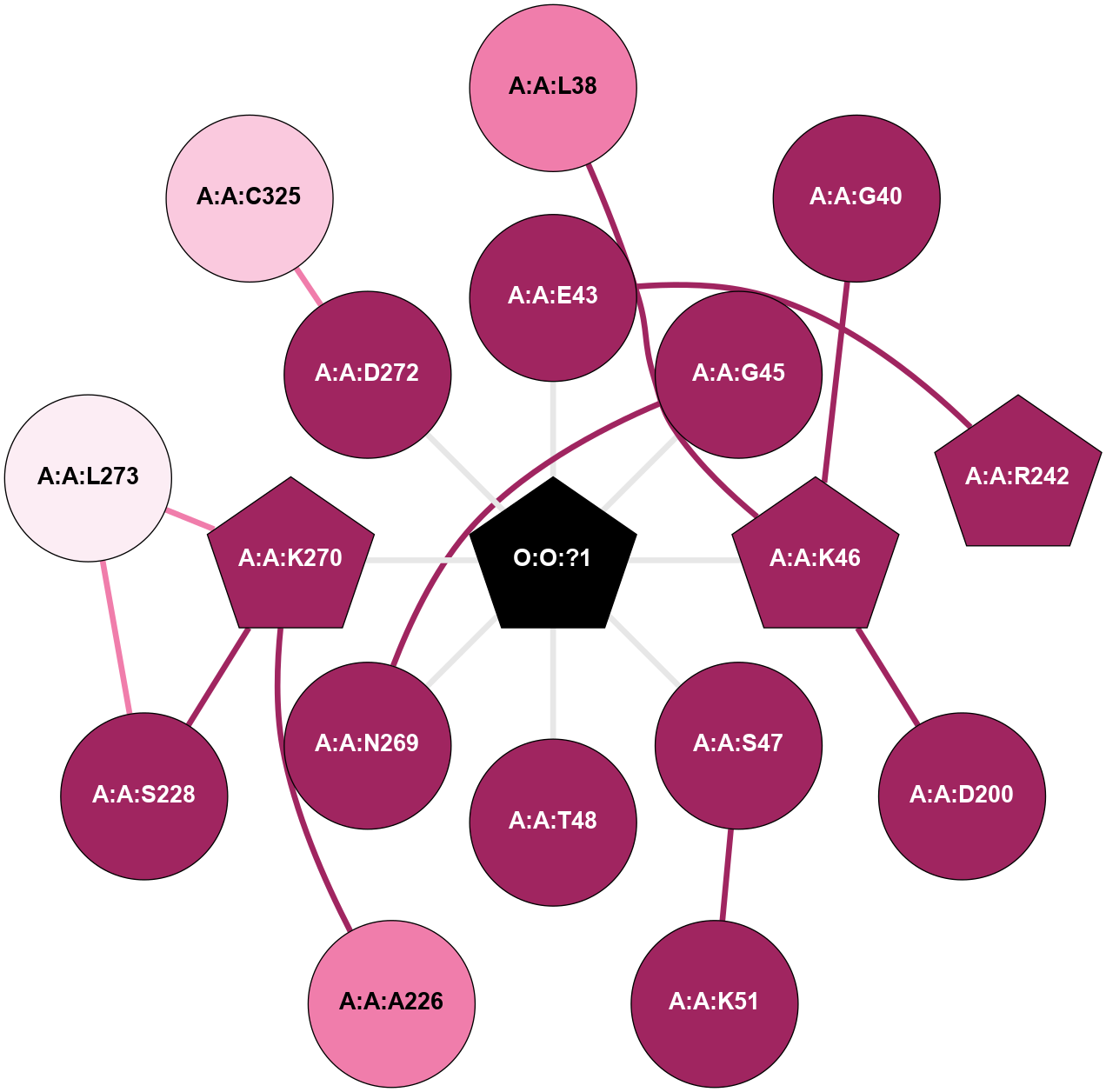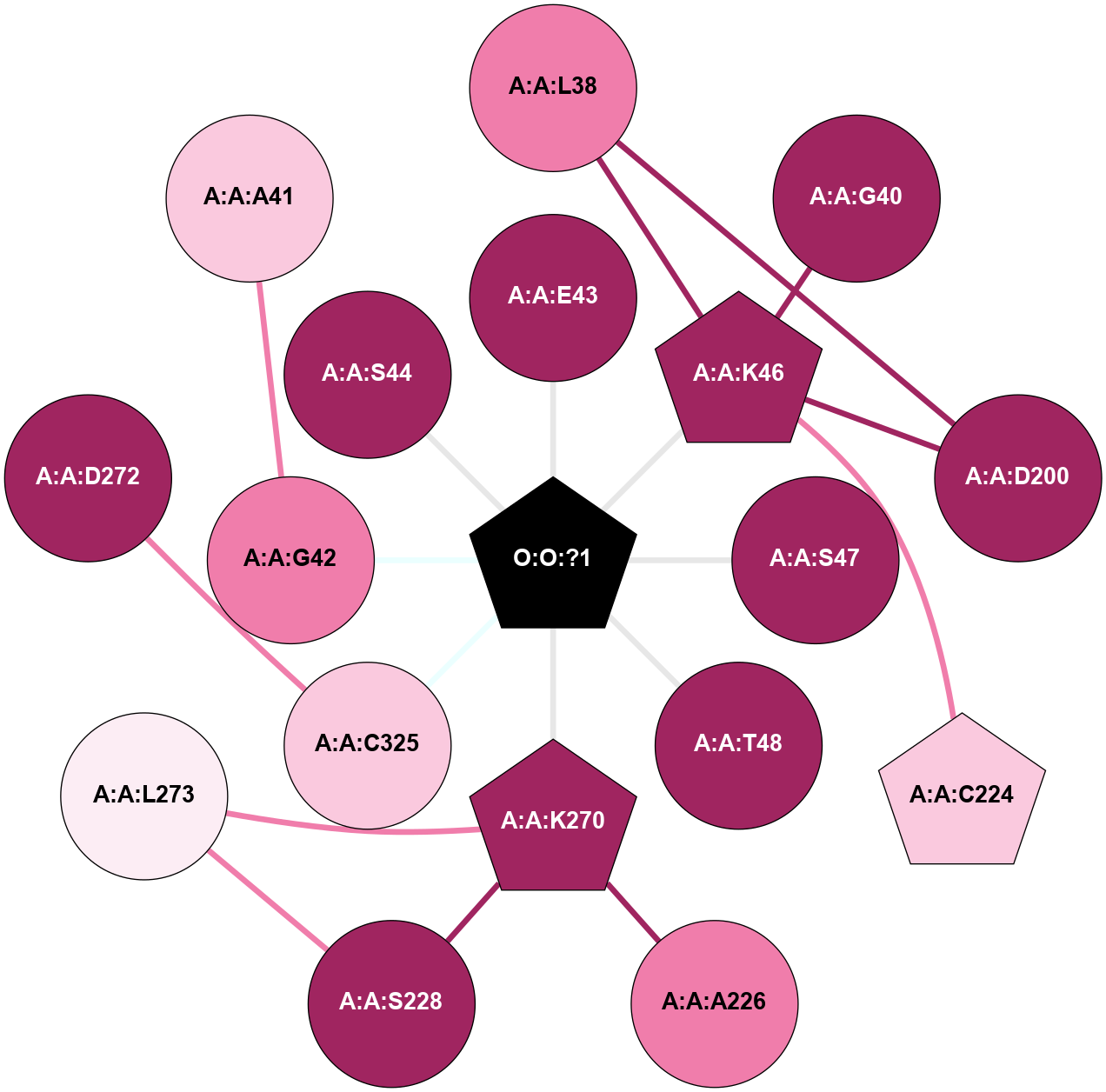 (Click to enlarge 🔍) | | Node1 | Node2 | LinkStrength | Comm | IsNode1Hub? | IsNode2Hub? | Node1Cons | Node2Cons | Node1Shell | Node2Shell | | A:A:K46 | A:A:L38 | 4.23 | 0 | Yes | No | 9 | 8 | 1 | 2 | | A:A:E43 | A:A:R242 | 9.3 | 0 | No | Yes | 9 | 9 | 1 | 2 | | A:A:E43 | O:O:?1 | 4.12 | 0 | No | Yes | 9 | 0 | 1 | 0 | | A:A:D200 | A:A:K46 | 6.91 | 0 | No | Yes | 9 | 9 | 2 | 1 | | A:A:K46 | O:O:?1 | 7.02 | 0 | Yes | Yes | 9 | 0 | 1 | 0 | | A:A:S47 | O:O:?1 | 9.35 | 0 | No | Yes | 9 | 0 | 1 | 0 | | A:A:T48 | O:O:?1 | 13.76 | 0 | No | Yes | 9 | 0 | 1 | 0 | | A:A:A226 | A:A:K270 | 3.21 | 0 | No | No | 8 | 9 | 2 | 1 | | A:A:K270 | A:A:S228 | 6.12 | 0 | No | No | 9 | 9 | 1 | 2 | | A:A:L273 | A:A:S228 | 6.01 | 0 | No | No | 6 | 9 | 1 | 2 | | A:A:N269 | A:A:T324 | 2.92 | 0 | No | Yes | 9 | 9 | 1 | 2 | | A:A:N269 | O:O:?1 | 5.13 | 0 | No | Yes | 9 | 0 | 1 | 0 | | A:A:K270 | O:O:?1 | 17.55 | 0 | No | Yes | 9 | 0 | 1 | 0 | | A:A:L273 | O:O:?1 | 8.61 | 0 | No | Yes | 6 | 0 | 1 | 0 | | A:A:G202 | A:A:K46 | 1.74 | 0 | No | Yes | 9 | 9 | 2 | 1 | |