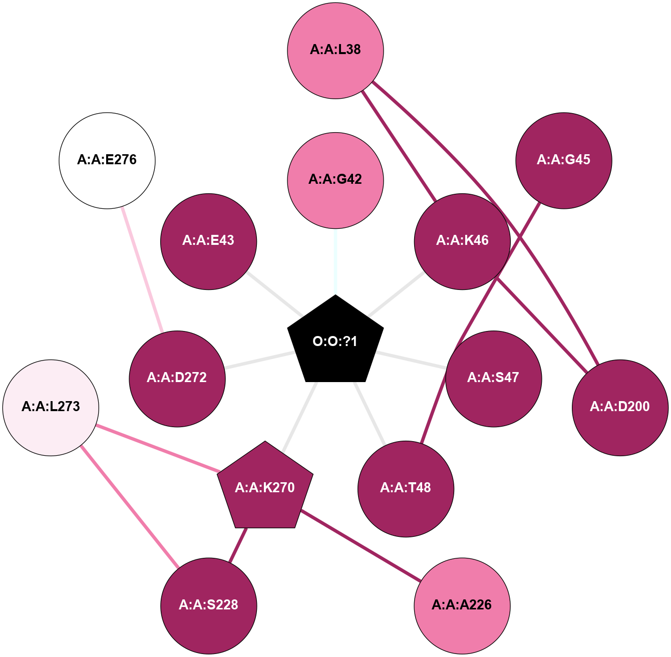 (Click to enlarge 🔍) | | Node1 | Node2 | LinkStrength | Comm | IsNode1Hub? | IsNode2Hub? | Node1Cons | Node2Cons | Node1Shell | Node2Shell | | A:A:K46 | A:A:L38 | 5.64 | 17 | No | No | 9 | 8 | 1 | 2 | | A:A:D200 | A:A:L38 | 5.43 | 17 | No | No | 9 | 8 | 2 | 2 | | A:A:G42 | O:O:?1 | 4.26 | 0 | No | Yes | 8 | 0 | 1 | 0 | | A:A:G45 | A:A:T48 | 3.64 | 0 | No | No | 9 | 9 | 2 | 1 | | A:A:D200 | A:A:K46 | 5.53 | 17 | No | No | 9 | 9 | 2 | 1 | | A:A:K46 | O:O:?1 | 10.53 | 17 | No | Yes | 9 | 0 | 1 | 0 | | A:A:S47 | O:O:?1 | 5.61 | 0 | No | Yes | 9 | 0 | 1 | 0 | | A:A:T48 | O:O:?1 | 9.17 | 0 | No | Yes | 9 | 0 | 1 | 0 | | A:A:A226 | A:A:K270 | 4.82 | 0 | No | Yes | 8 | 9 | 2 | 1 | | A:A:K270 | A:A:S228 | 6.12 | 11 | Yes | No | 9 | 9 | 1 | 2 | | A:A:L273 | A:A:S228 | 7.51 | 11 | No | No | 6 | 9 | 2 | 2 | | A:A:K270 | A:A:L273 | 7.05 | 11 | Yes | No | 9 | 6 | 1 | 2 | | A:A:K270 | O:O:?1 | 15.8 | 11 | Yes | Yes | 9 | 0 | 1 | 0 | | A:A:D272 | A:A:E276 | 6.5 | 0 | No | No | 9 | 5 | 1 | 2 | | A:A:D272 | O:O:?1 | 5.07 | 0 | No | Yes | 9 | 0 | 1 | 0 | | A:A:E43 | O:O:?1 | 2.47 | 0 | No | Yes | 9 | 0 | 1 | 0 | |