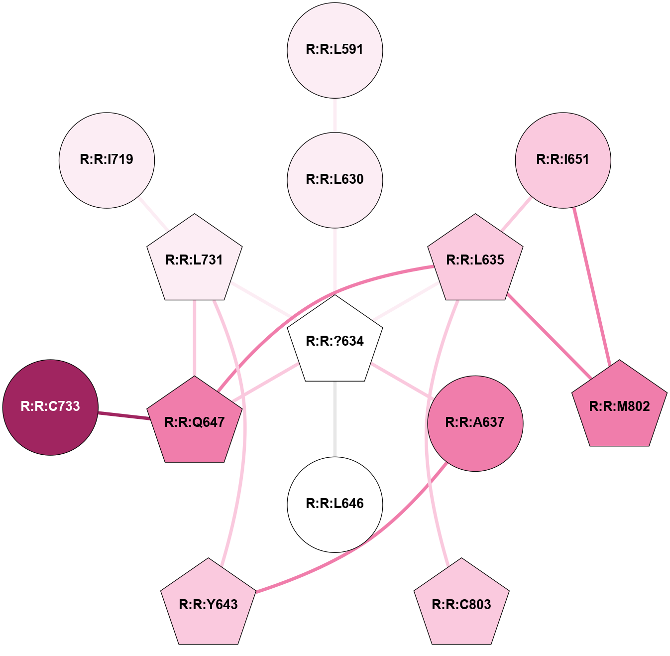 (Click to enlarge 🔍) | | Node1 | Node2 | LinkStrength | Comm | IsNode1Hub? | IsNode2Hub? | Node1Cons | Node2Cons | Node1Shell | Node2Shell | | R:R:L591 | R:R:L630 | 4.15 | 0 | No | No | 6 | 6 | 2 | 1 | | R:R:C626 | R:R:L630 | 3.17 | 0 | No | No | 4 | 6 | 2 | 1 | | R:R:?634 | R:R:L630 | 3.54 | 2 | Yes | No | 5 | 6 | 0 | 1 | | R:R:?634 | R:R:L635 | 3.54 | 2 | Yes | Yes | 5 | 7 | 0 | 1 | | R:R:?634 | R:R:A637 | 4.03 | 2 | Yes | No | 5 | 8 | 0 | 1 | | R:R:?634 | R:R:Y643 | 3 | 2 | Yes | Yes | 5 | 7 | 0 | 1 | | R:R:?634 | R:R:L646 | 9.43 | 2 | Yes | No | 5 | 5 | 0 | 1 | | R:R:?634 | R:R:Q647 | 9.07 | 2 | Yes | Yes | 5 | 8 | 0 | 1 | | R:R:?634 | R:R:L731 | 3.54 | 2 | Yes | No | 5 | 6 | 0 | 1 | | R:R:L635 | R:R:Q647 | 11.98 | 2 | Yes | Yes | 7 | 8 | 1 | 1 | | R:R:I651 | R:R:L635 | 4.28 | 0 | Yes | Yes | 7 | 7 | 2 | 1 | | R:R:C803 | R:R:L635 | 4.76 | 0 | No | Yes | 7 | 7 | 2 | 1 | | R:R:A637 | R:R:Y643 | 5.34 | 2 | No | Yes | 8 | 7 | 1 | 1 | | R:R:K640 | R:R:Y643 | 4.78 | 0 | No | Yes | 5 | 7 | 2 | 1 | | R:R:L646 | R:R:Y643 | 4.69 | 2 | No | Yes | 5 | 7 | 1 | 1 | | R:R:L731 | R:R:Q647 | 3.99 | 2 | No | Yes | 6 | 8 | 1 | 1 | | R:R:C733 | R:R:Q647 | 6.1 | 0 | No | Yes | 9 | 8 | 2 | 1 | | R:R:L731 | R:R:P639 | 1.64 | 2 | No | No | 6 | 9 | 1 | 2 | |