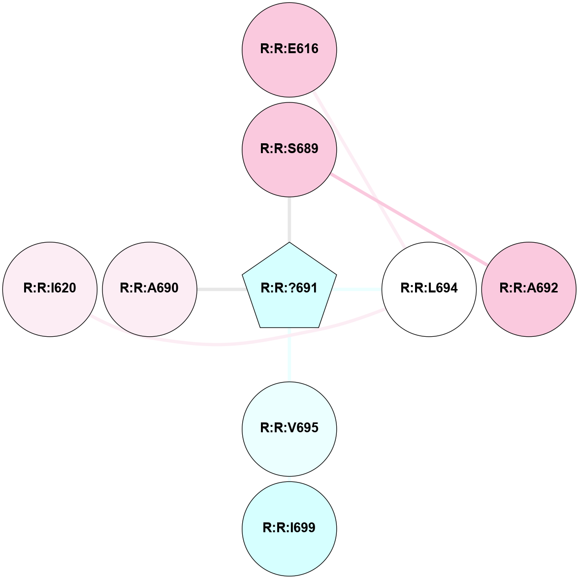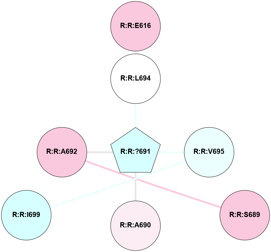 (Click to enlarge 🔍) | | Node1 | Node2 | LinkStrength | Comm | IsNode1Hub? | IsNode2Hub? | Node1Cons | Node2Cons | Node1Shell | Node2Shell | | R:R:E616 | R:R:L694 | 5.3 | 0 | No | No | 7 | 5 | 2 | 1 | | R:R:A692 | R:R:S689 | 3.42 | 0 | No | No | 7 | 7 | 1 | 2 | | R:R:?691 | R:R:L694 | 3.54 | 0 | Yes | No | 3 | 5 | 0 | 1 | | R:R:?691 | R:R:V695 | 3.81 | 0 | Yes | No | 3 | 4 | 0 | 1 | | R:R:I699 | R:R:V695 | 3.07 | 0 | No | No | 3 | 4 | 2 | 1 | | R:R:?691 | R:R:A690 | 2.69 | 0 | Yes | No | 3 | 6 | 0 | 1 | | R:R:?691 | R:R:A692 | 2.69 | 0 | Yes | No | 3 | 7 | 0 | 1 | |